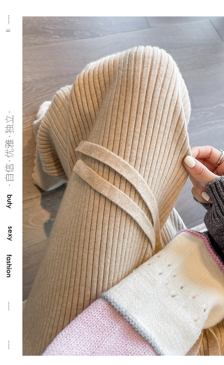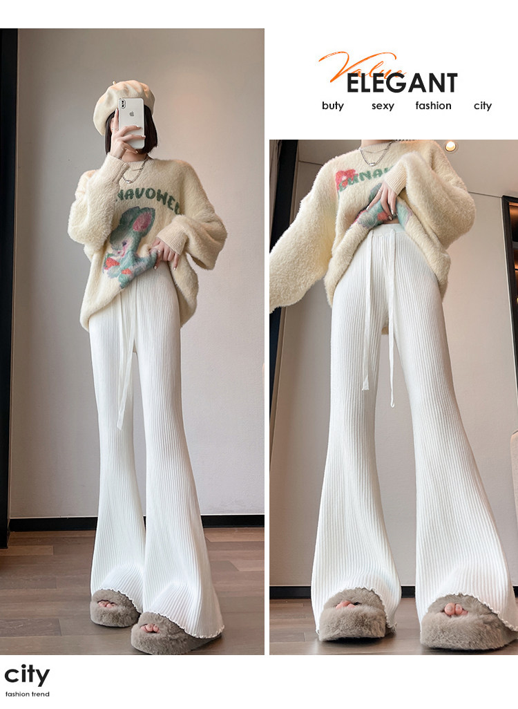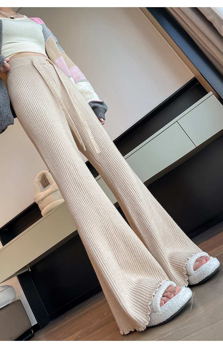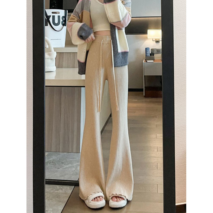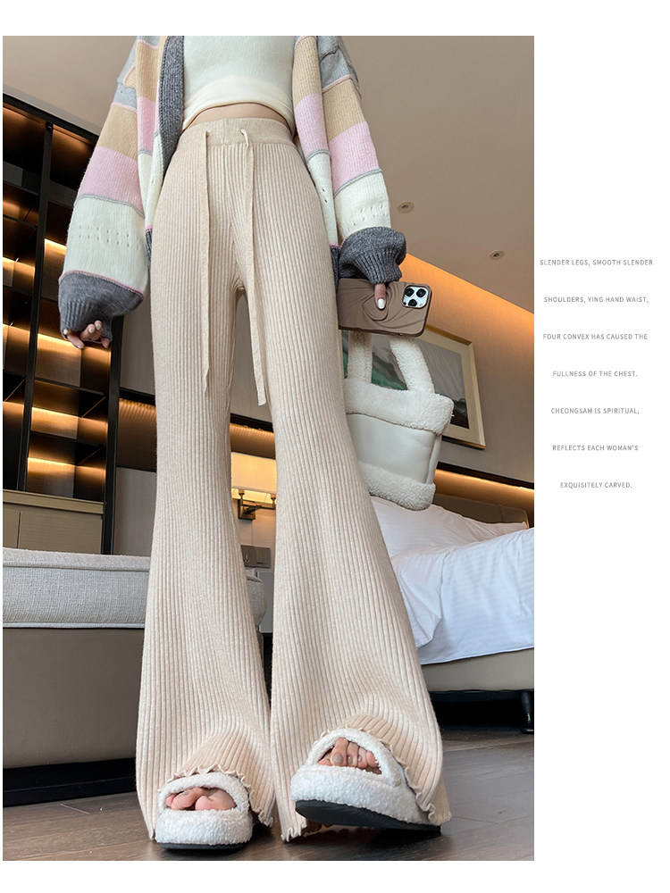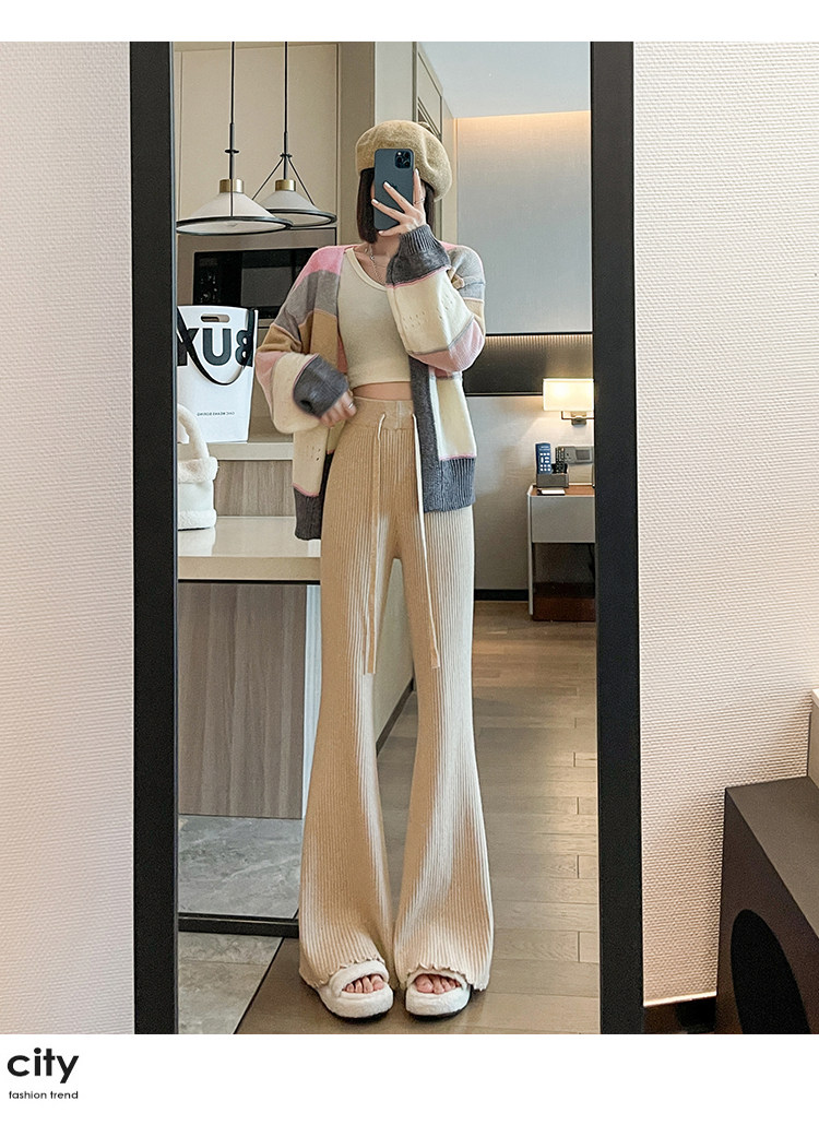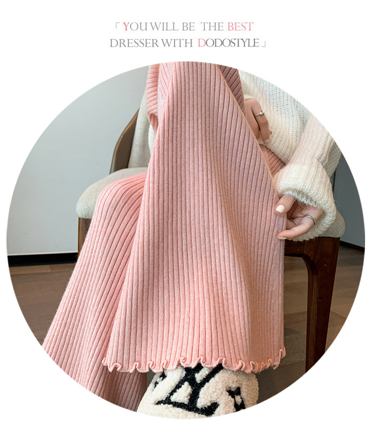 軟糯坑條針織褲子女秋冬加厚高腰顯瘦濶腿褲寬鬆休閒垂感微喇叭褲