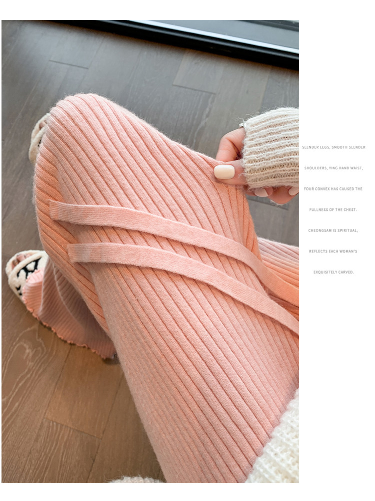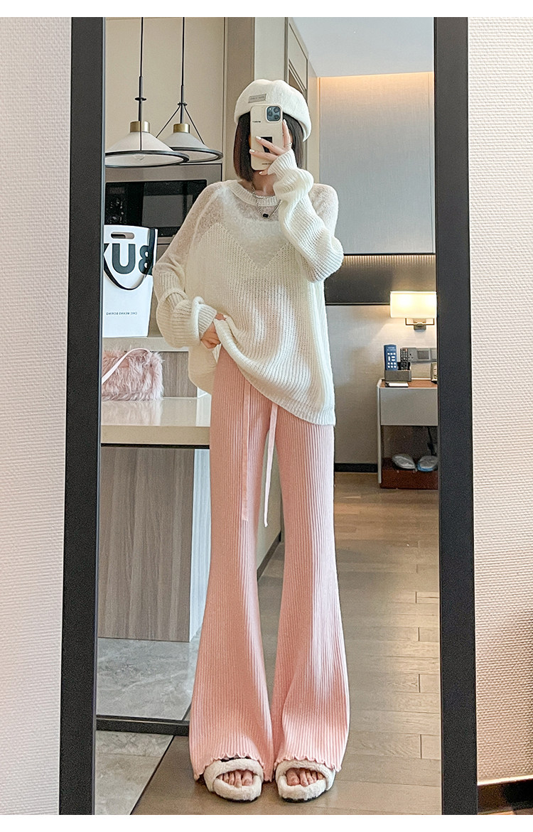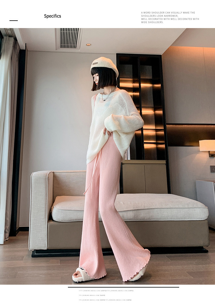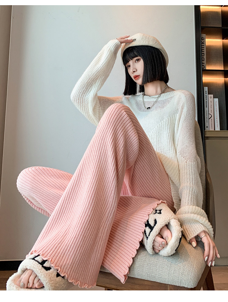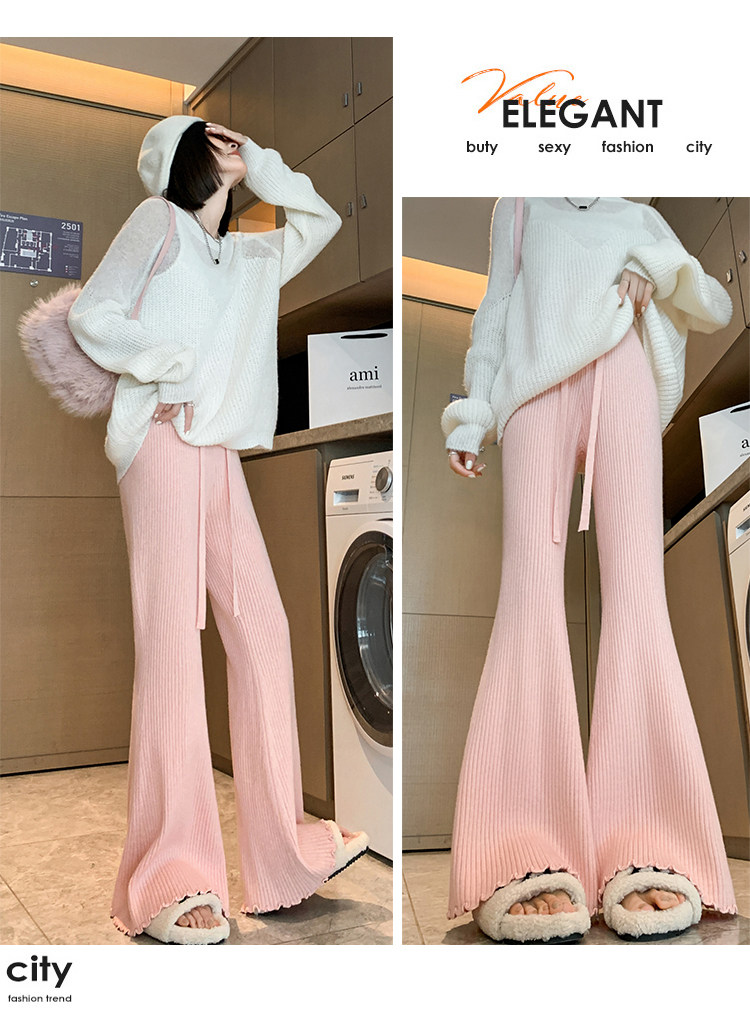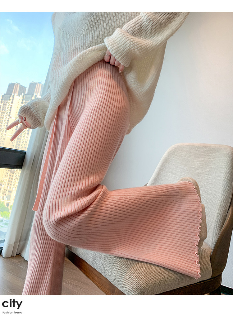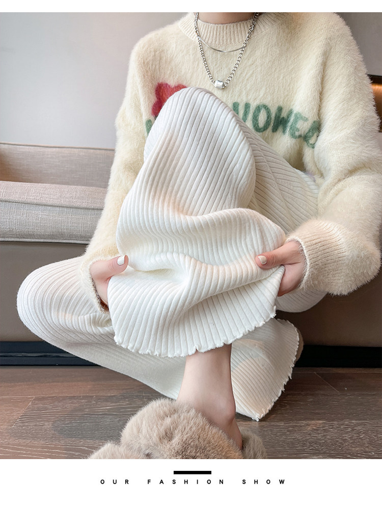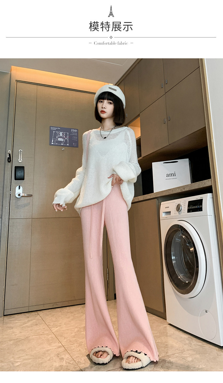 軟糯坑條針織褲子女秋冬加厚高腰顯瘦濶腿褲寬鬆休閒垂感微喇叭褲