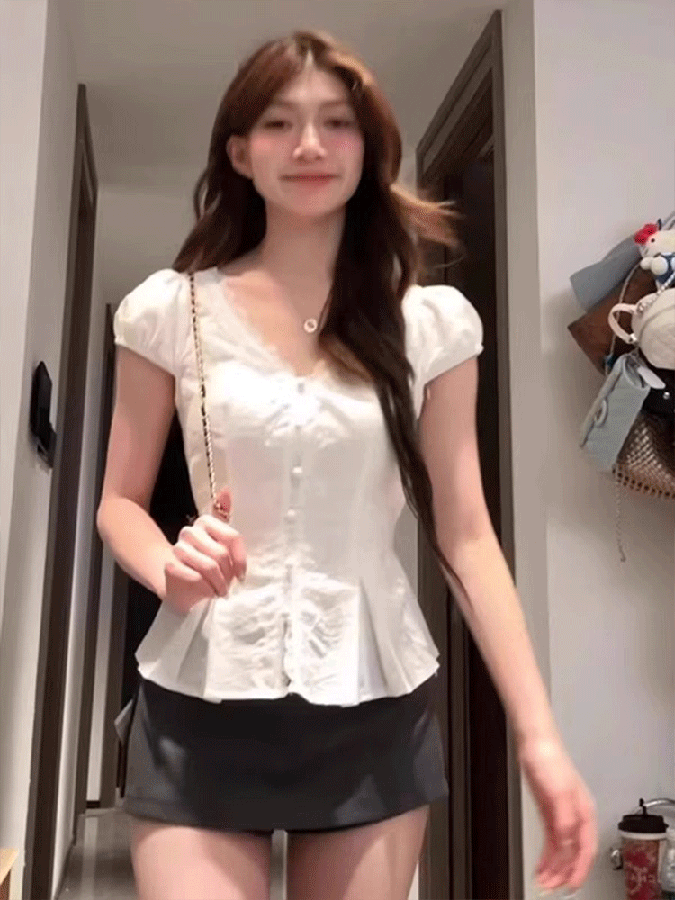 法式蕾絲花邊v領短袖襯衫女夏季高級感蝴蝶結收腰短款小衫上衣潮