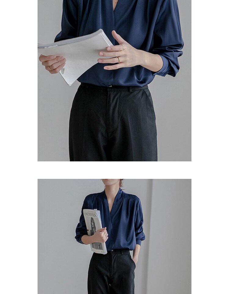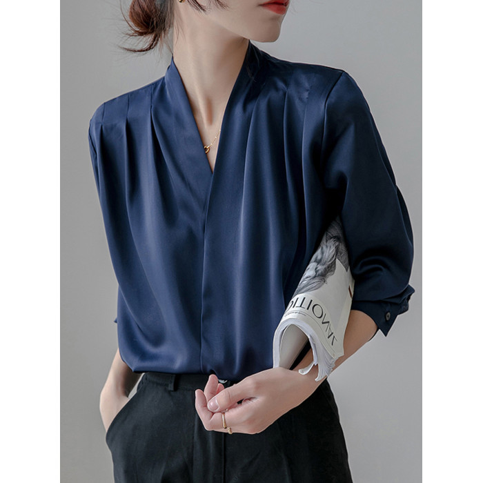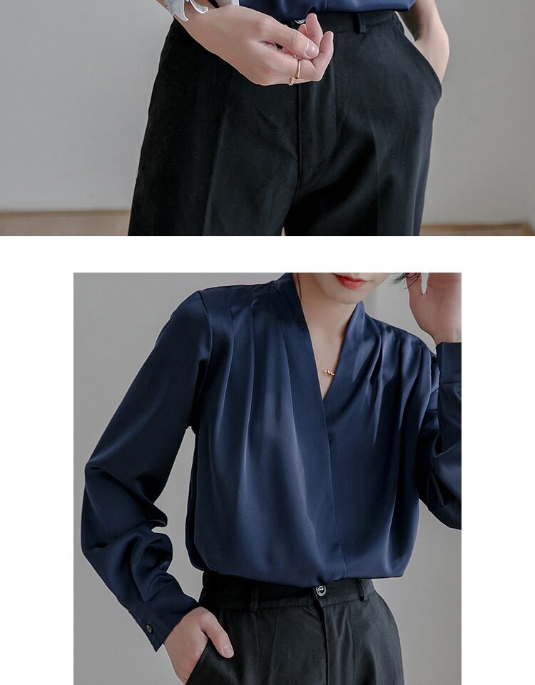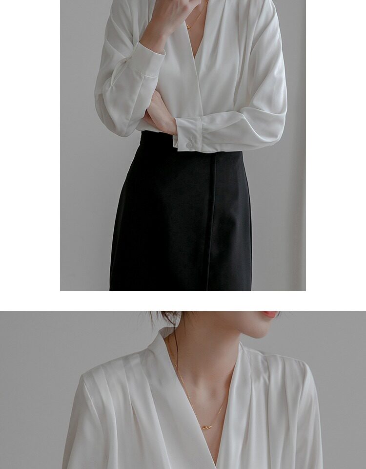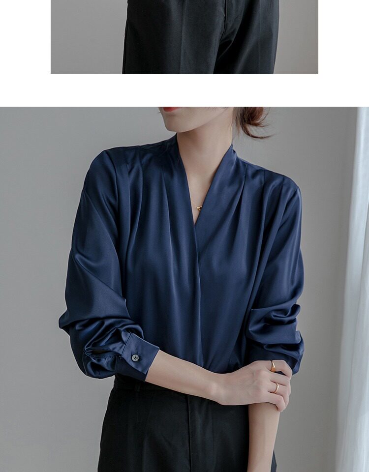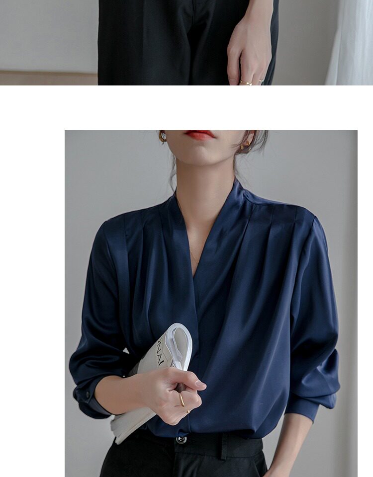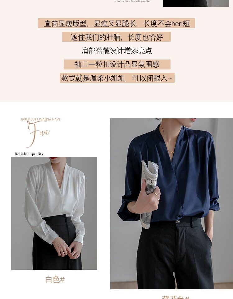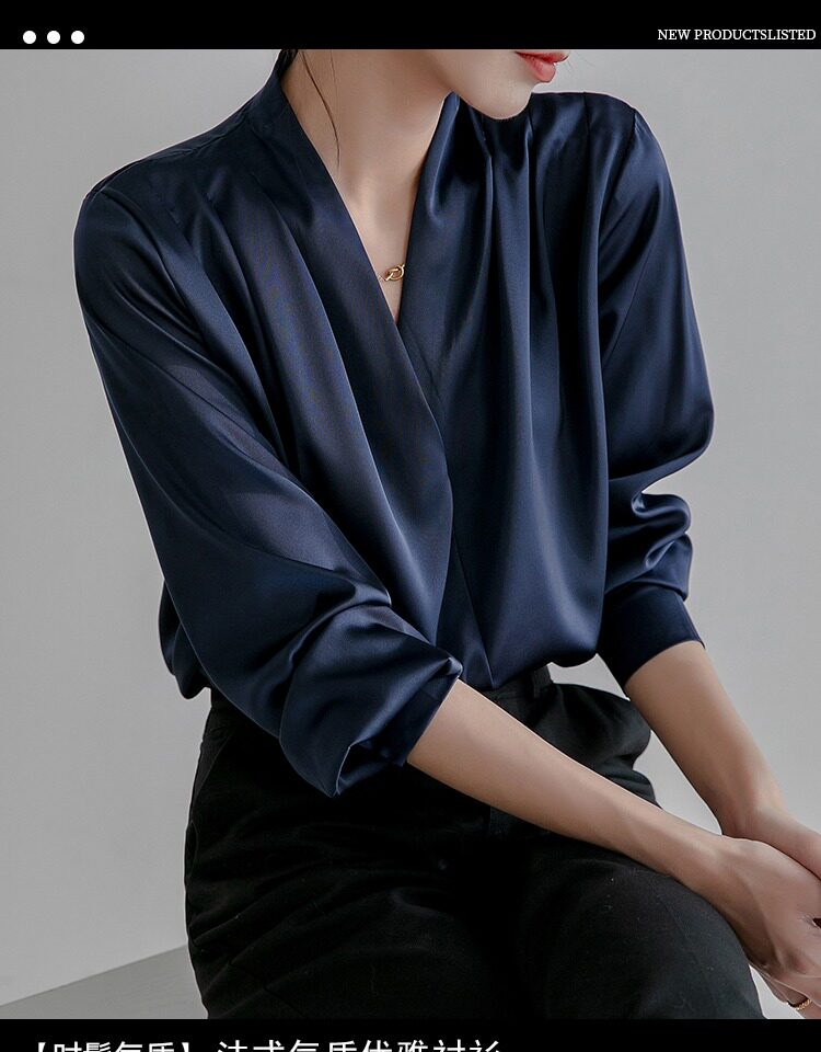 通勤襯衫女2026春季新款職業垂感v領長袖緞面襯衣OL正裝面試上衣