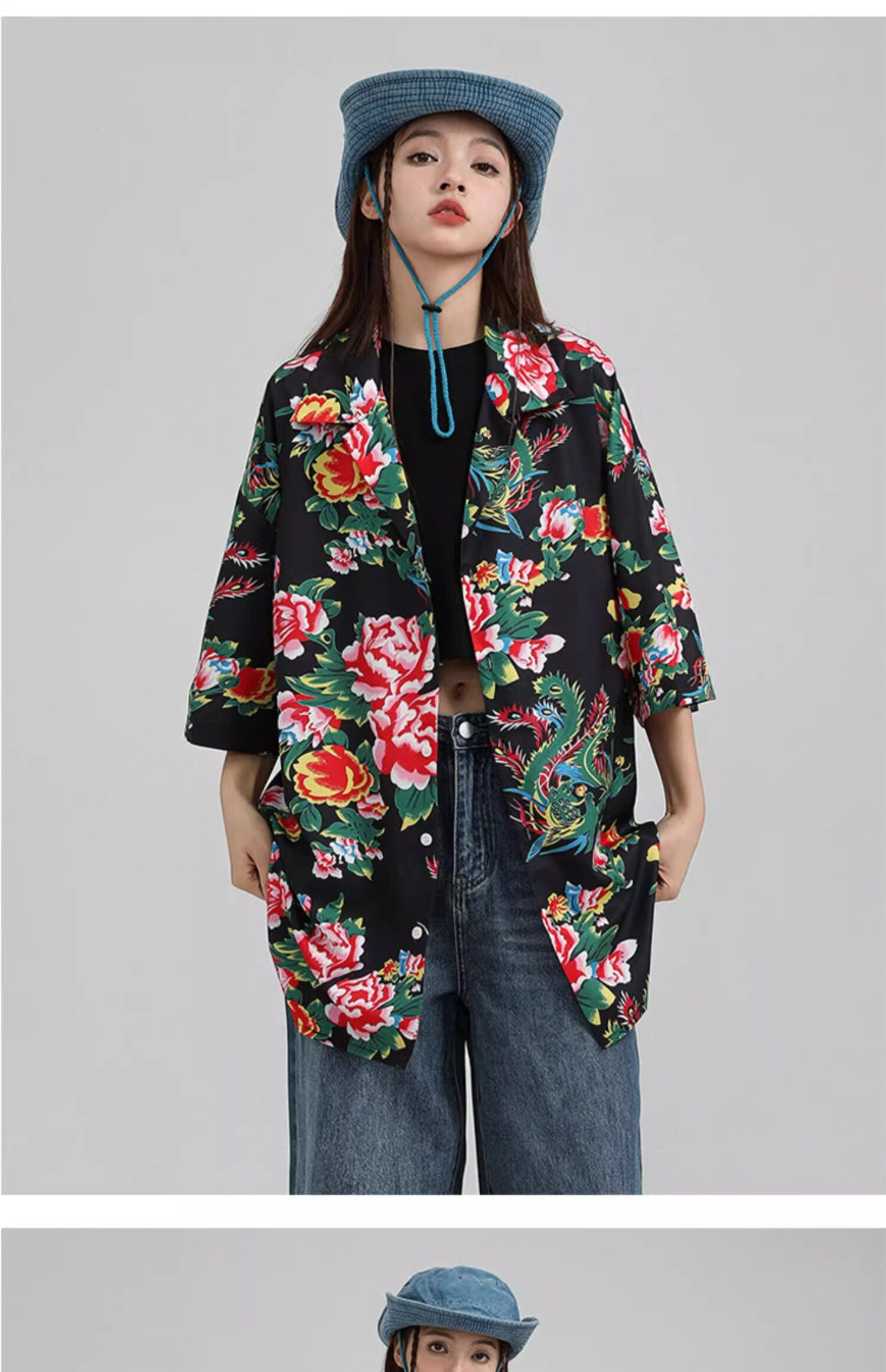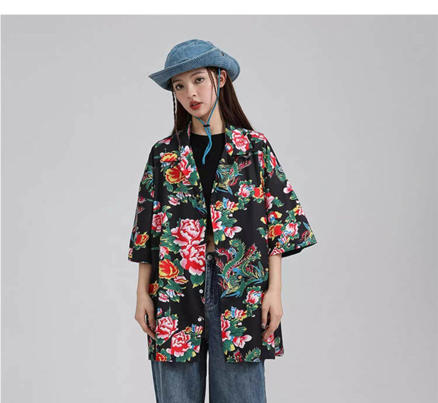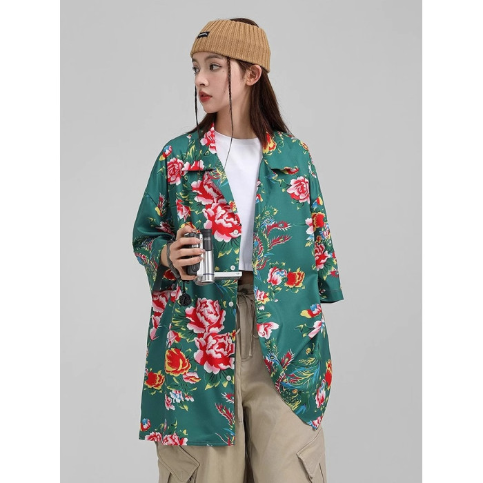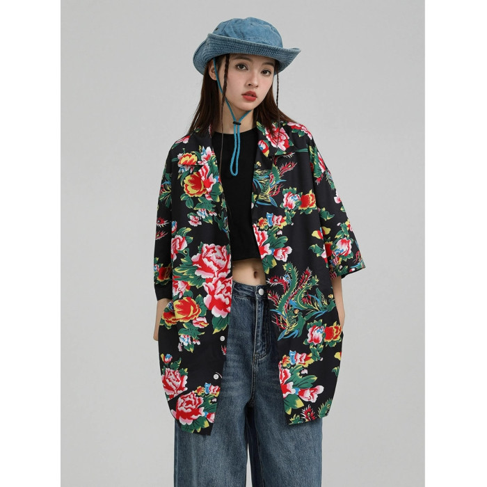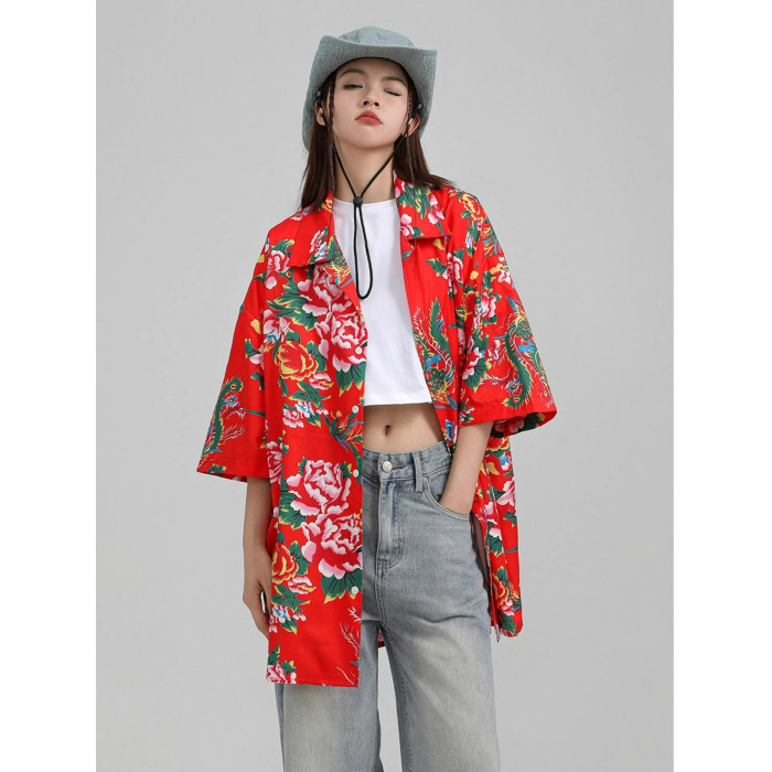 東北大花短袖襯衫女設計感小衆復古新中式國風沙灘襯衣上衣外套夏