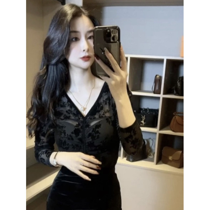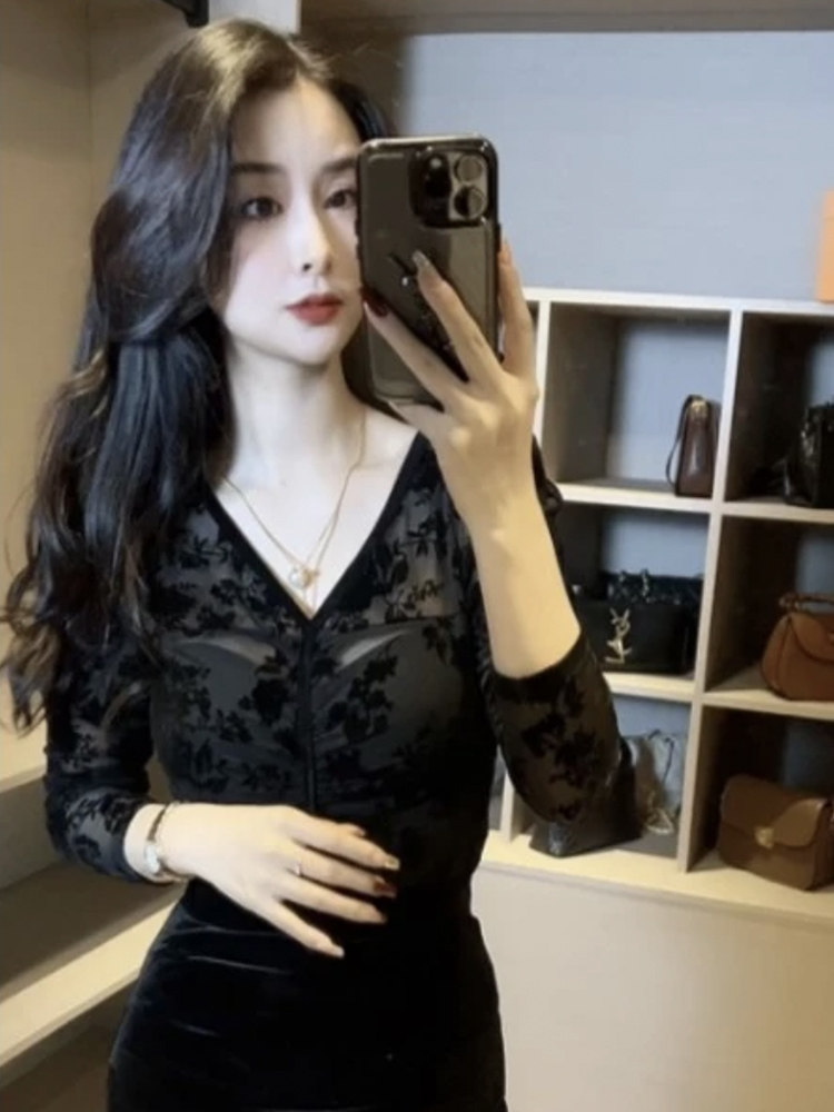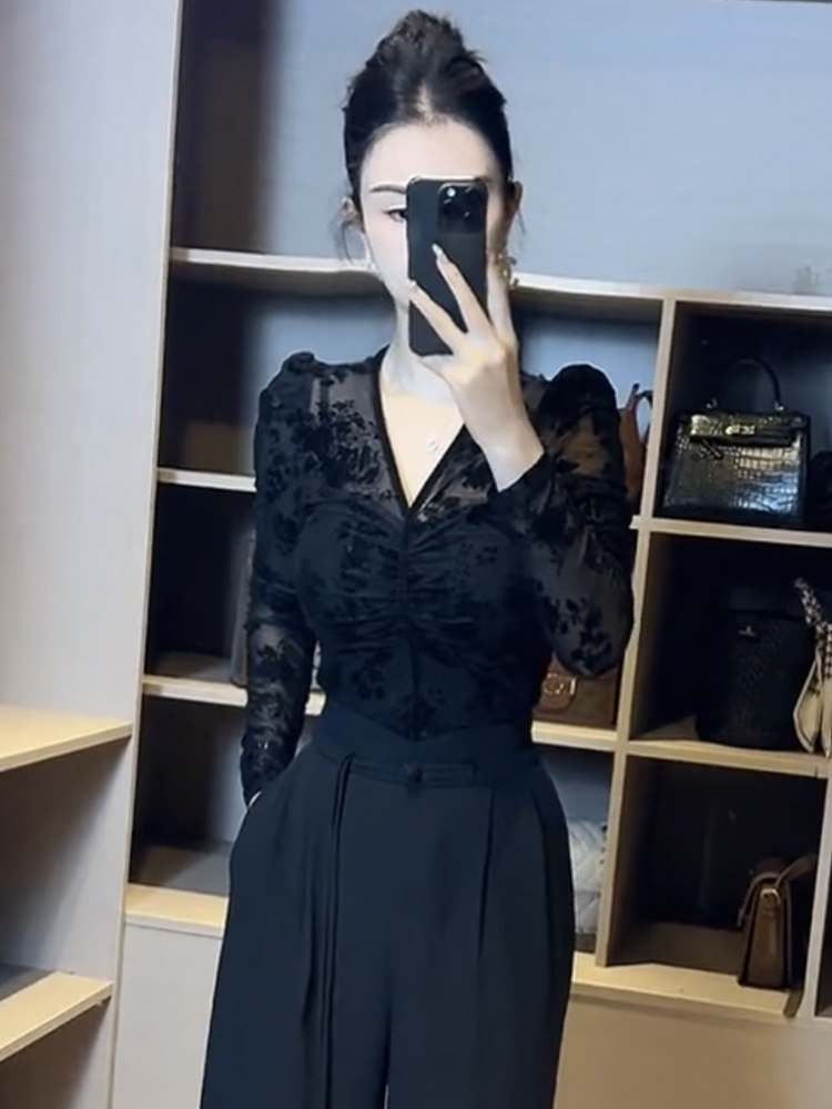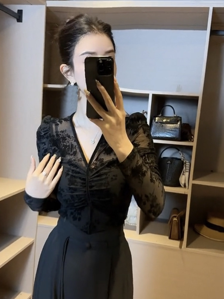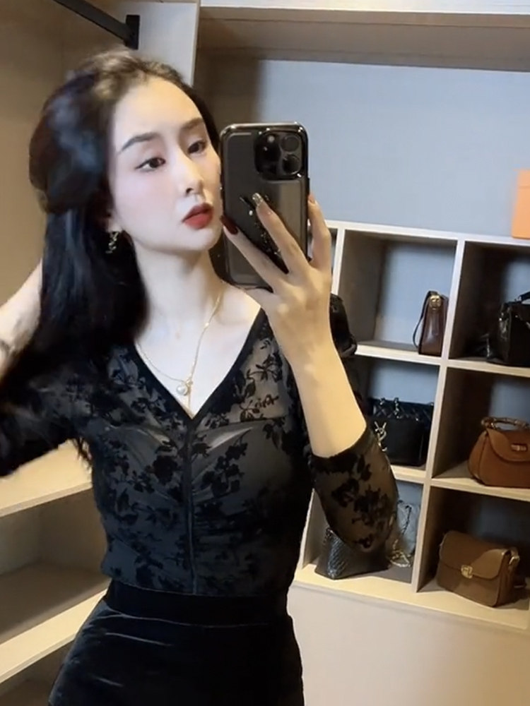 復古植絨印花長袖T恤女2024春季新款性感V領網紗小衫內搭緊身上衣