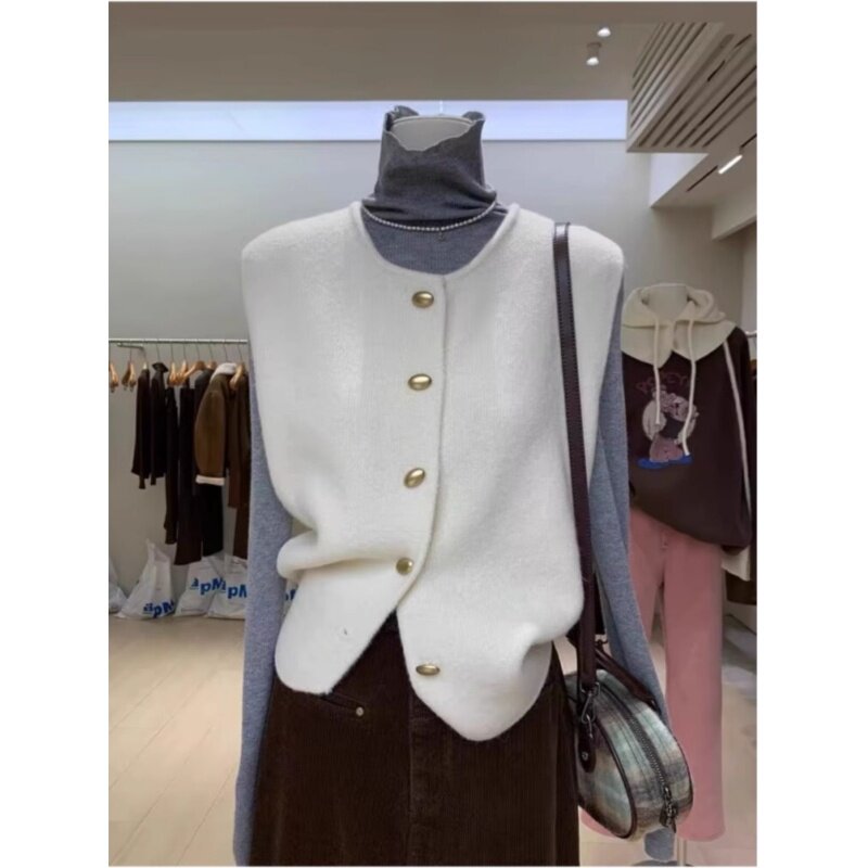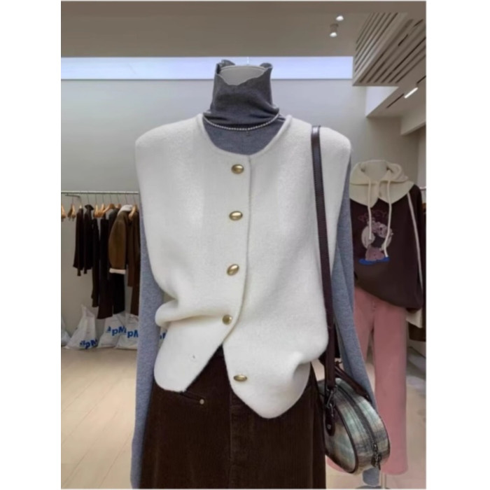 廣州十三行高級感白色針織開衫毛衣背心女秋冬小香風曡穿外搭馬甲