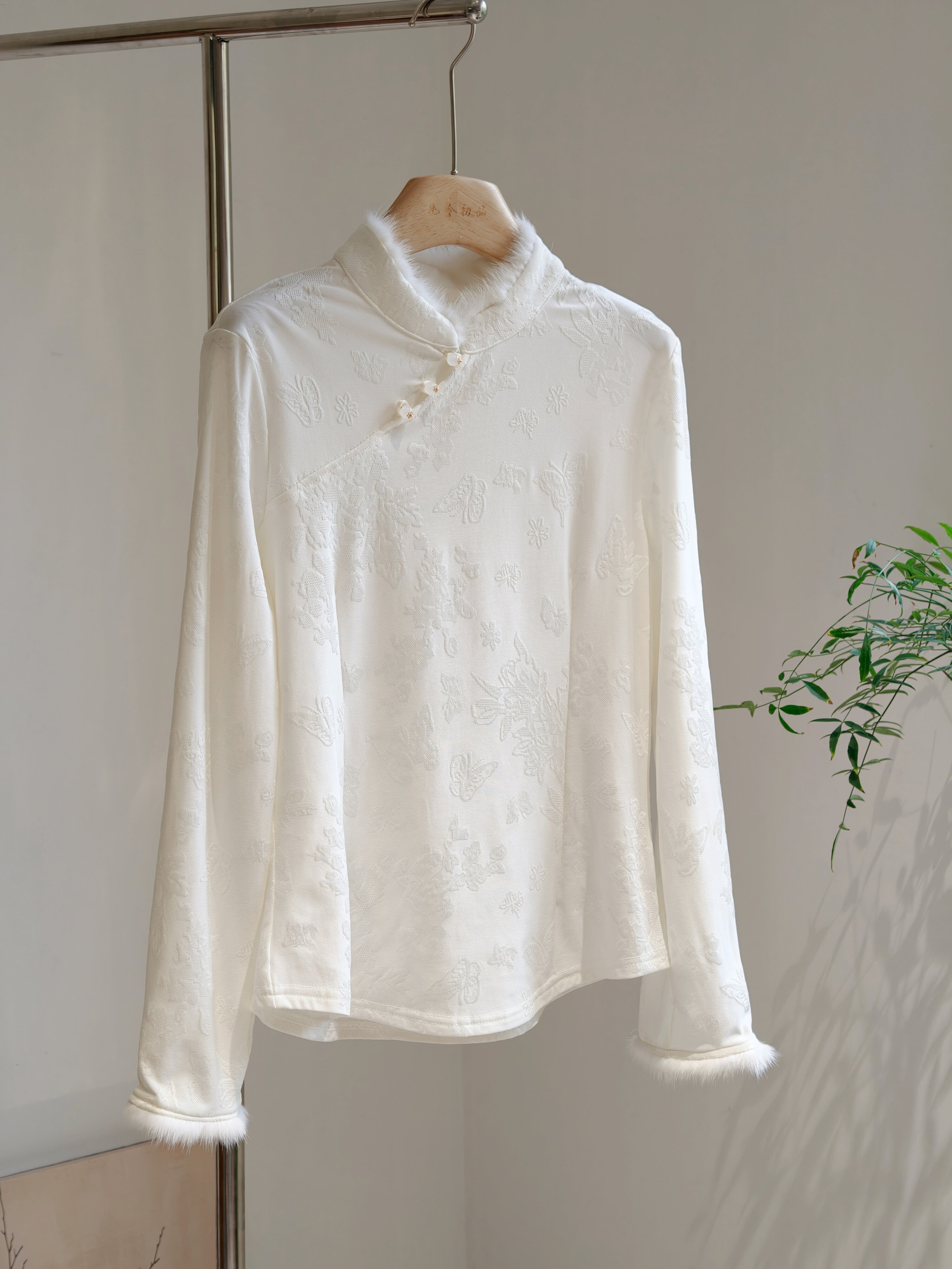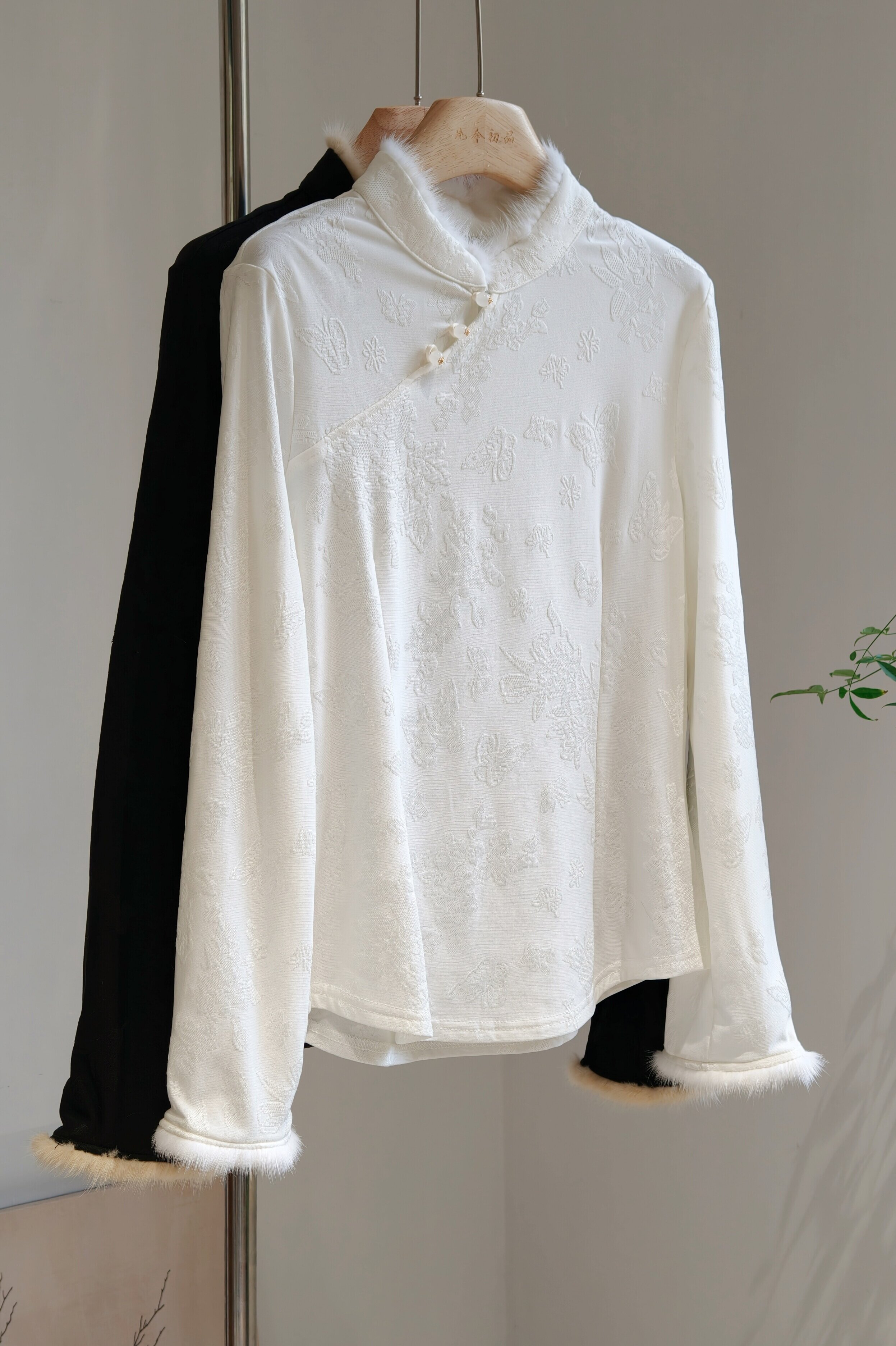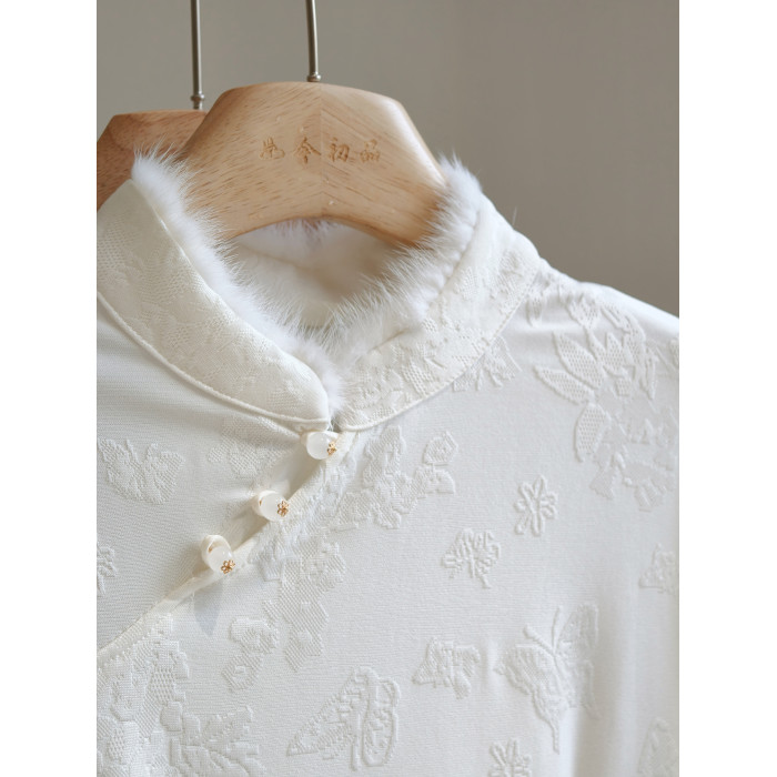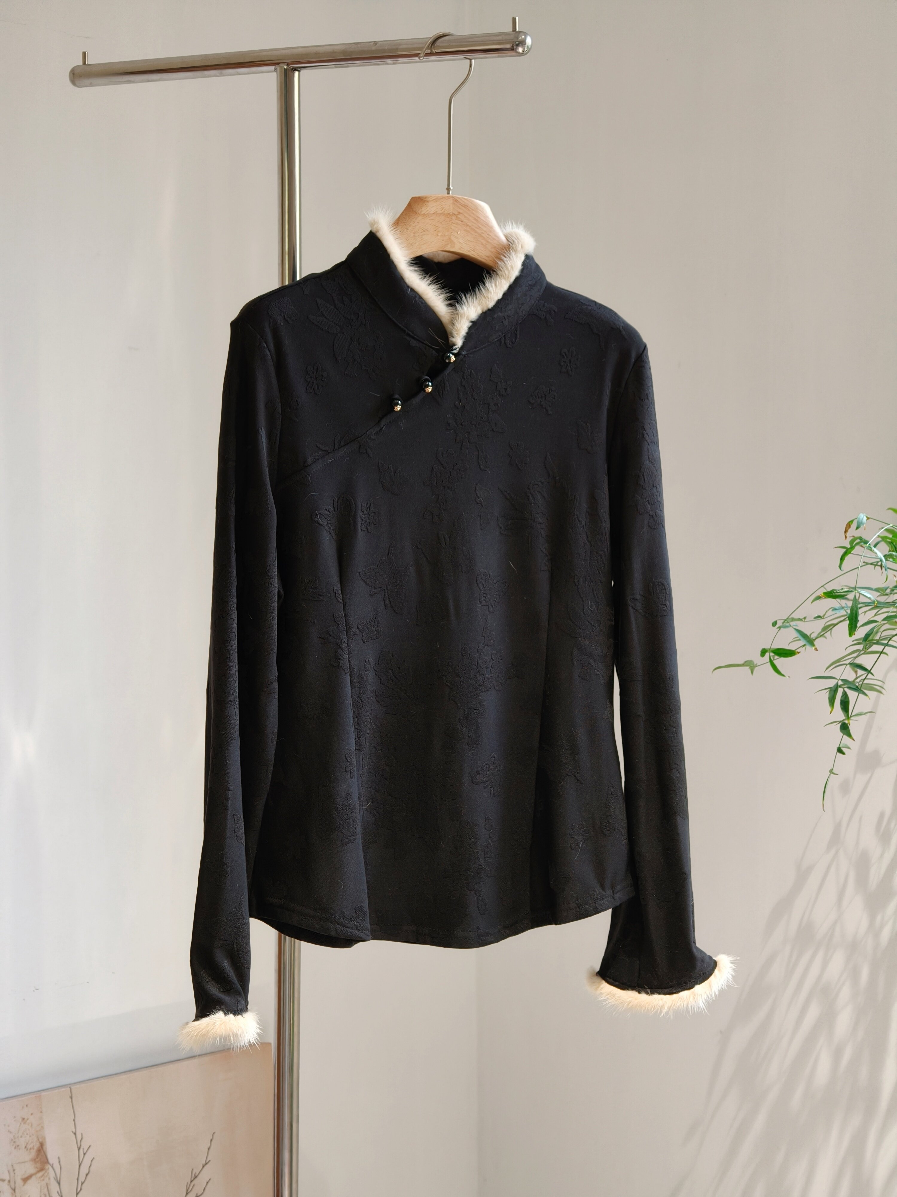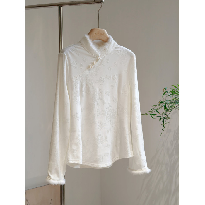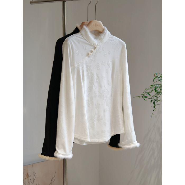 水貂毛立領斜襟新中式加絨打底衫修身國風長袖內搭白黑柔軟彈力冬