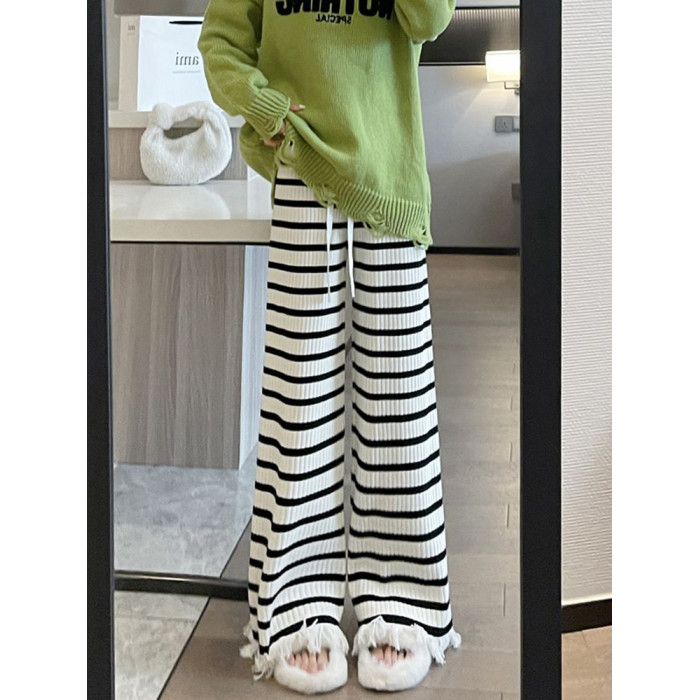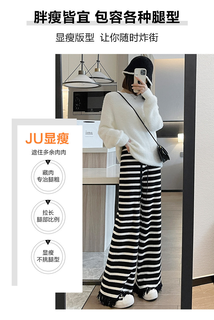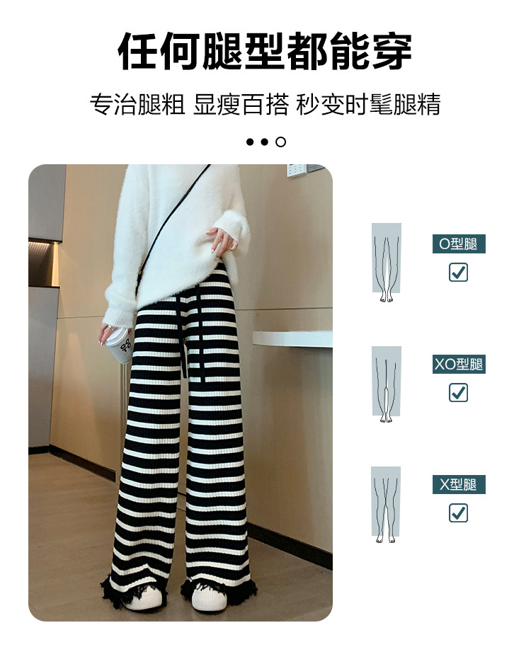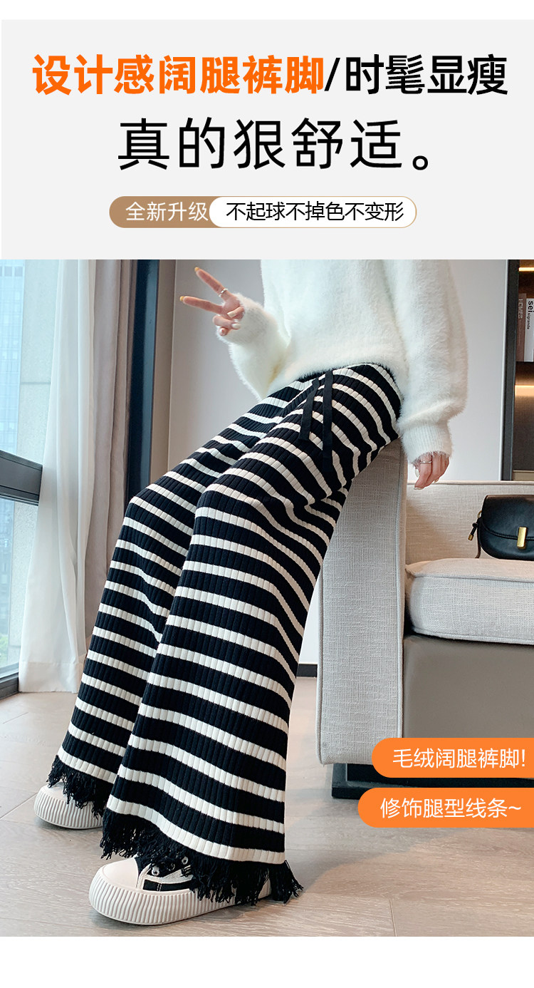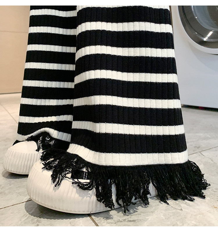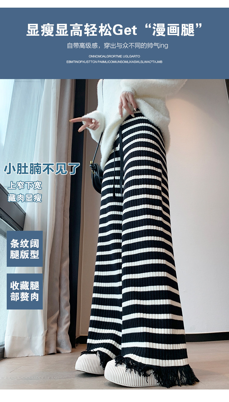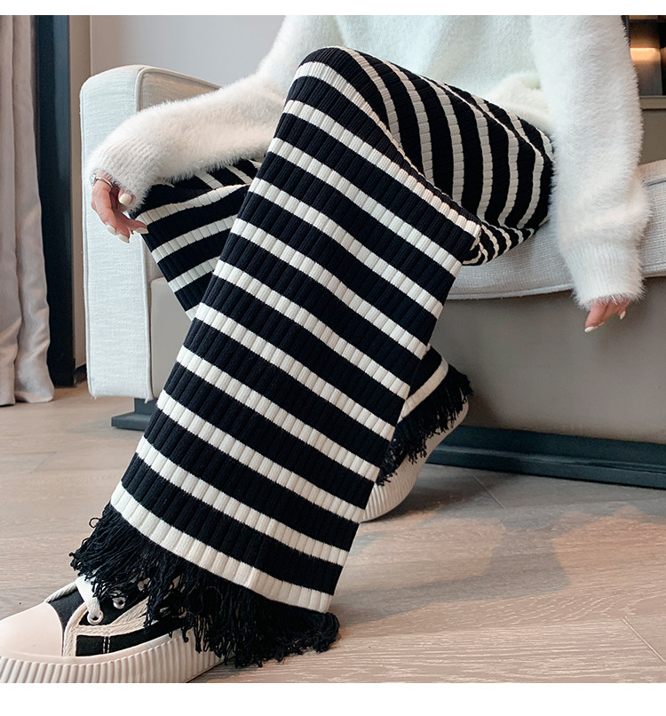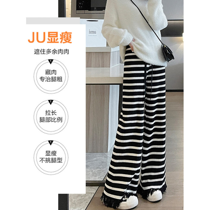 條紋軟糯針織褲子女秋冬高腰垂感濶腿褲直筒寬鬆休閒流蘇拖地長褲