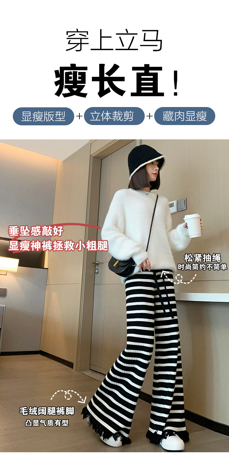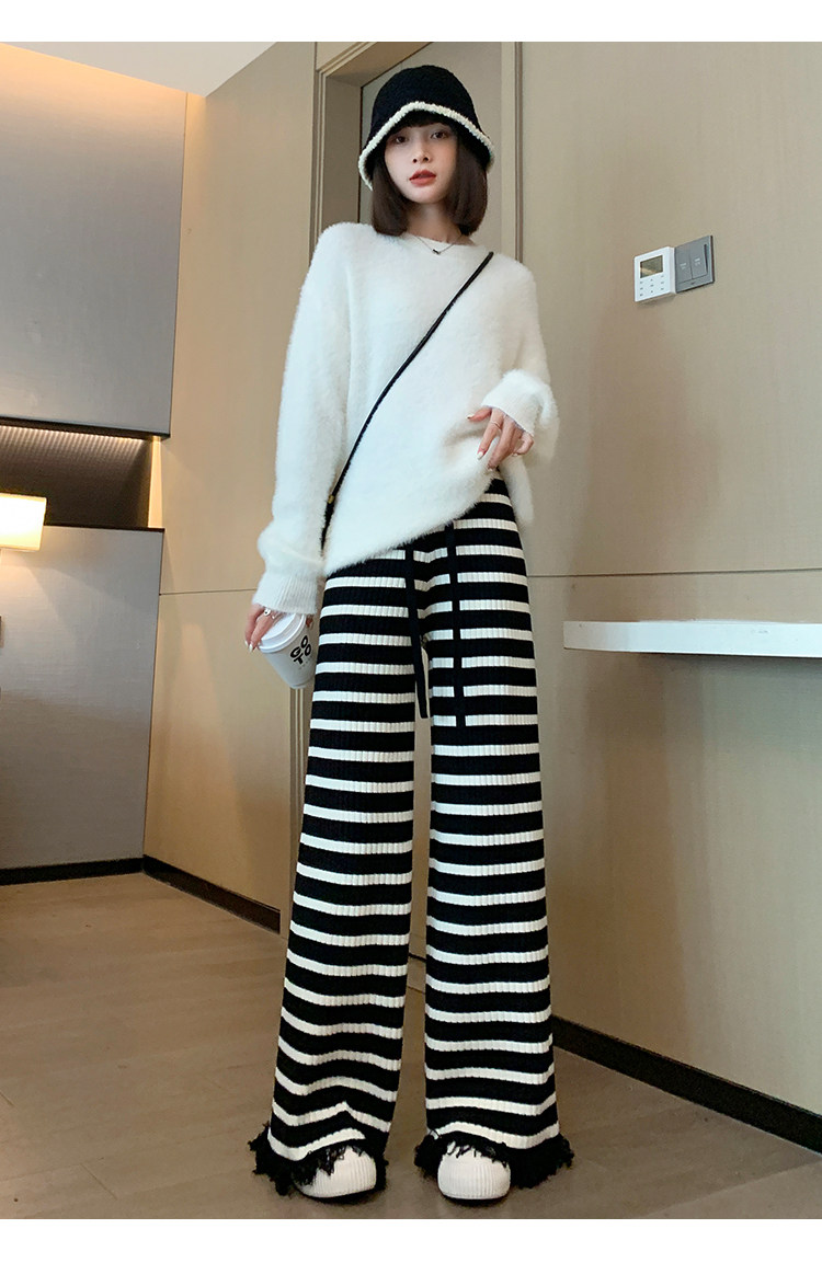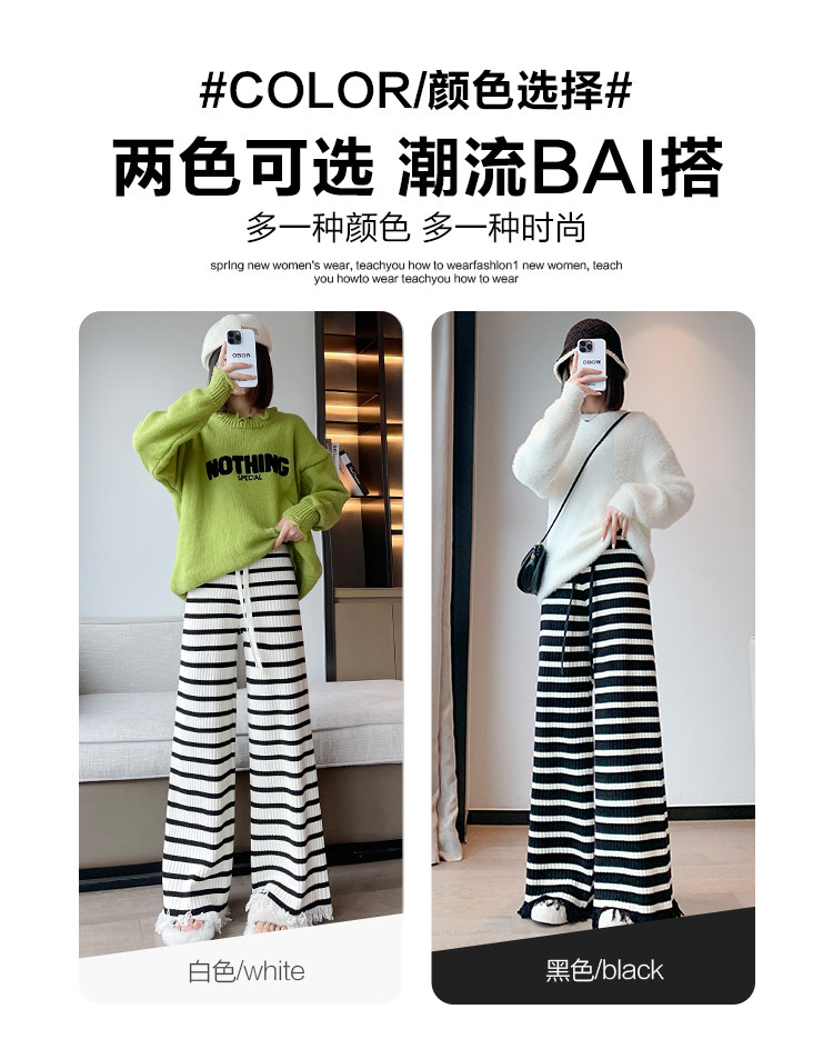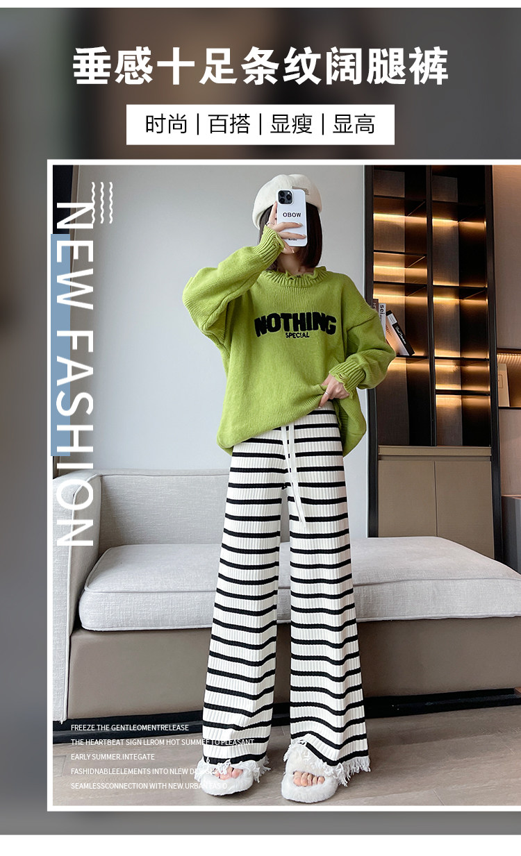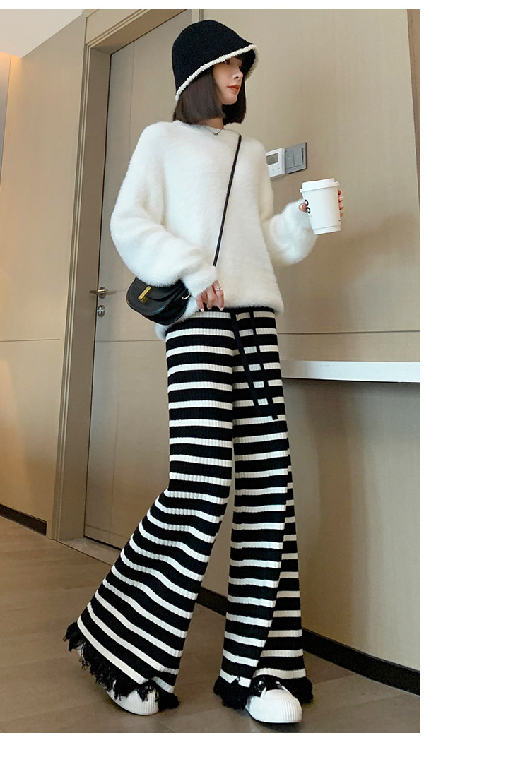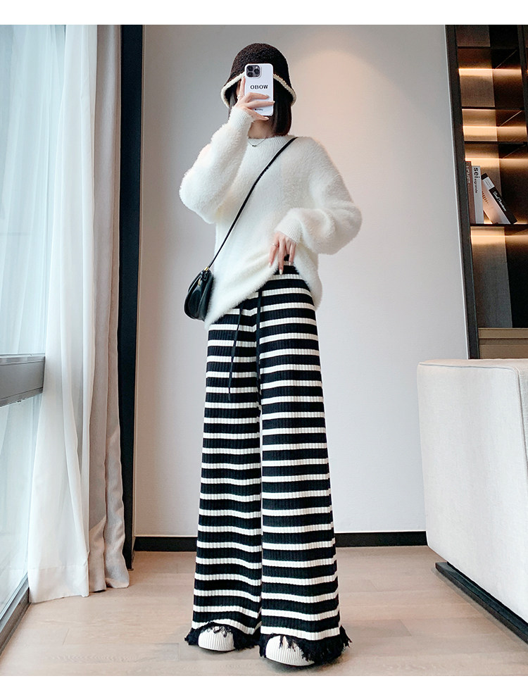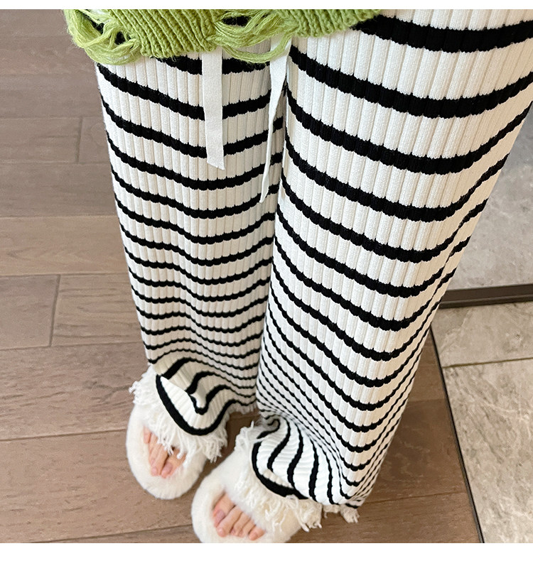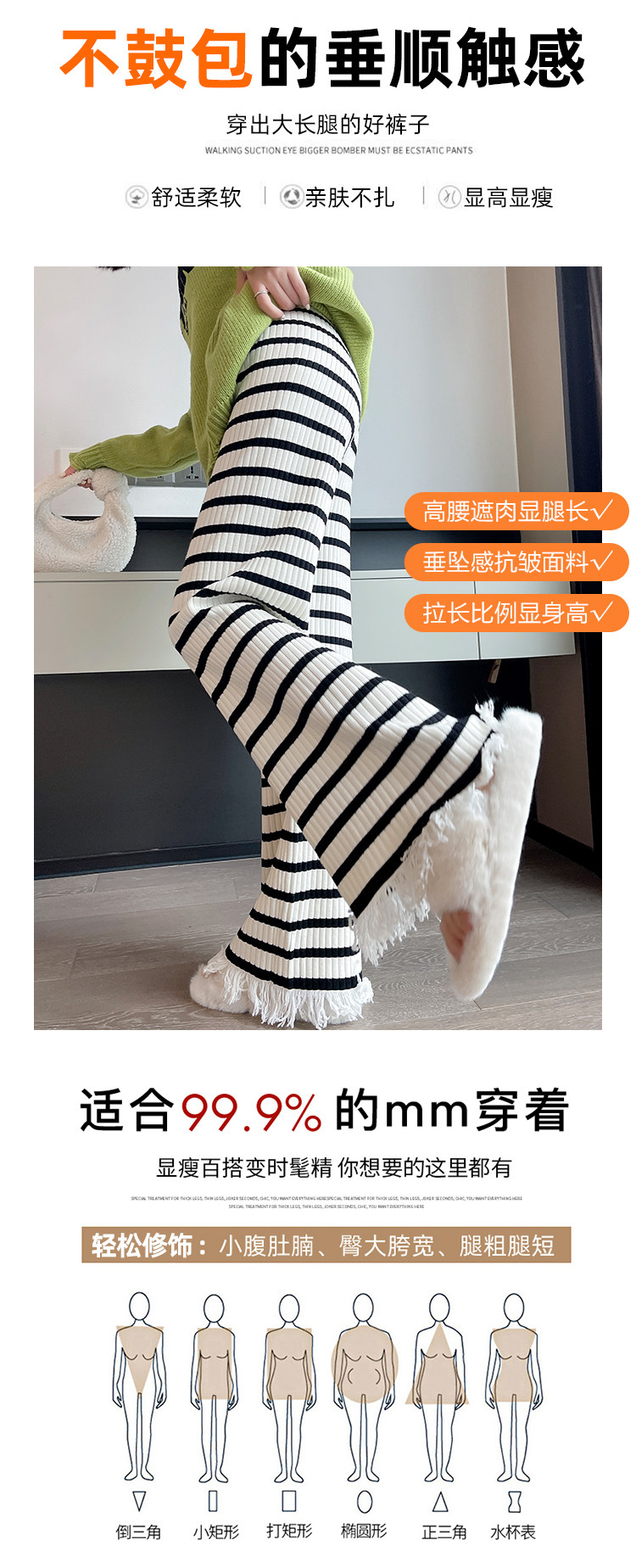 條紋軟糯針織褲子女秋冬高腰垂感濶腿褲直筒寬鬆休閒流蘇拖地長褲