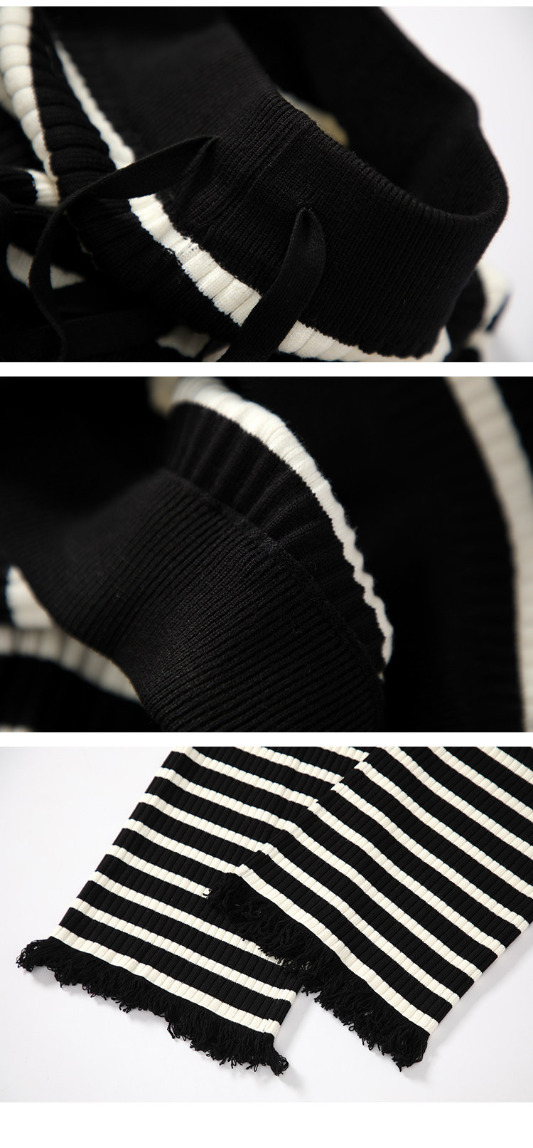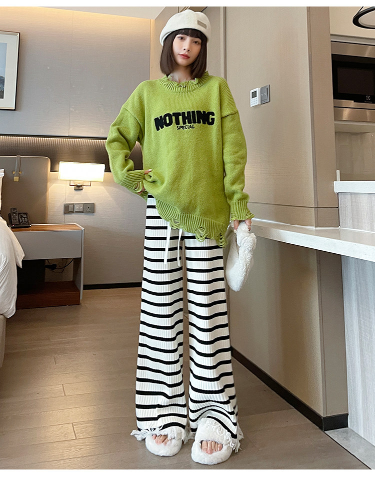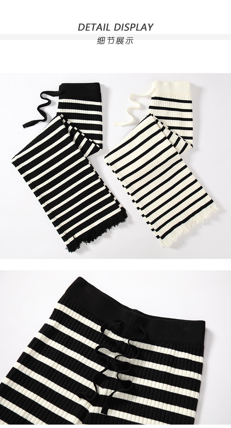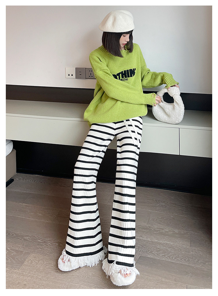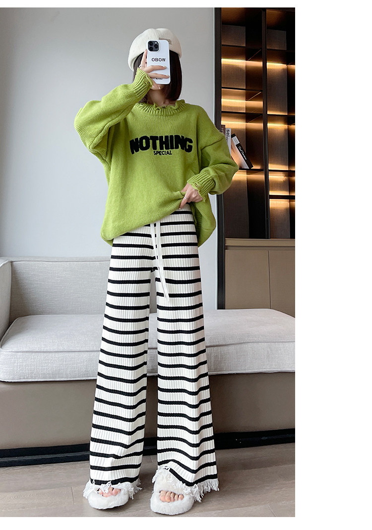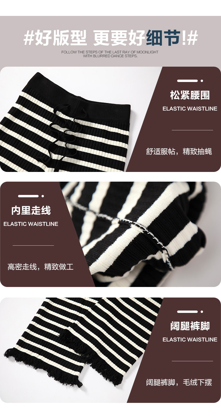 條紋軟糯針織褲子女秋冬高腰垂感濶腿褲直筒寬鬆休閒流蘇拖地長褲