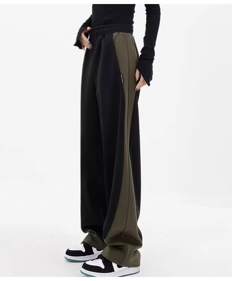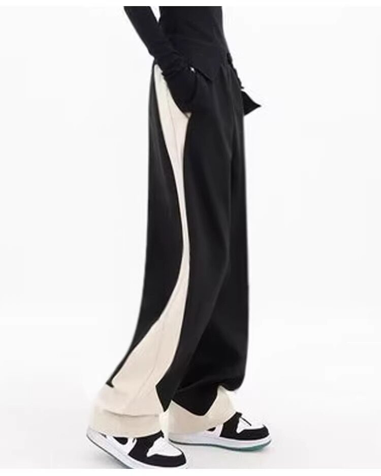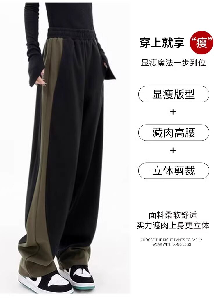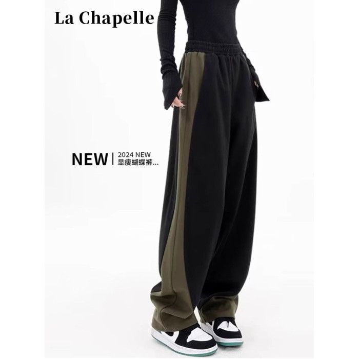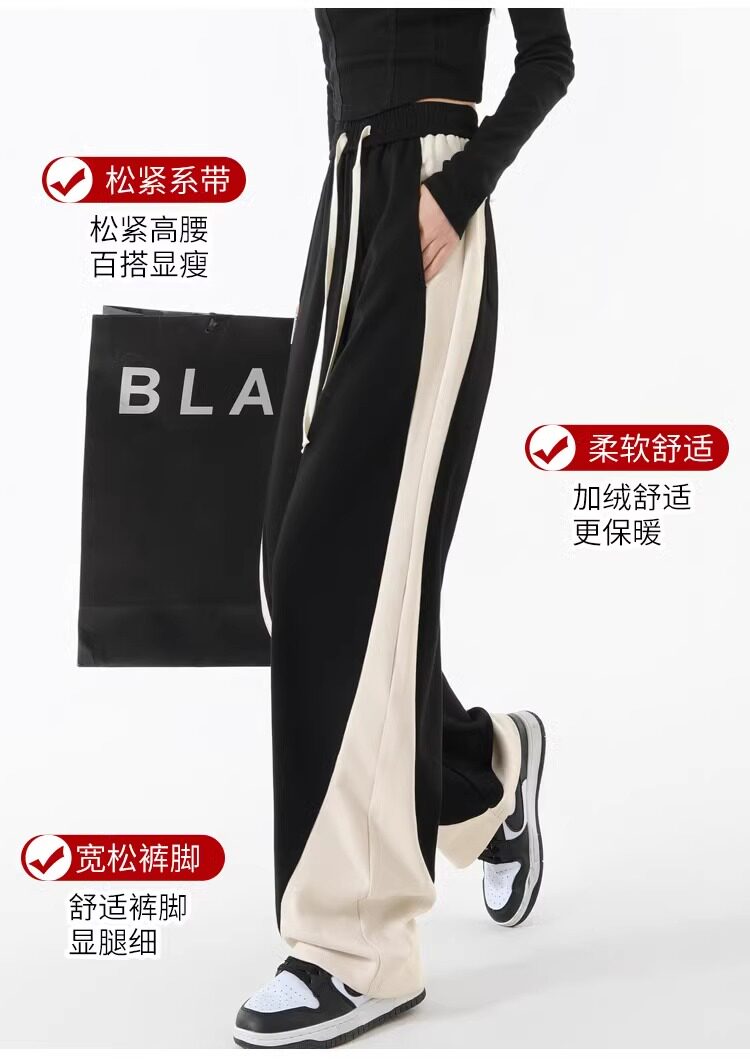拉夏貝爾撞色香蕉運動褲女春秋2025新款冬季濶腿美式加絨直筒衛褲