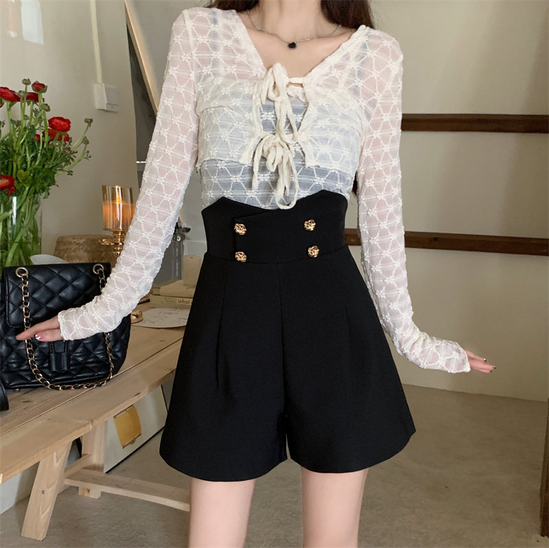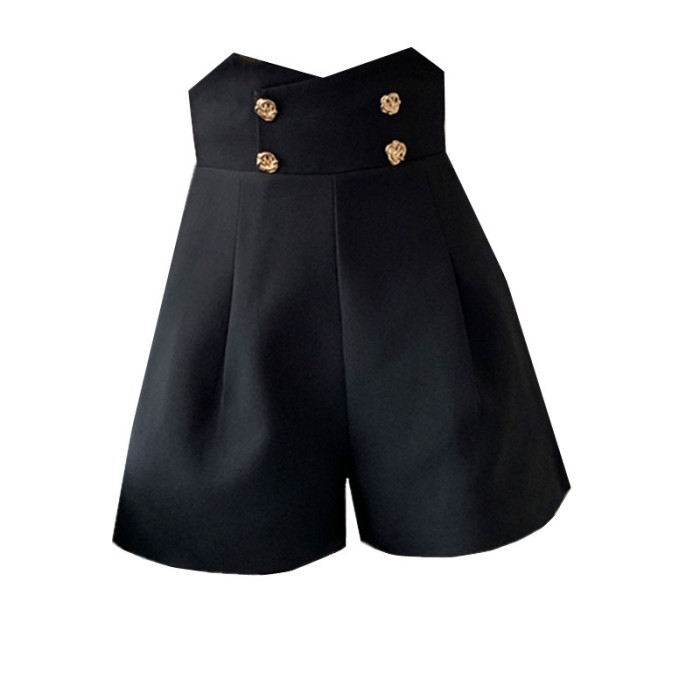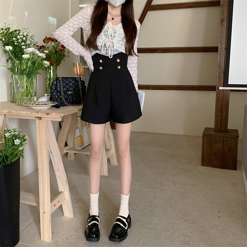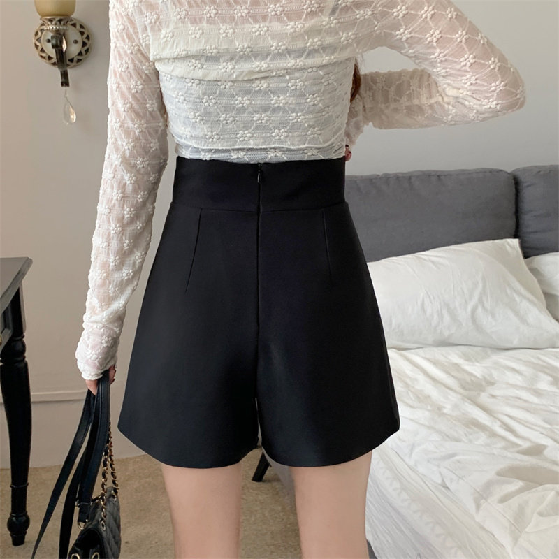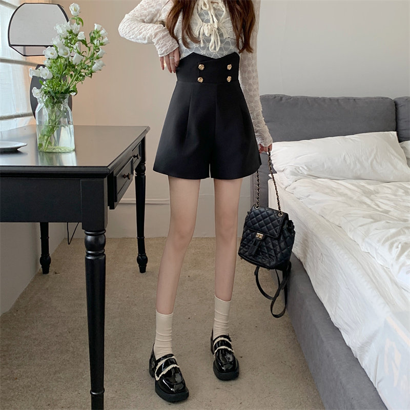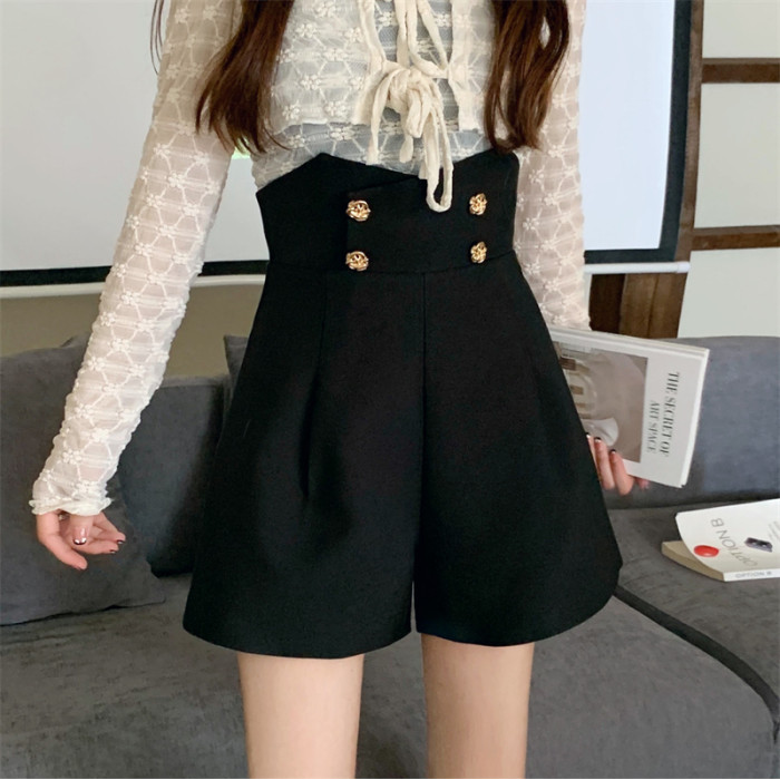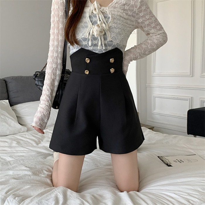 大碼新款超高腰濶腿褲女英倫風設計小衆百搭西裝短褲雙排釦休閒褲