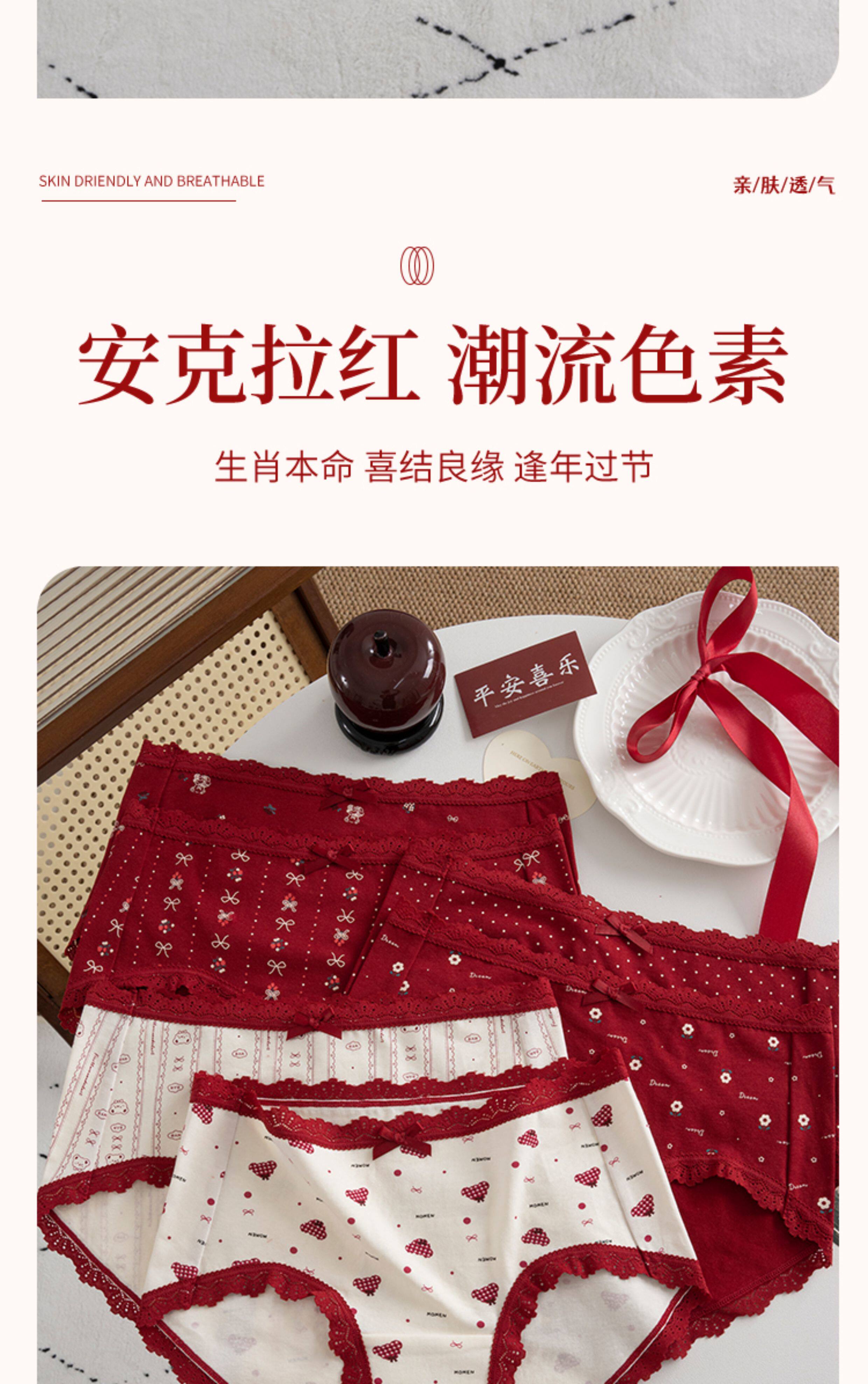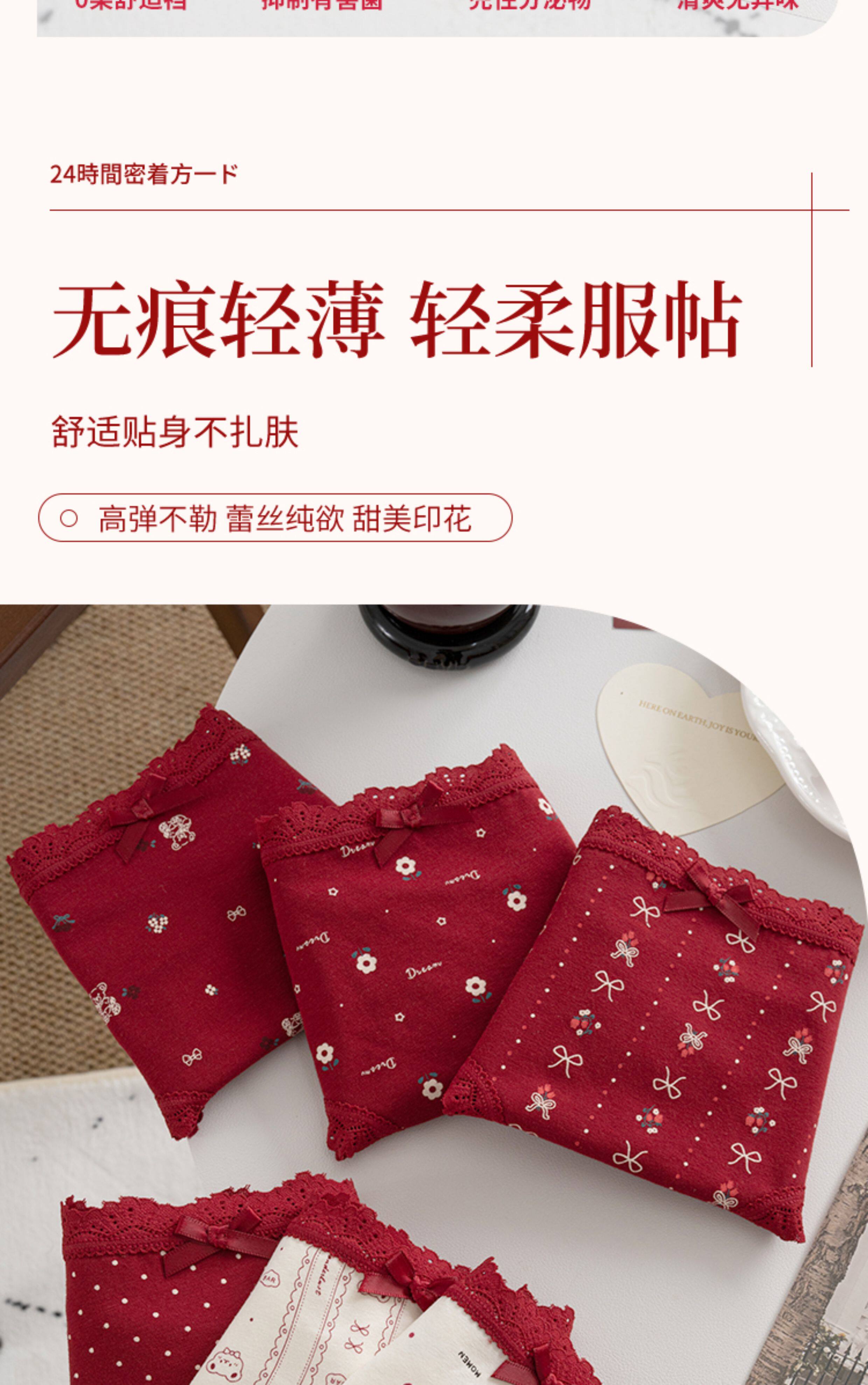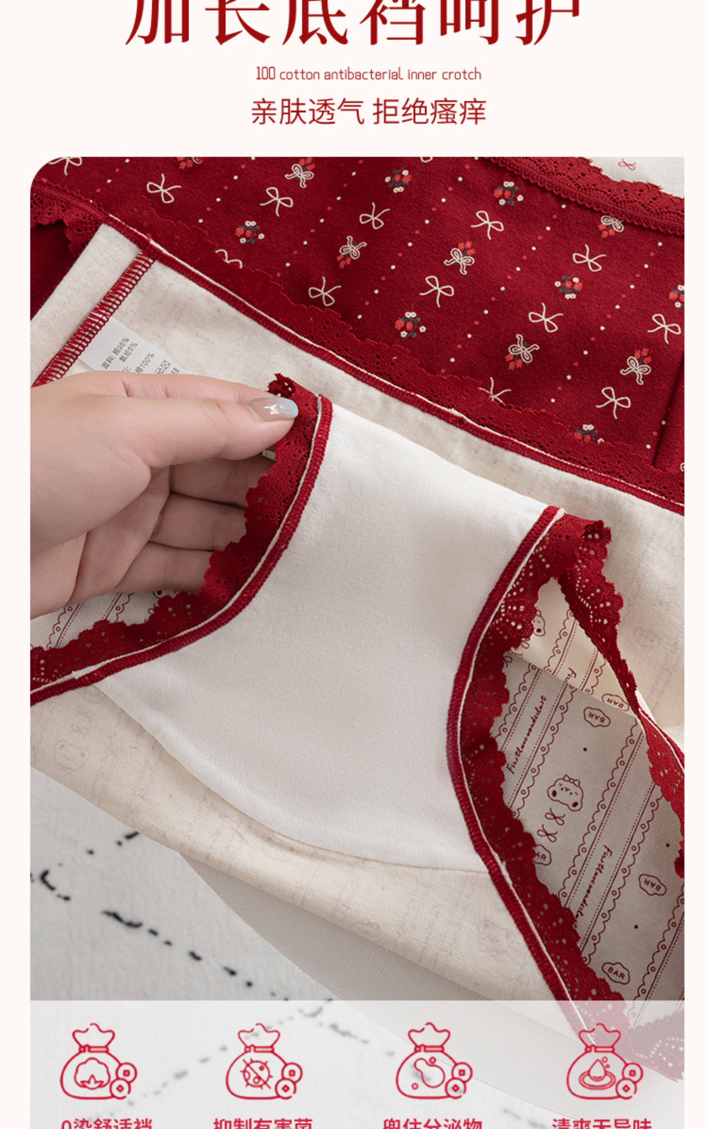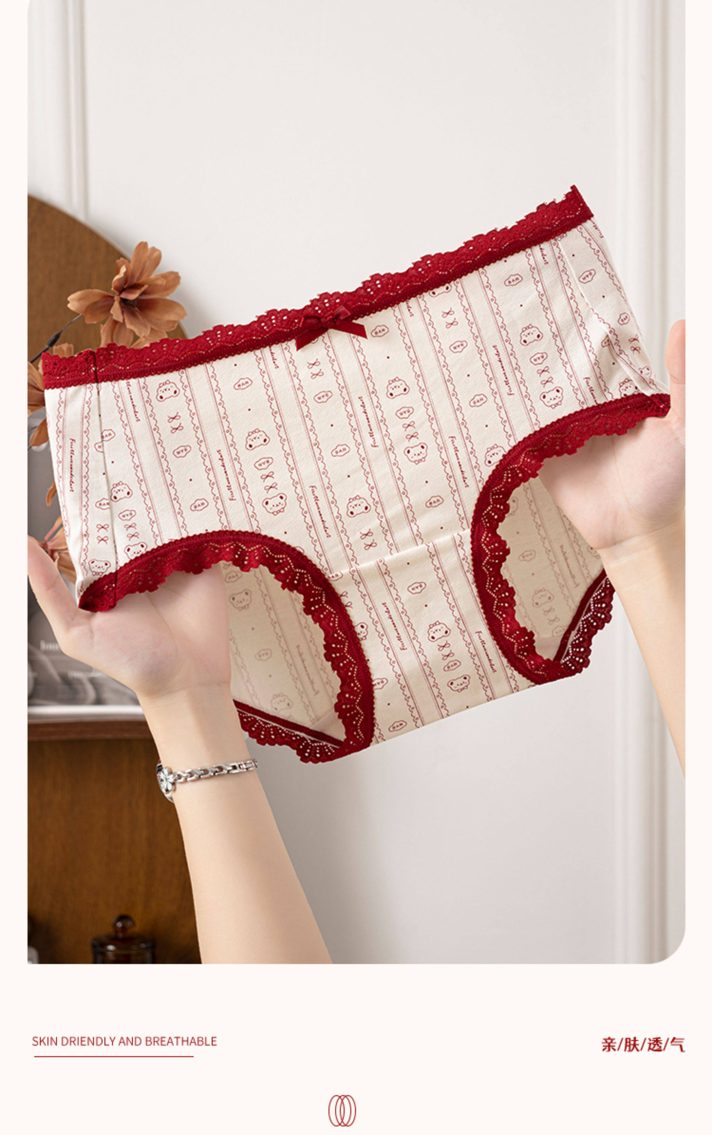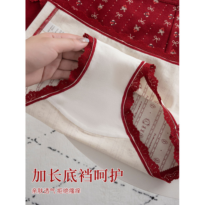 本命年馬年蕾絲邊可愛卡通純棉聖誕紅色內褲新娘結婚加長襠三角褲