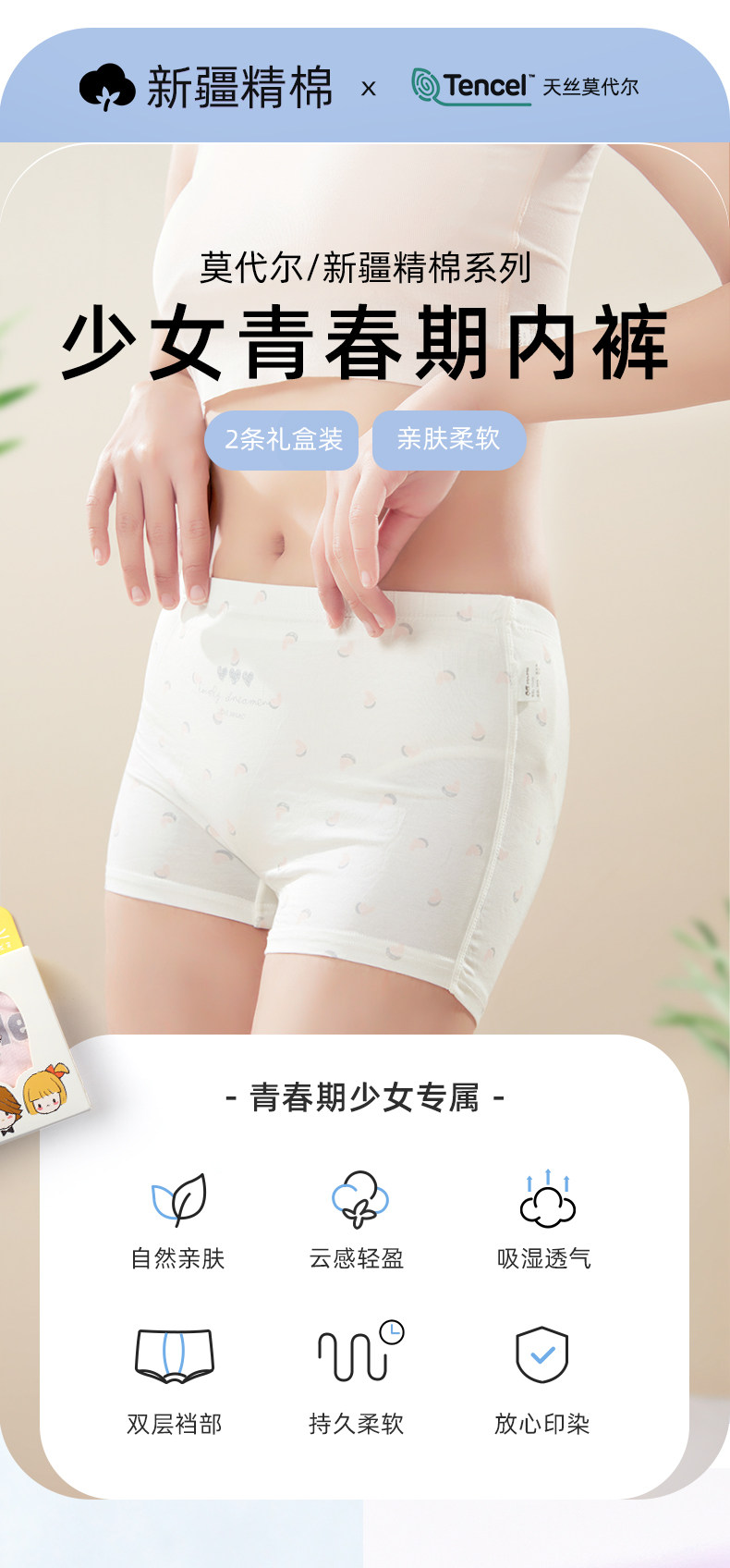 瑁恩瑁愛女童青少年內褲女士平角短褲純棉彈莫代爾四角褲頭青春期