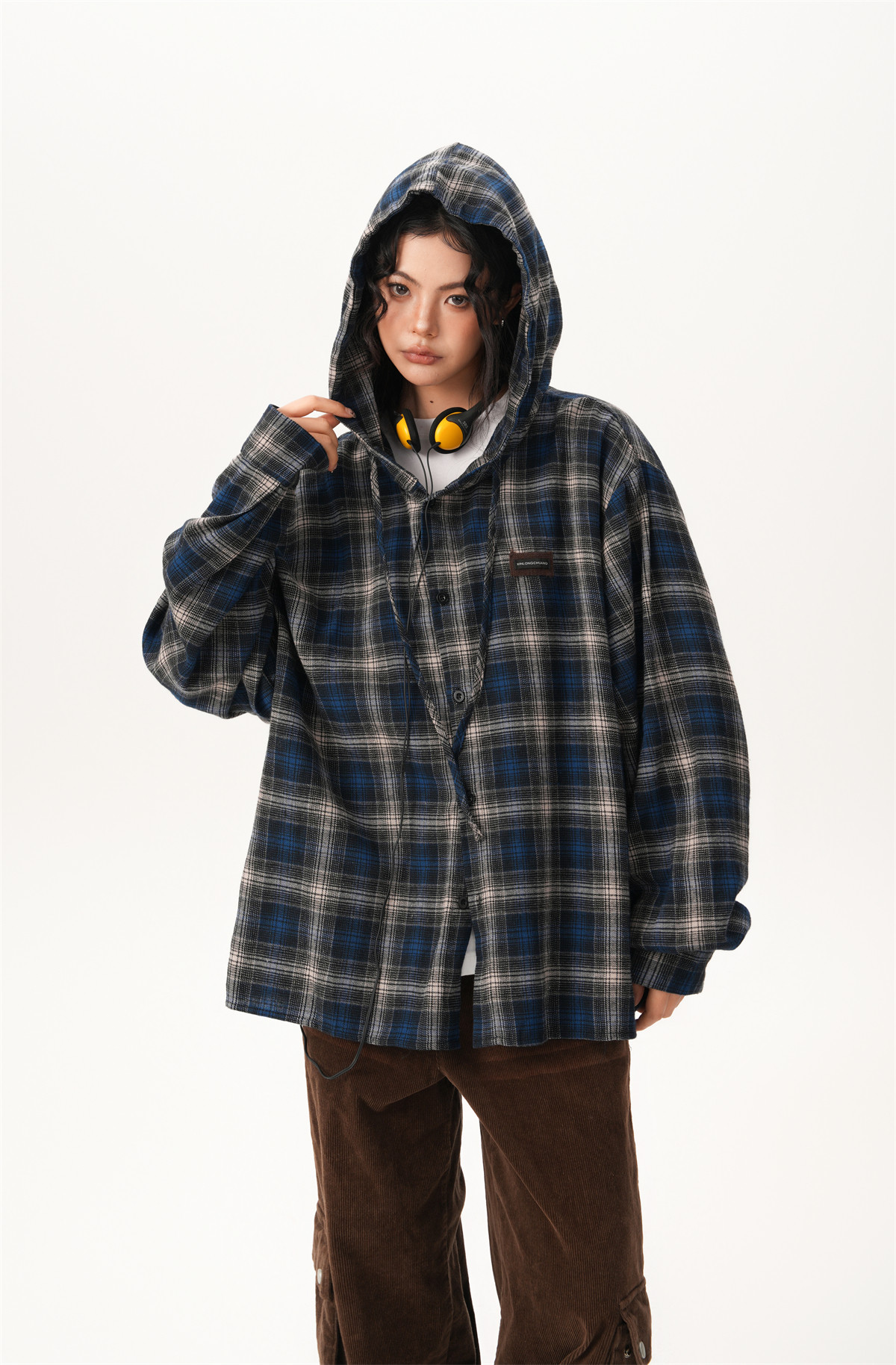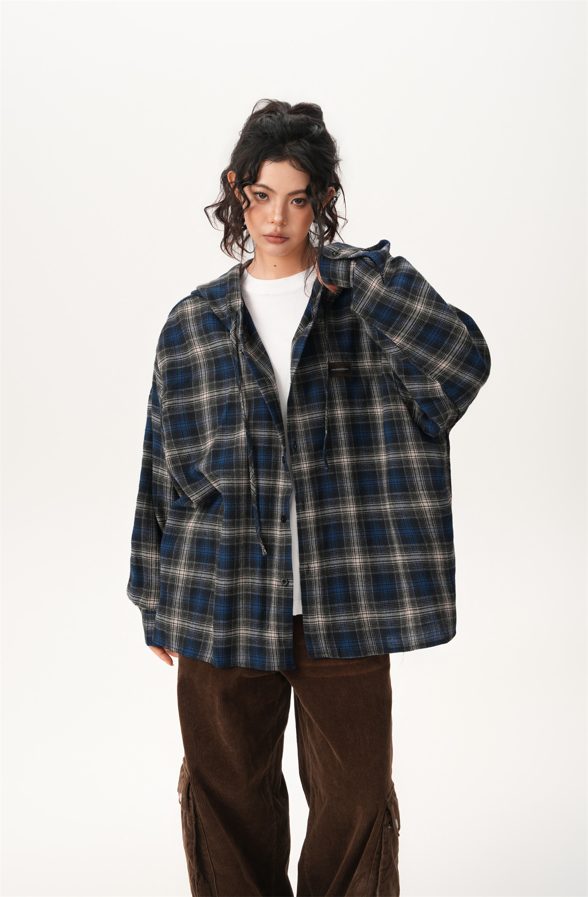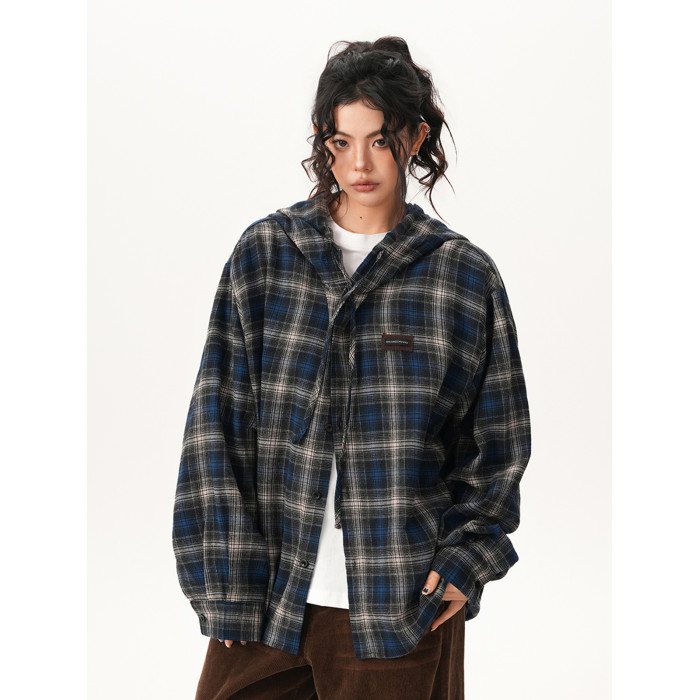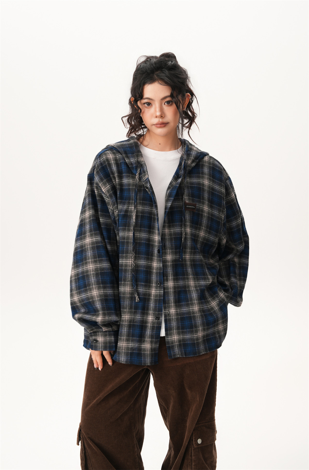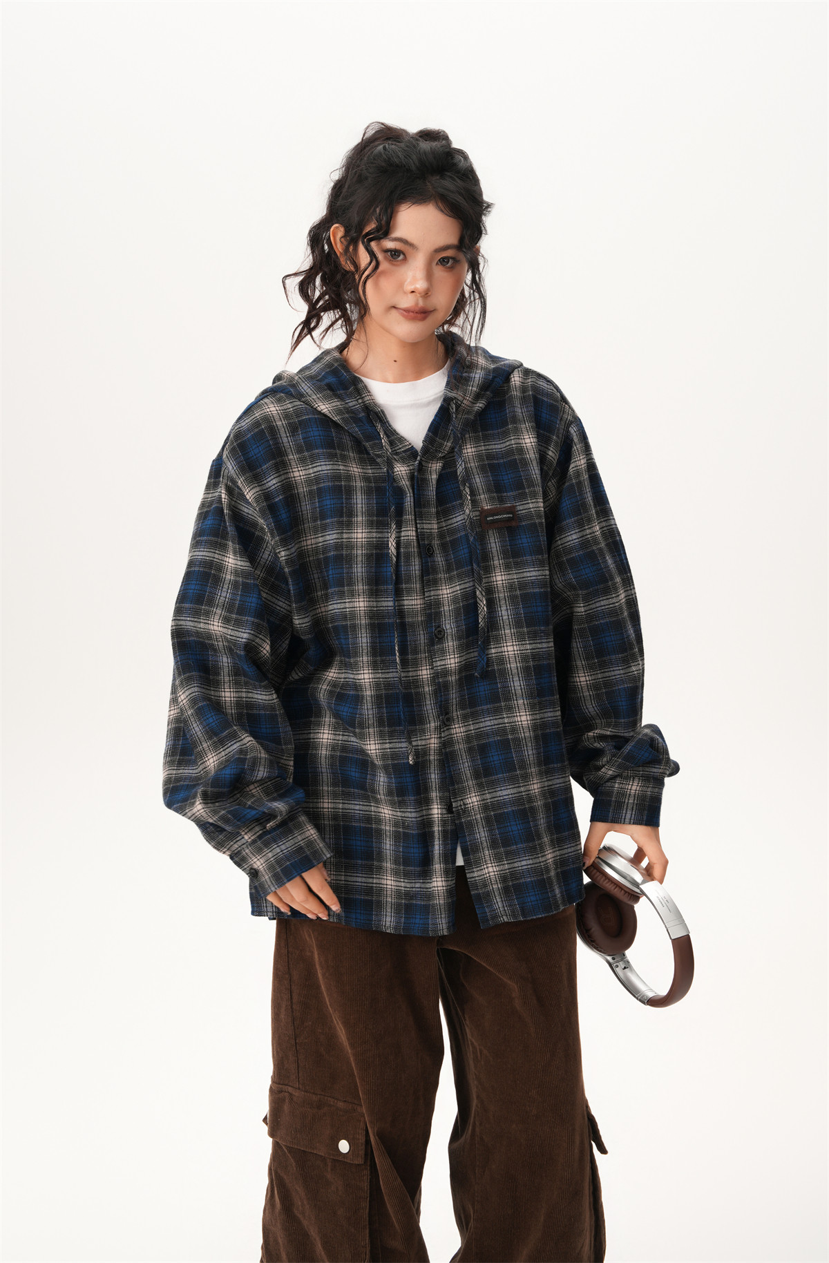 BWKA美式復古撞色格紋連帽襯衫女男春季新款潮牌寬鬆慵懶百搭襯衣