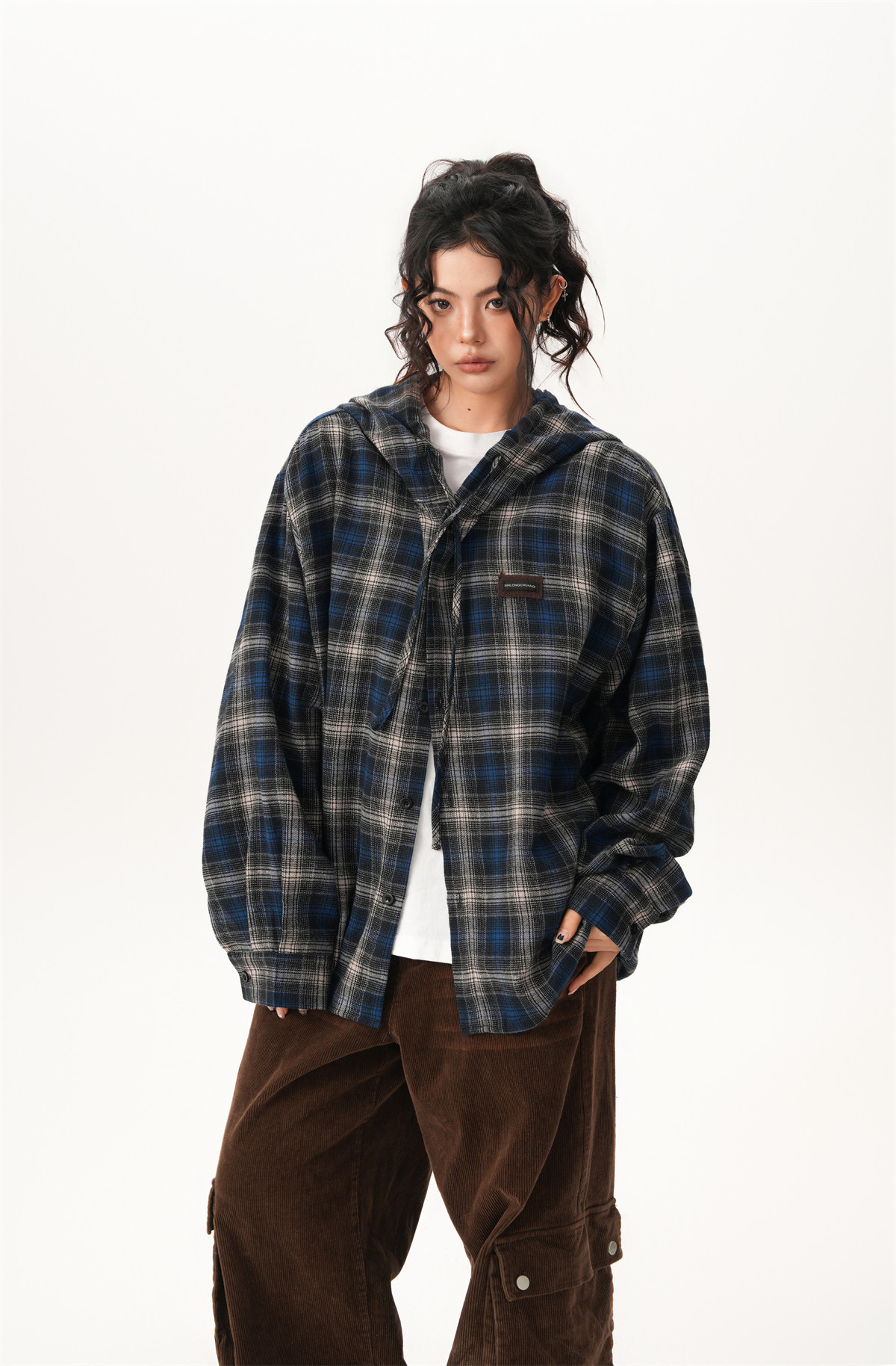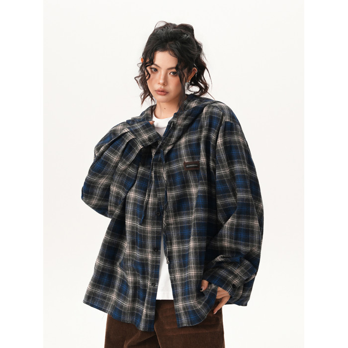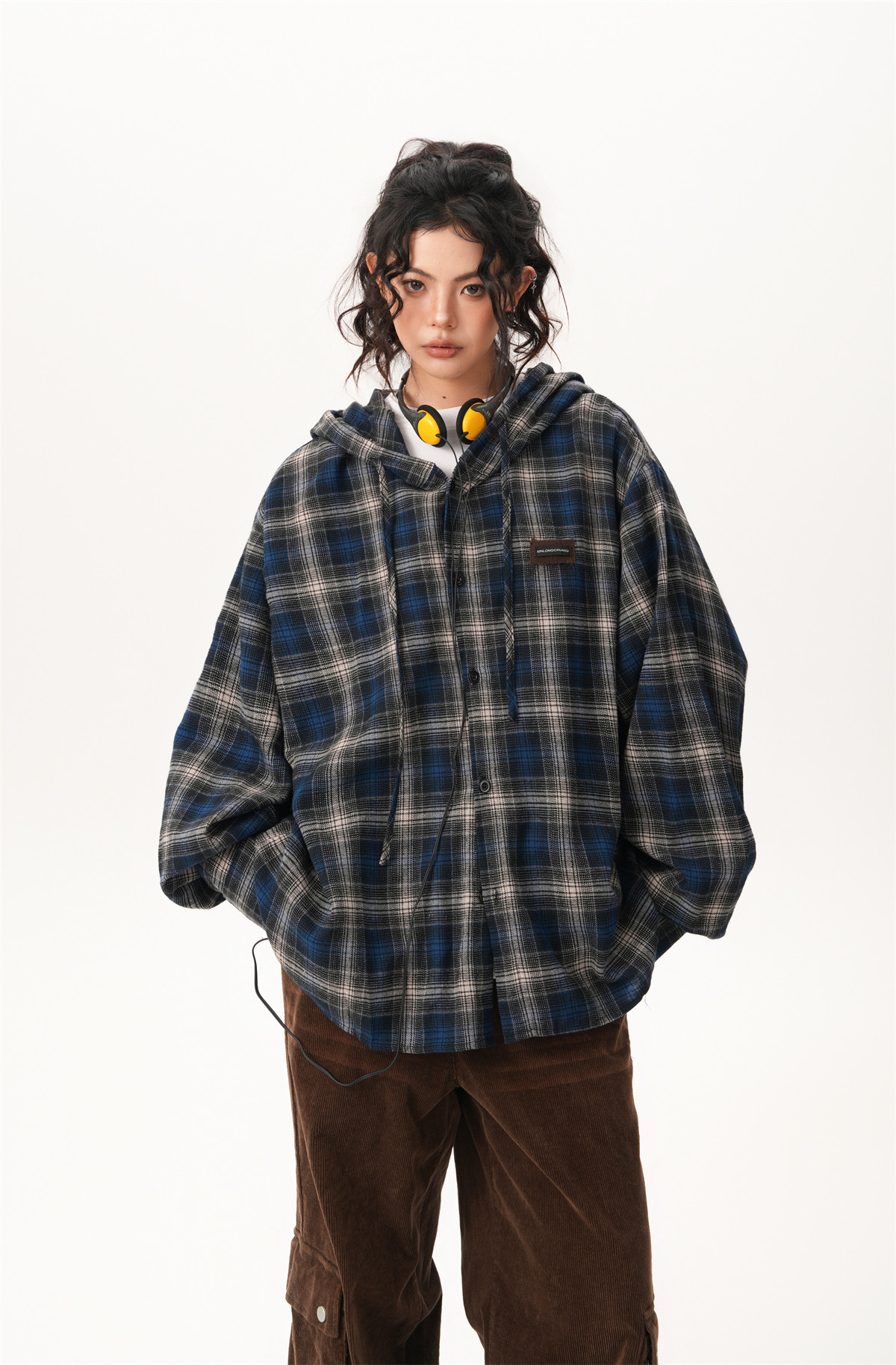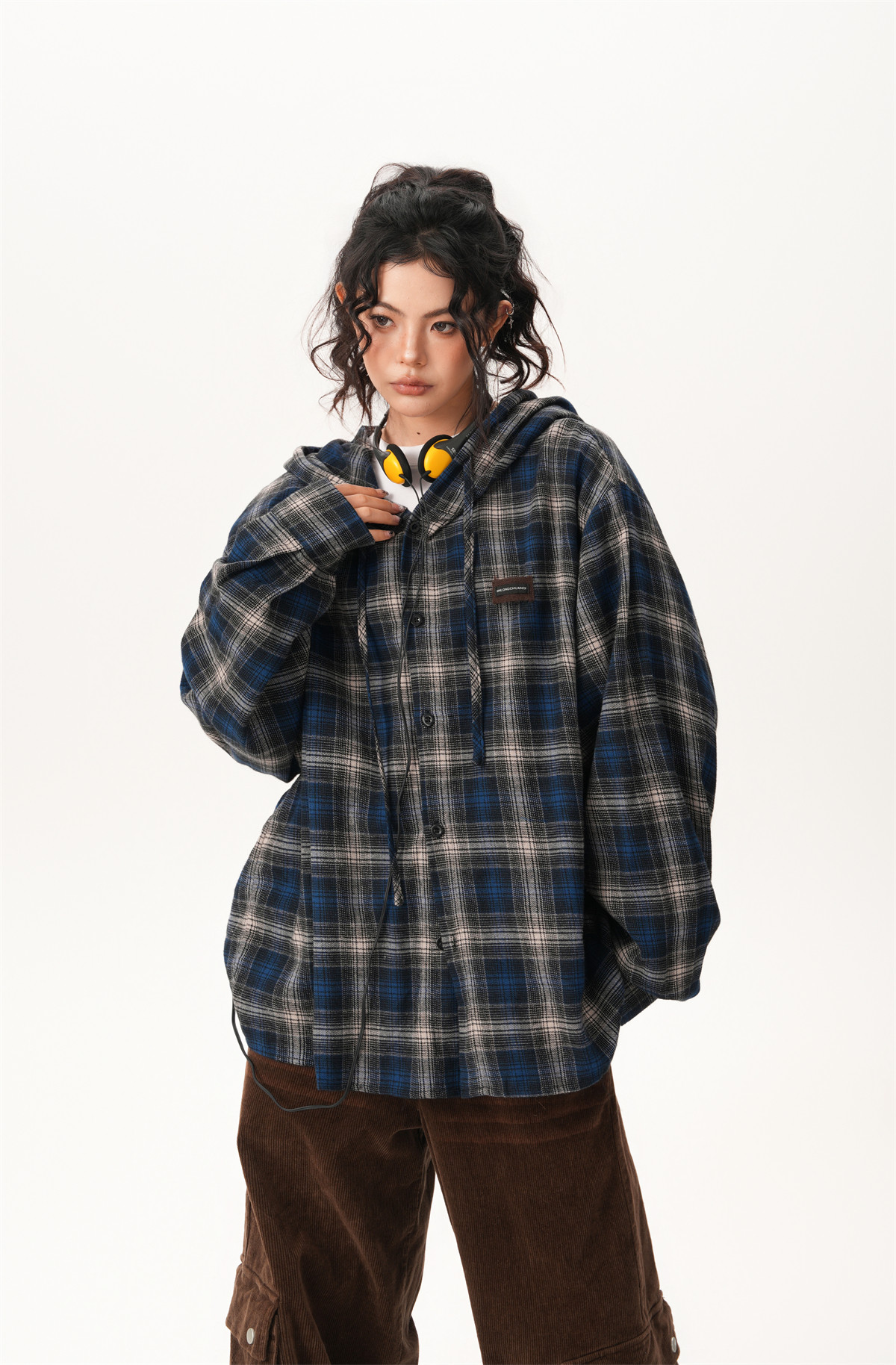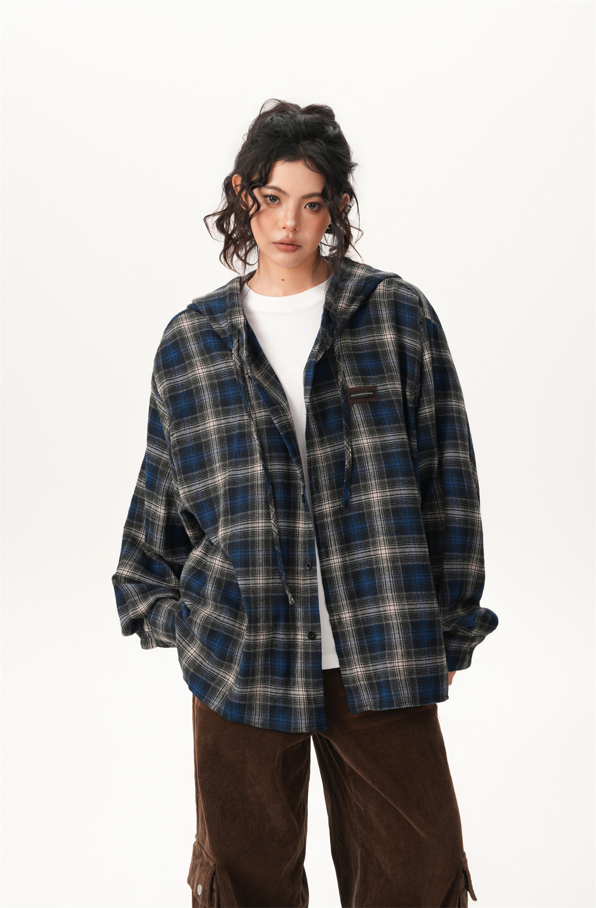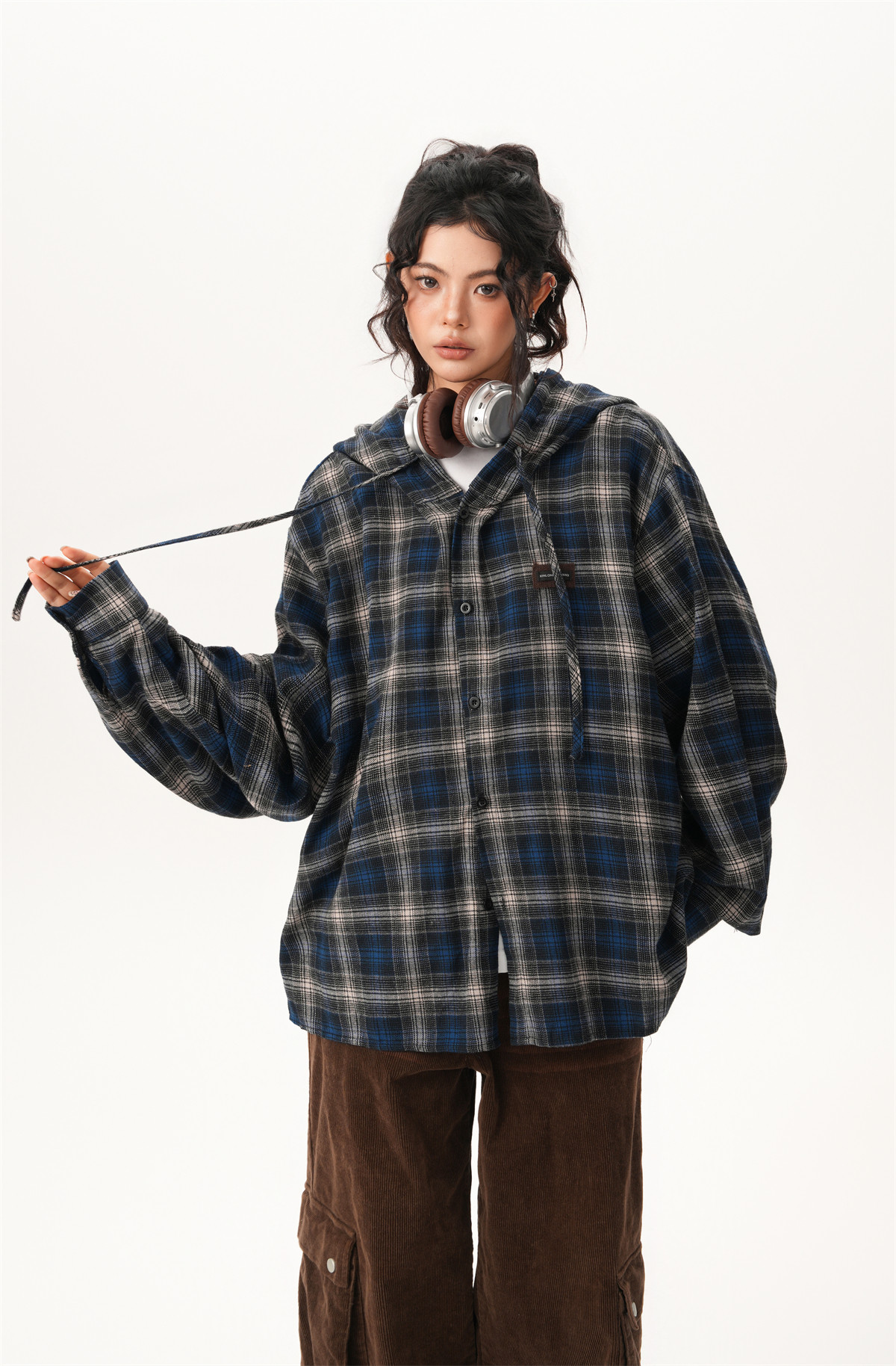 BWKA美式復古撞色格紋連帽襯衫女男春季新款潮牌寬鬆慵懶百搭襯衣