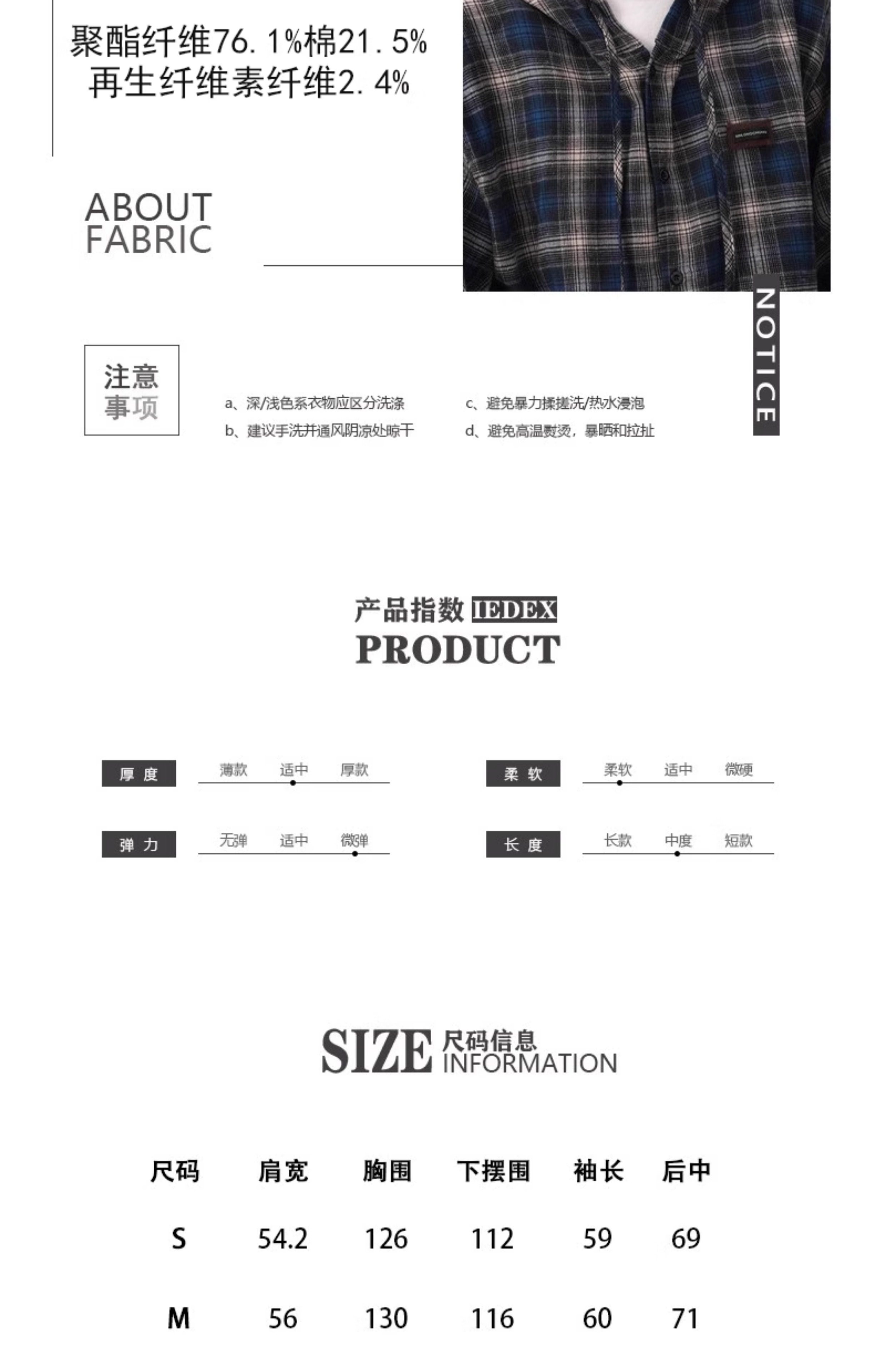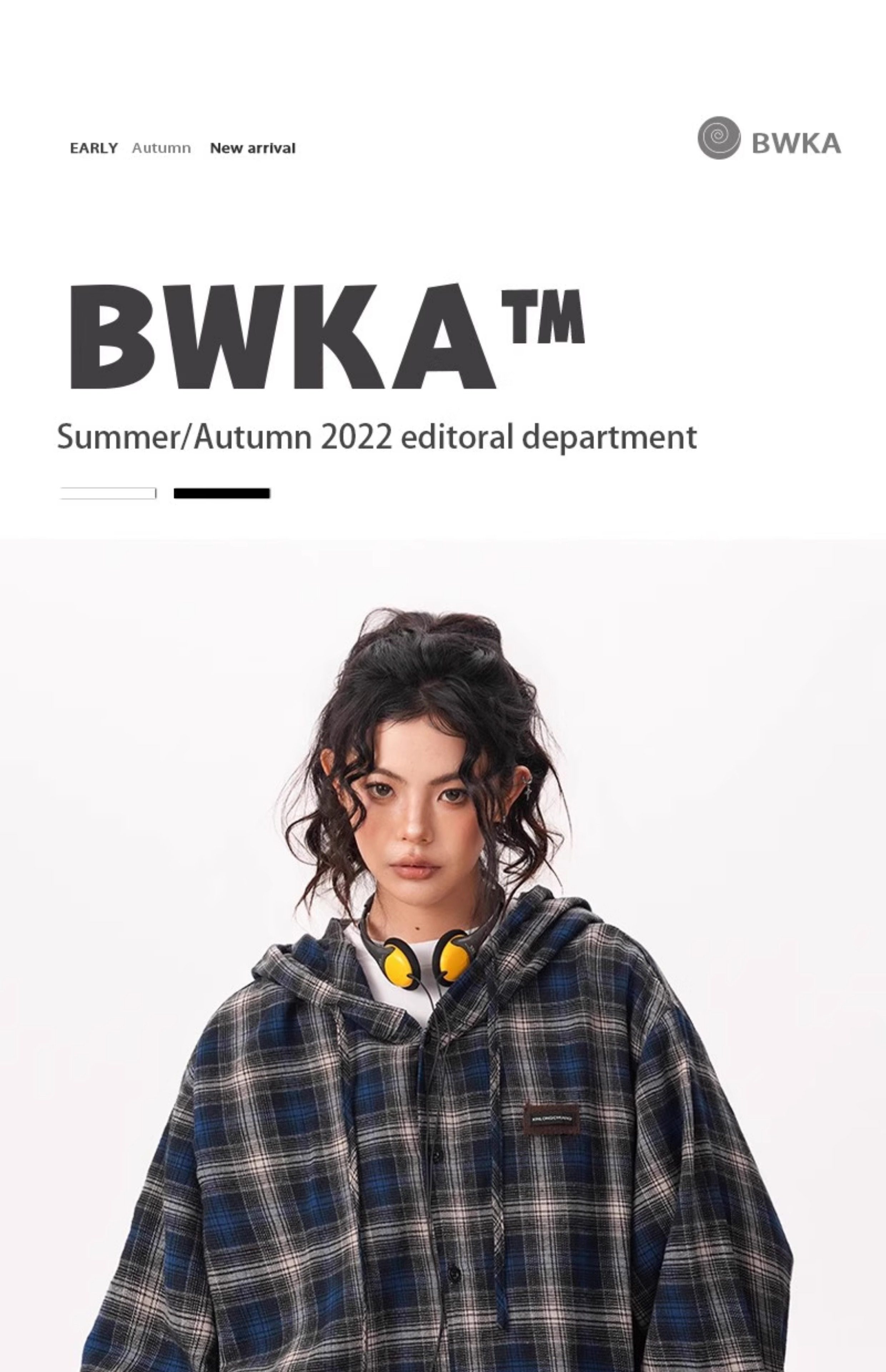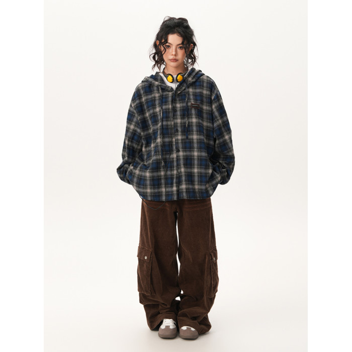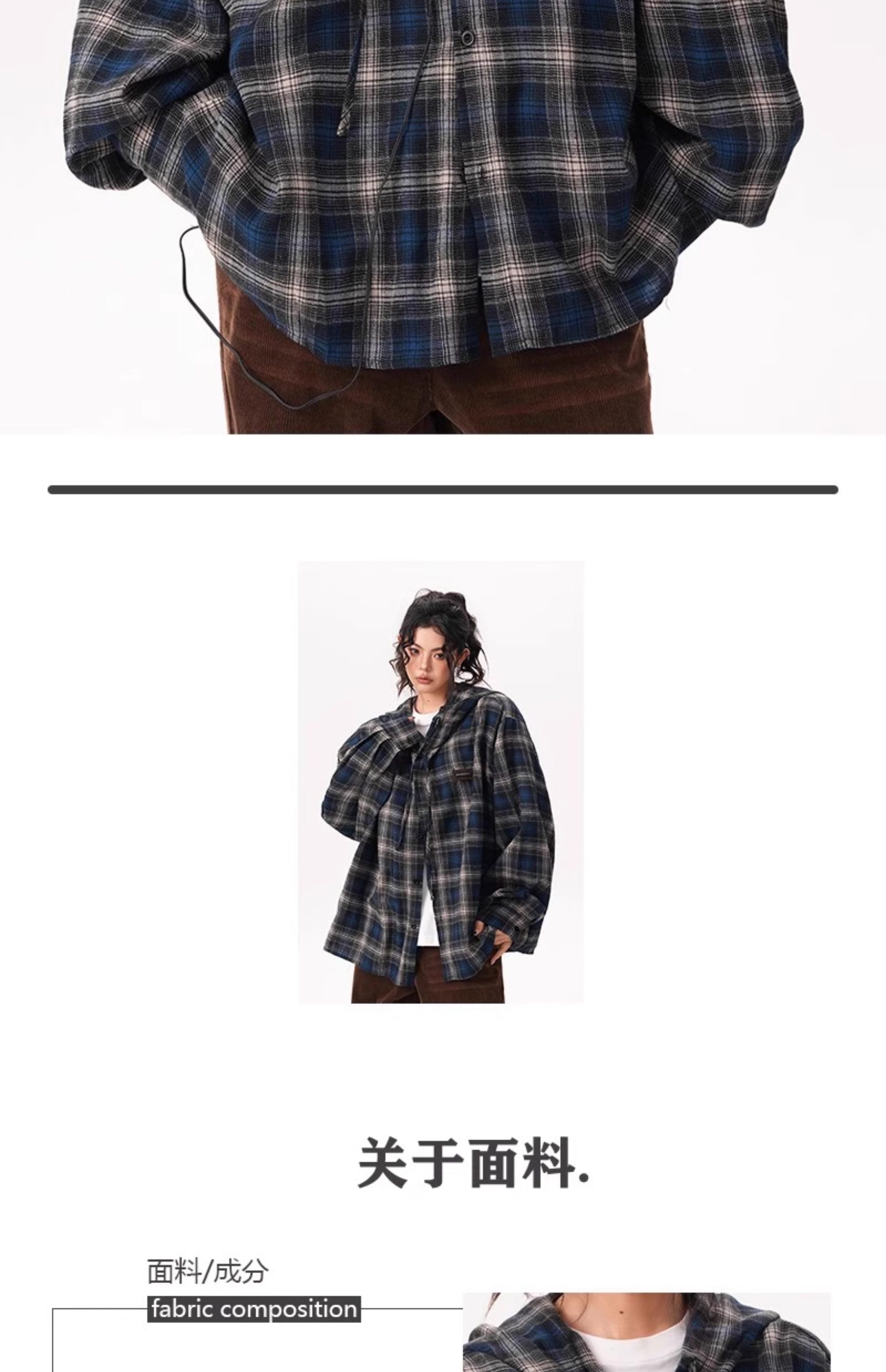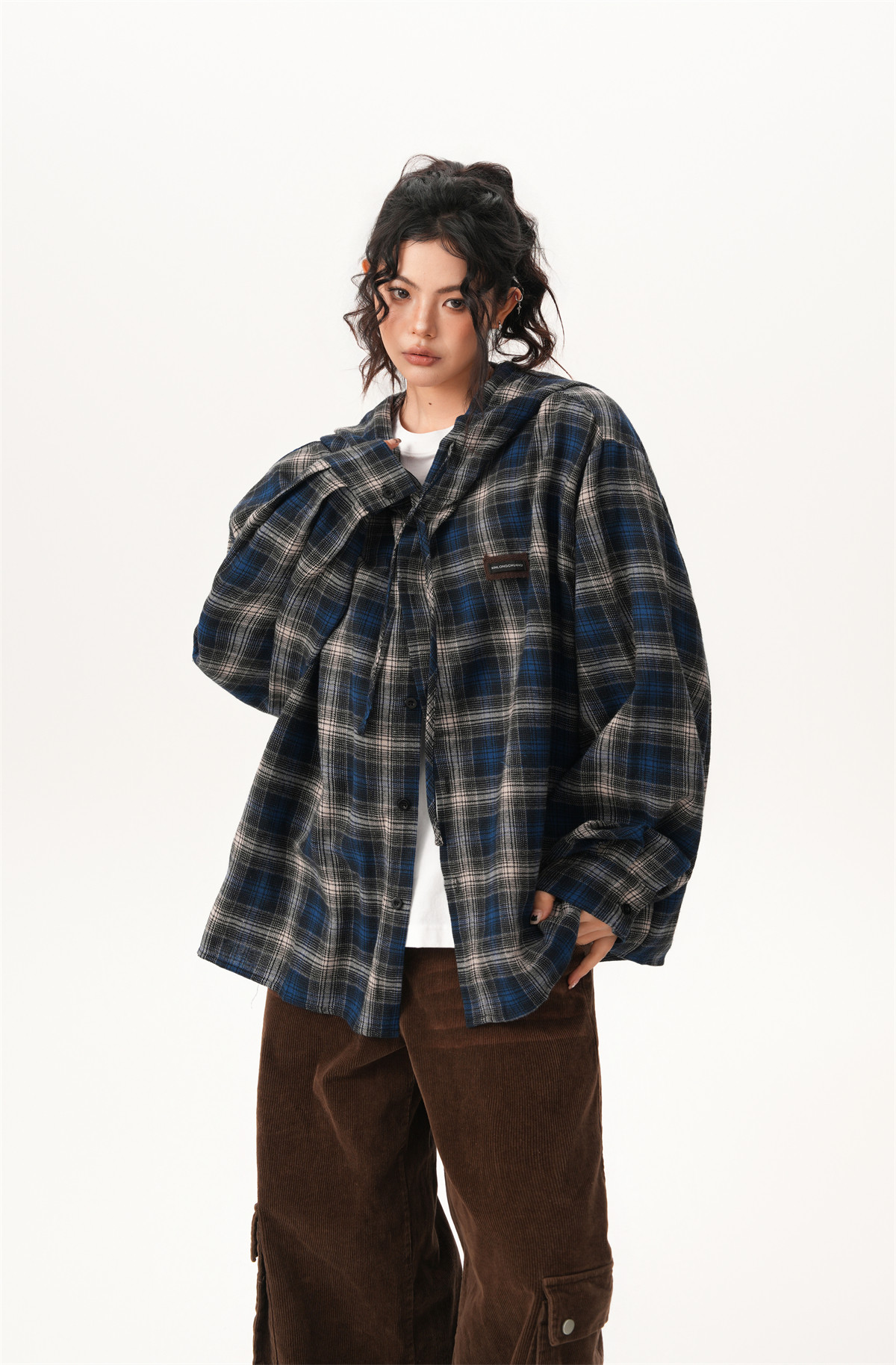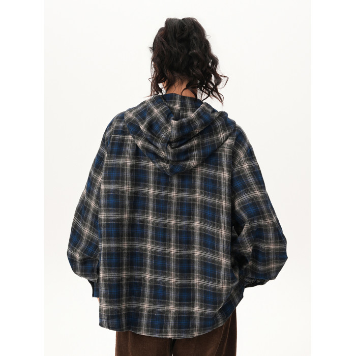 BWKA美式復古撞色格紋連帽襯衫女男春季新款潮牌寬鬆慵懶百搭襯衣