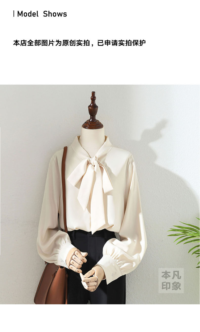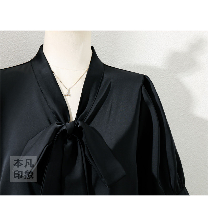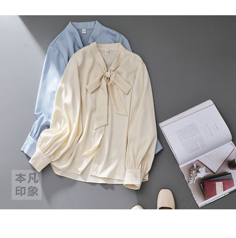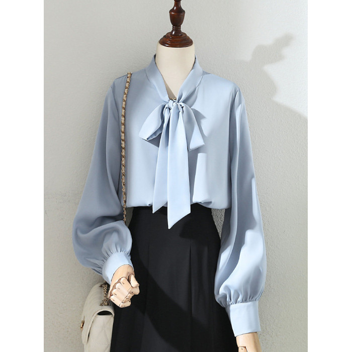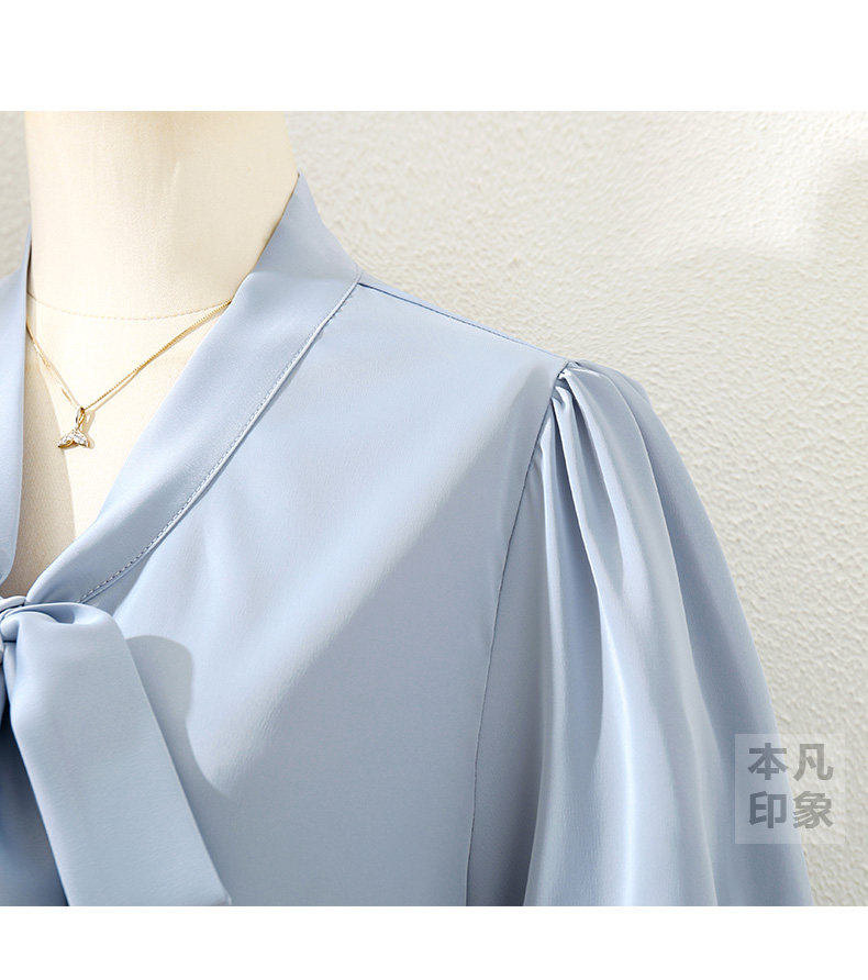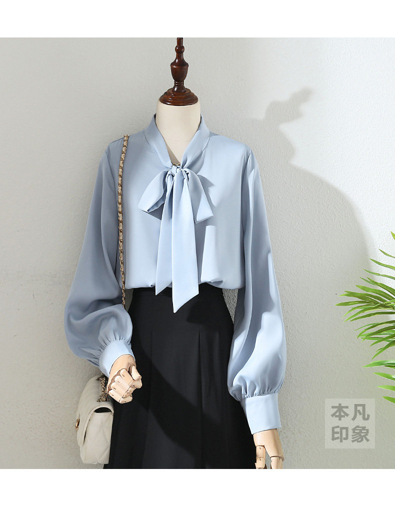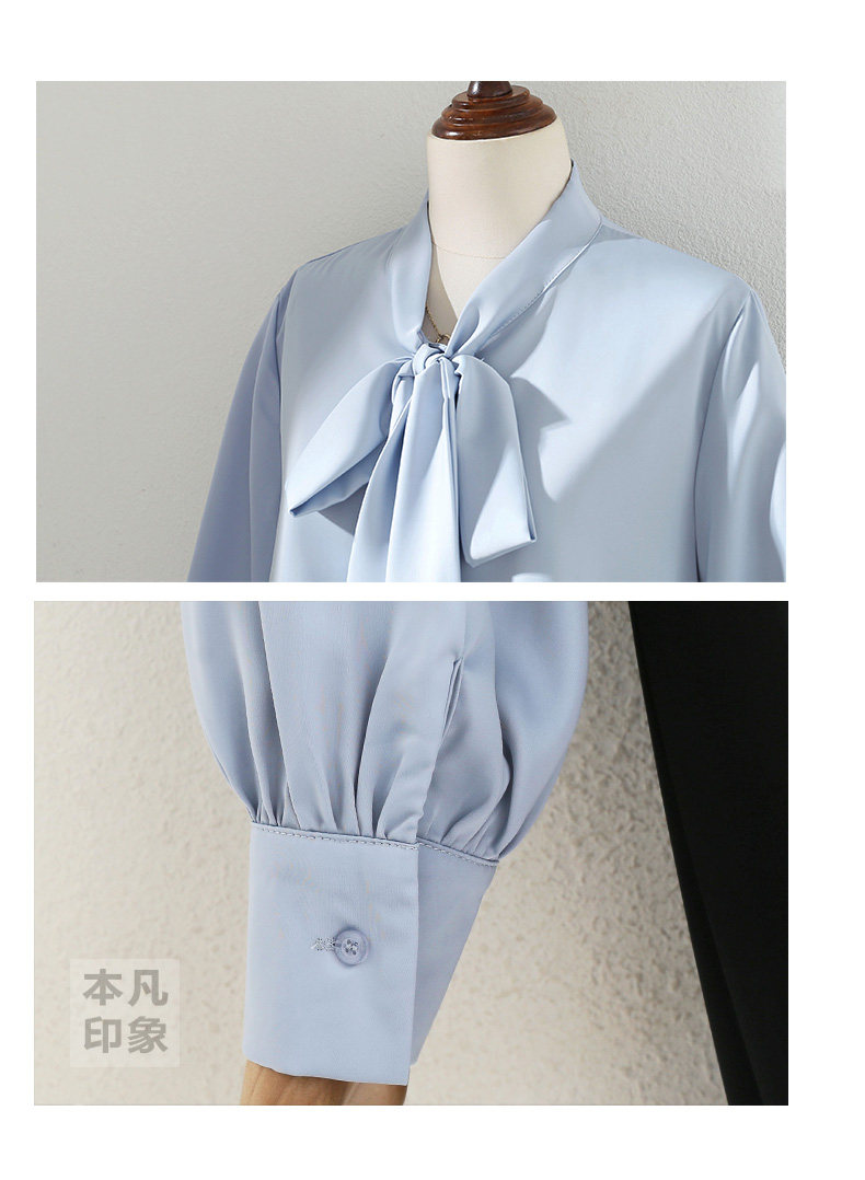 2025春秋新款藍色蝴蝶結緞面垂感襯衫女氣質燈籠袖通勤OL長袖上衣