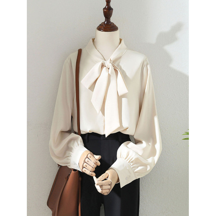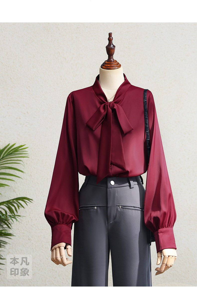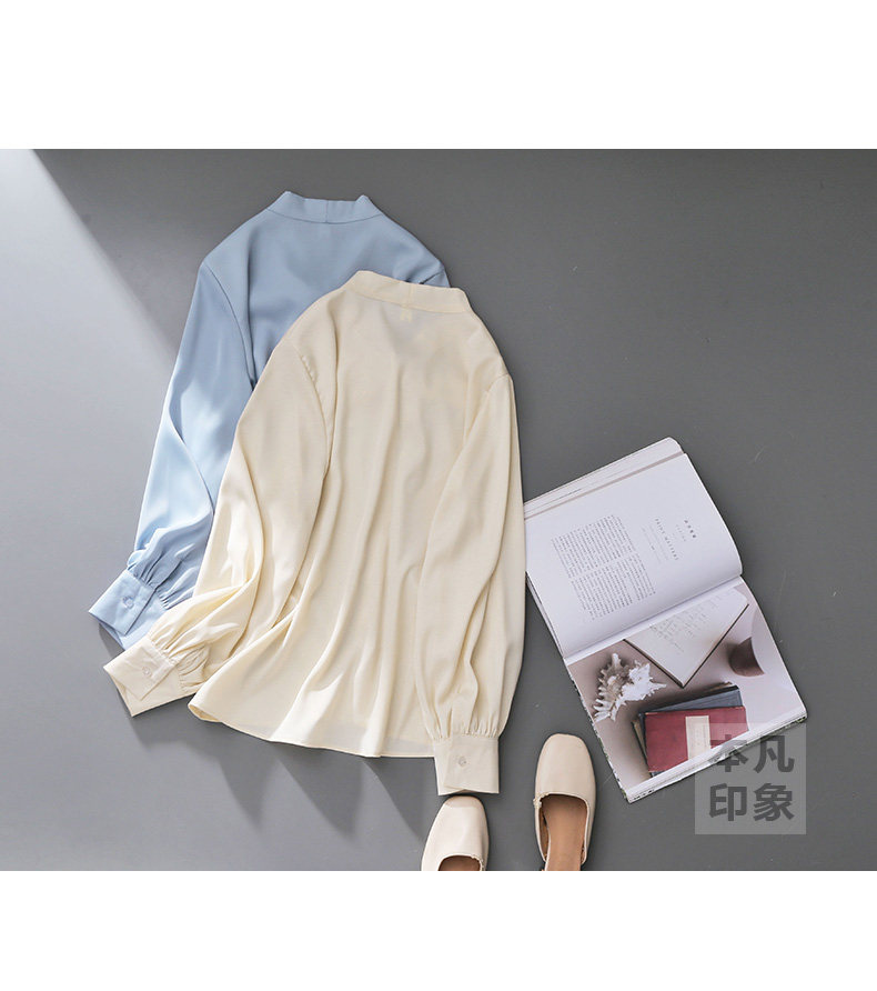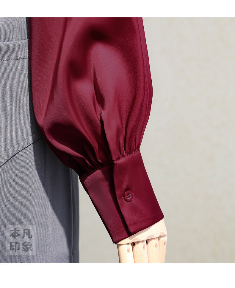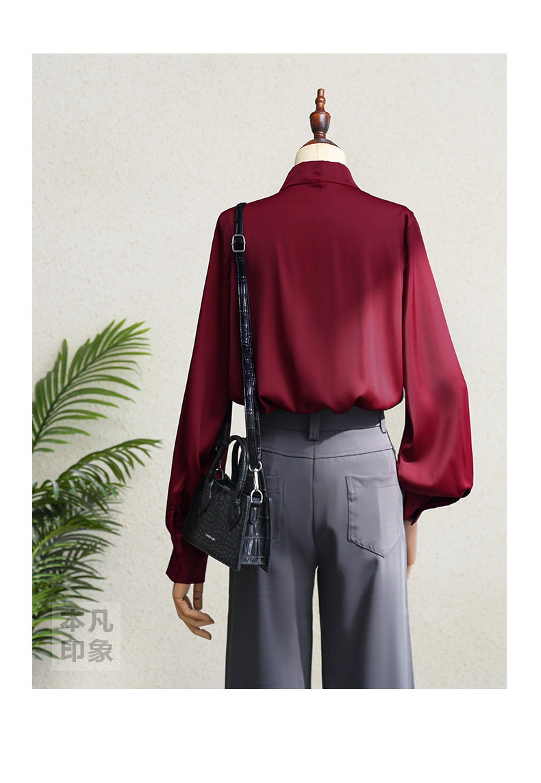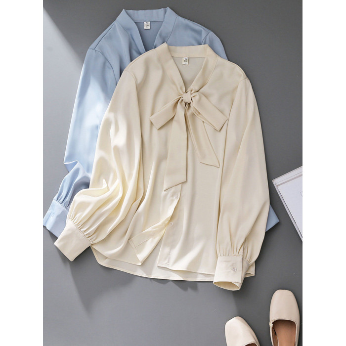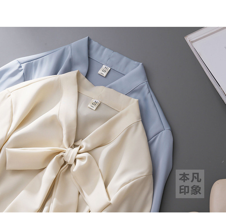 2025春秋新款藍色蝴蝶結緞面垂感襯衫女氣質燈籠袖通勤OL長袖上衣