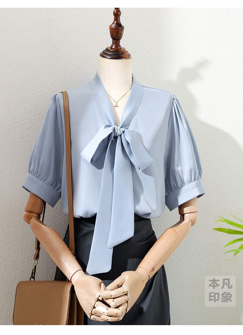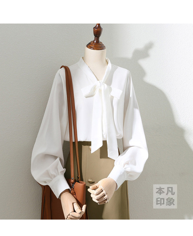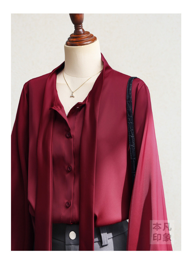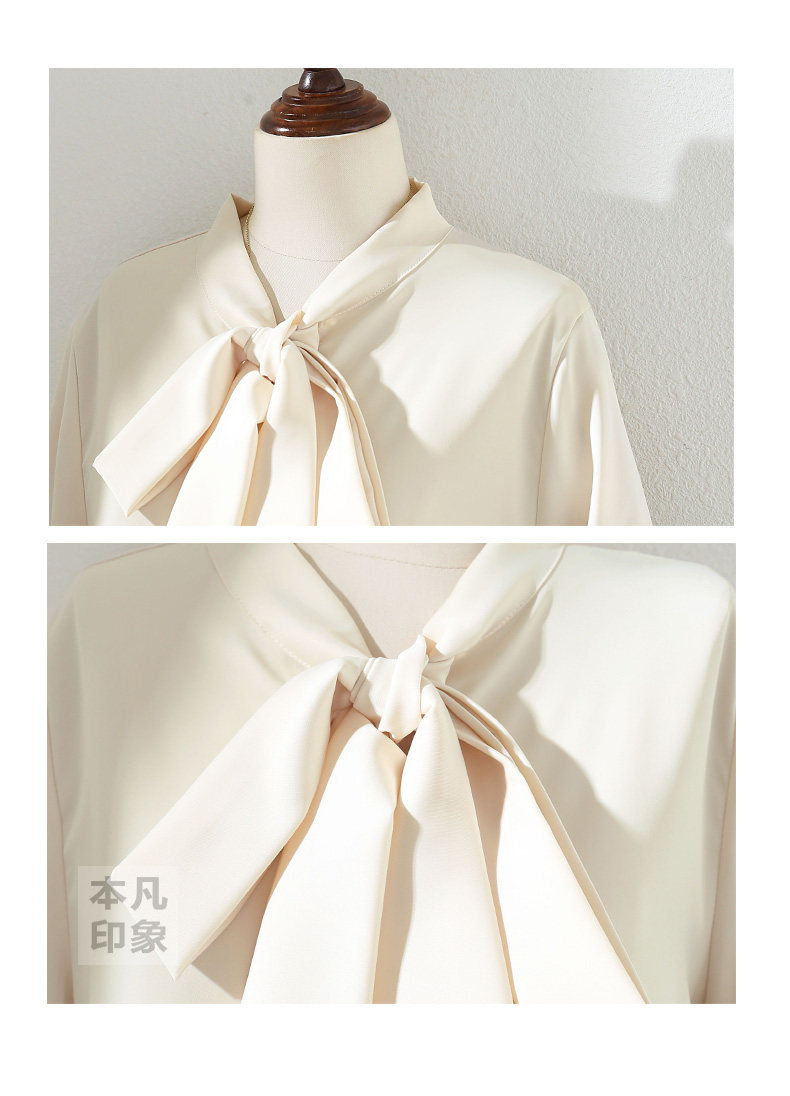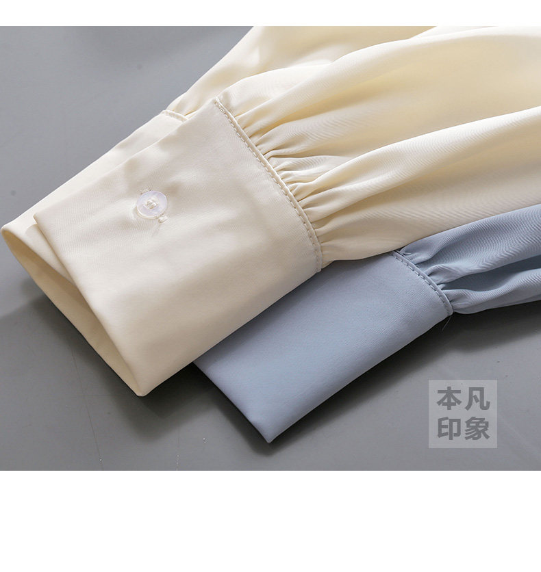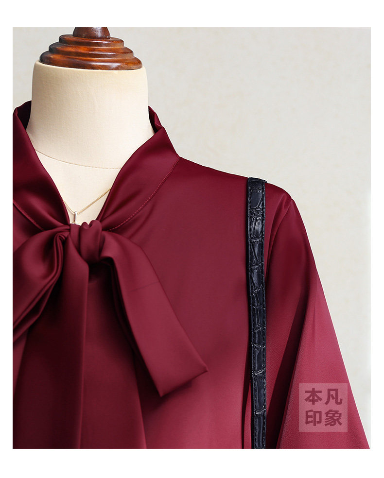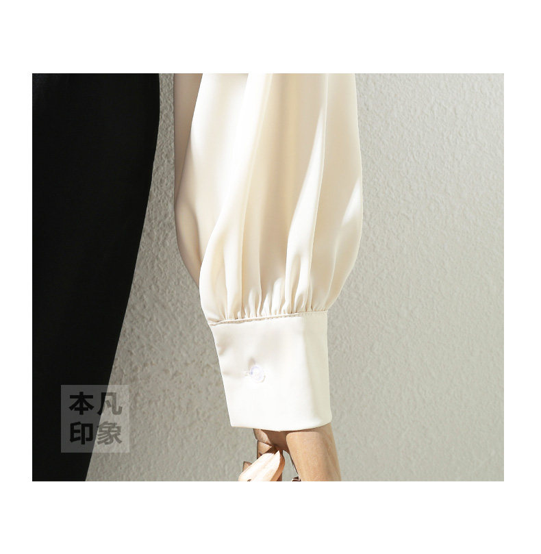 2025春秋新款藍色蝴蝶結緞面垂感襯衫女氣質燈籠袖通勤OL長袖上衣