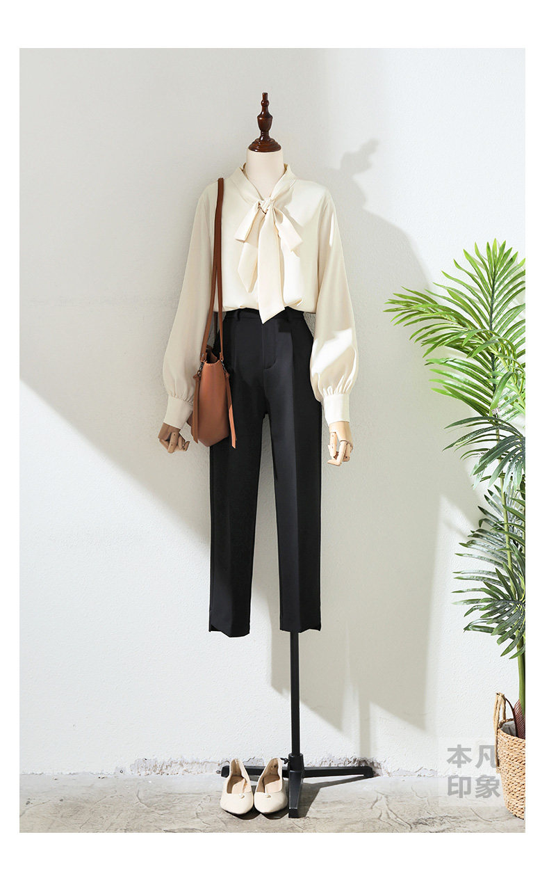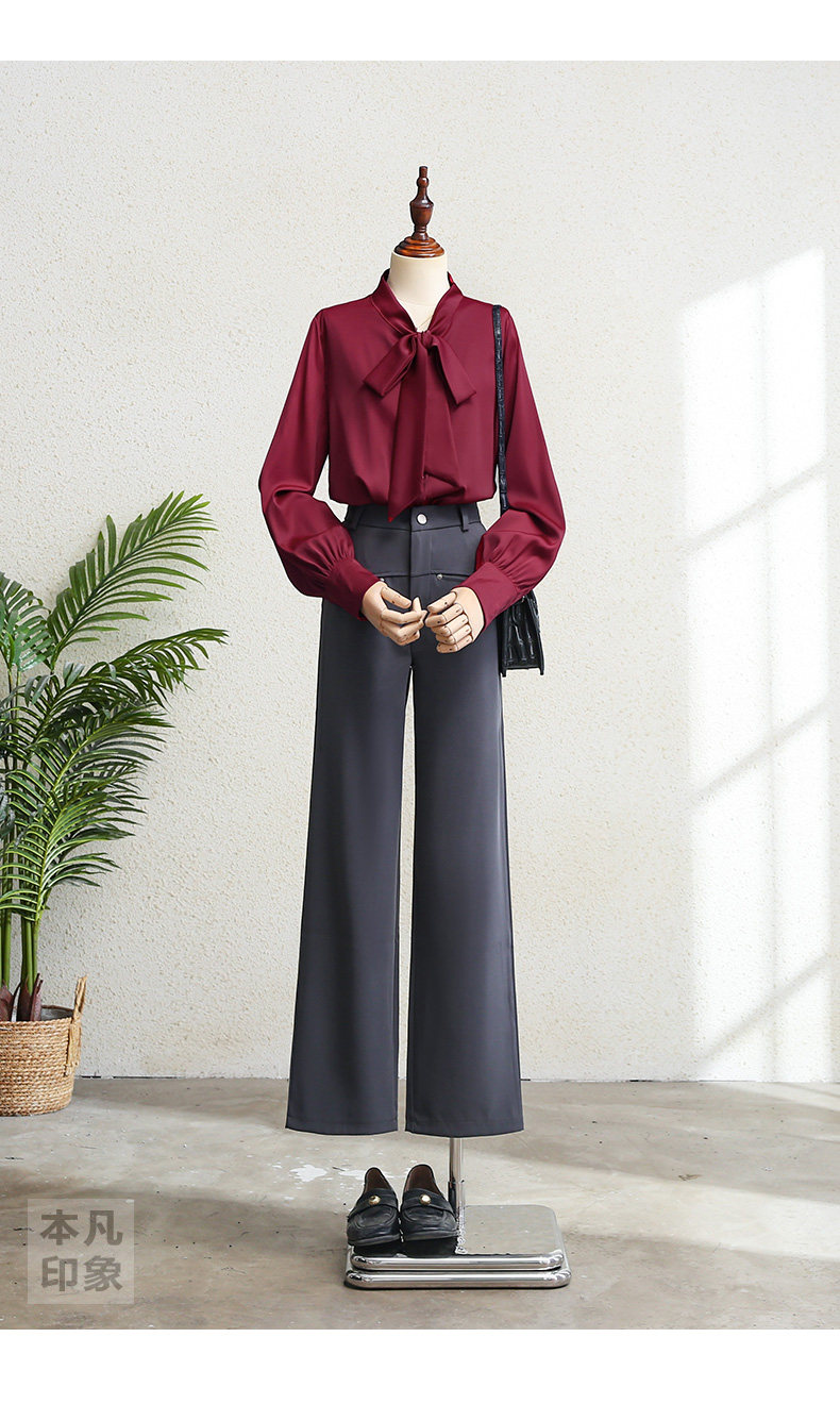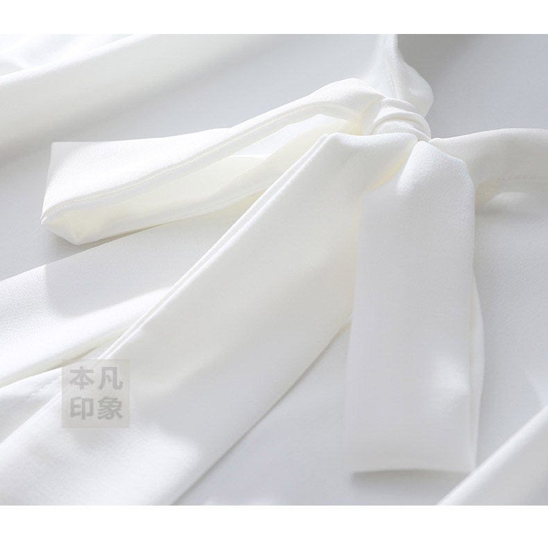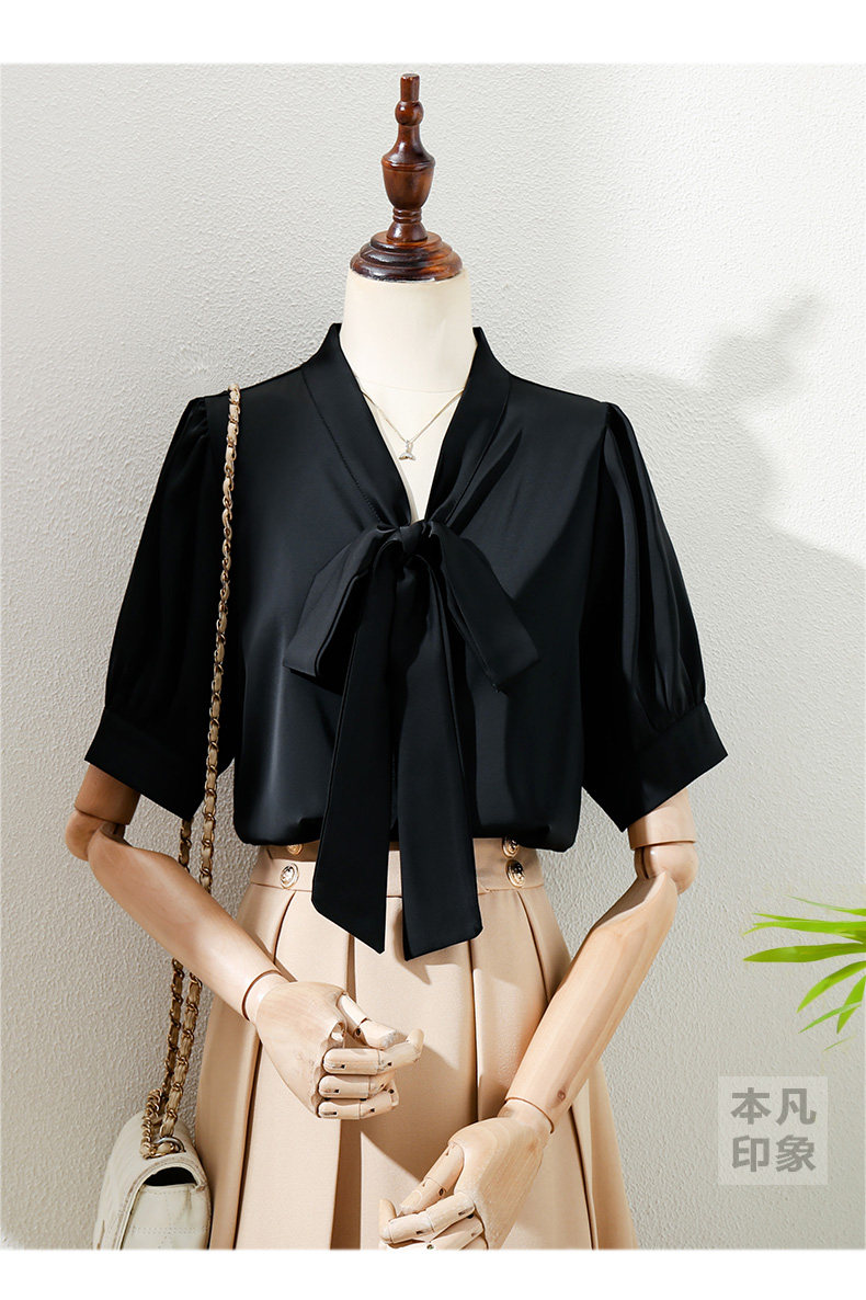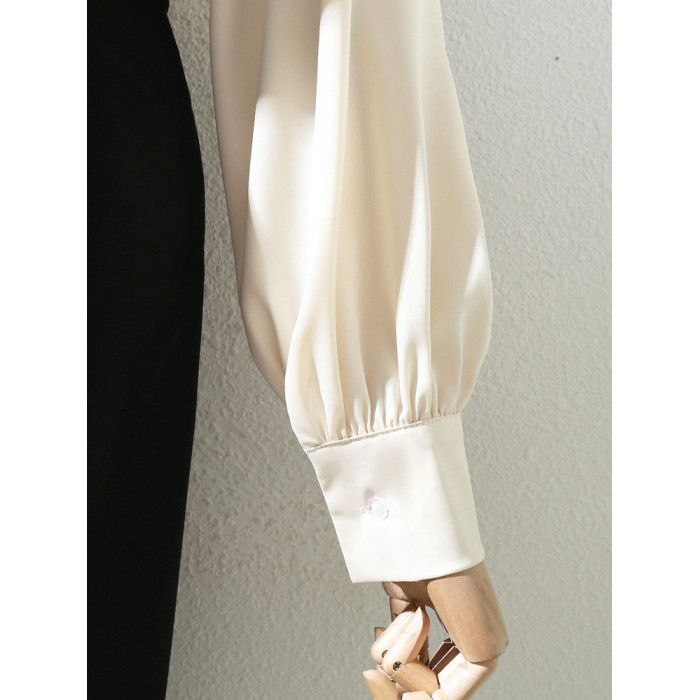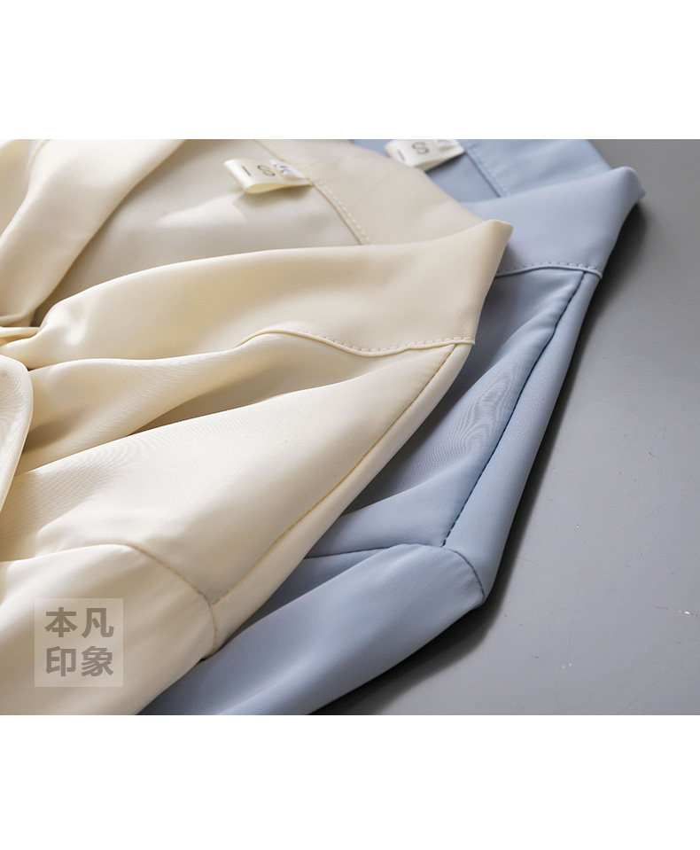 2025春秋新款藍色蝴蝶結緞面垂感襯衫女氣質燈籠袖通勤OL長袖上衣