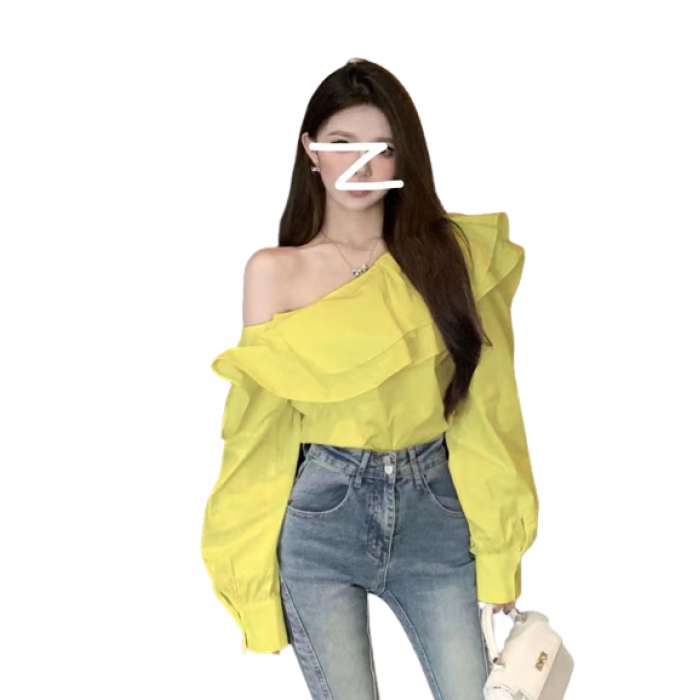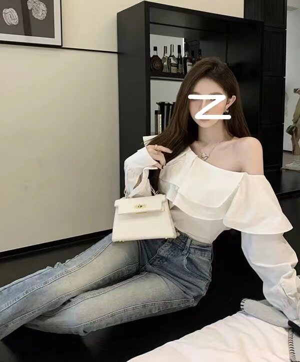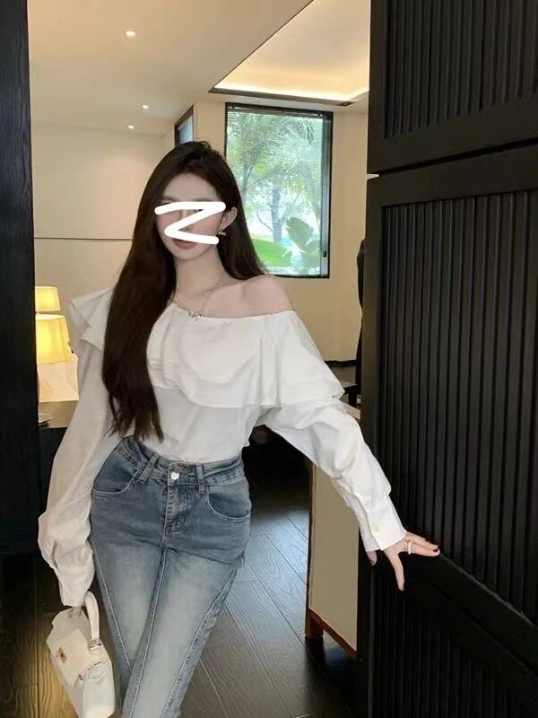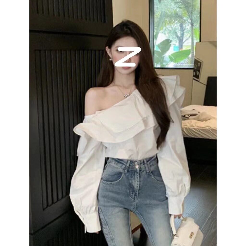 春秋荷葉邊露肩襯衫女裝2025年新款長袖法式設計感氣質名媛短上衣