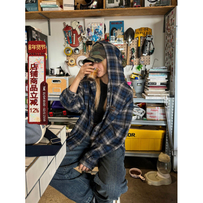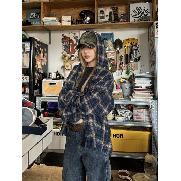 川川也撞色格紋美式連帽長袖襯衫男女復古街頭寬鬆休閒POLO衫潮牌