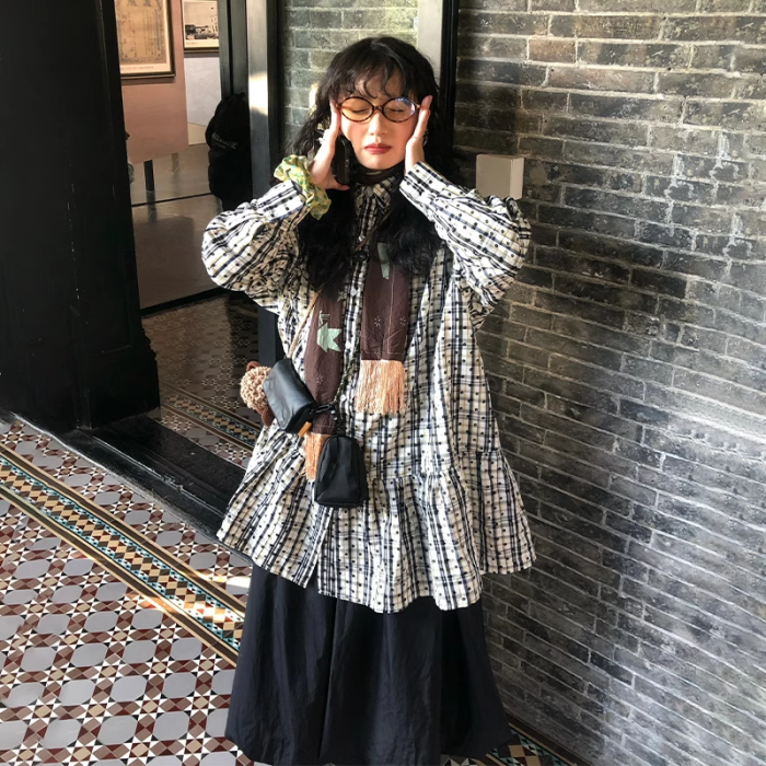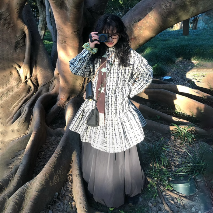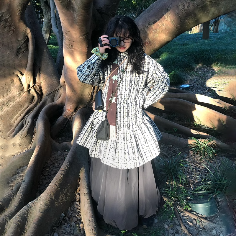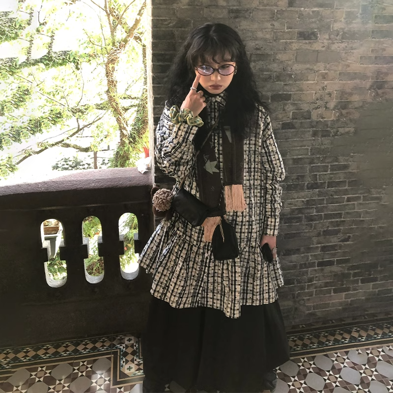 文藝復古碎花格子單排釦襯衫連衣裙曡穿內搭長款上衣女2025年春季