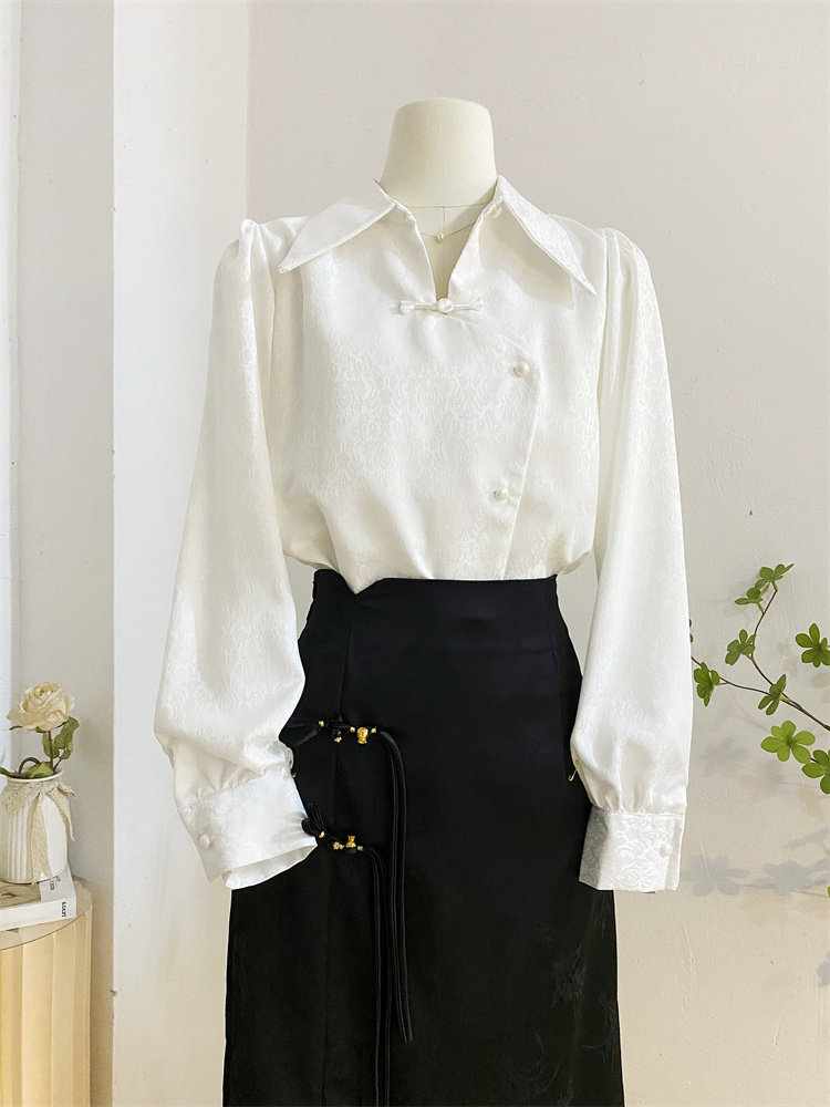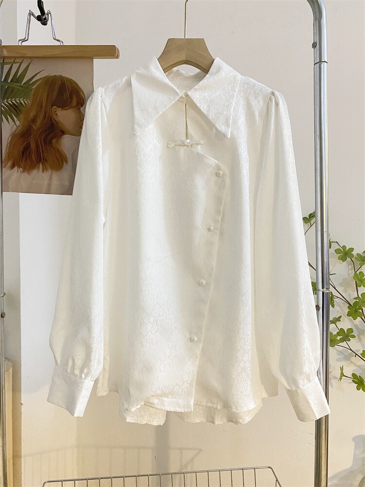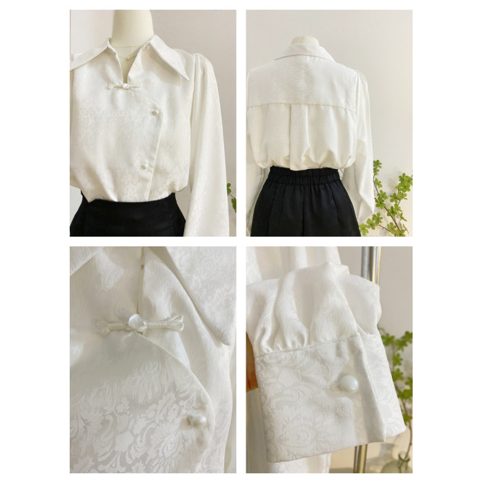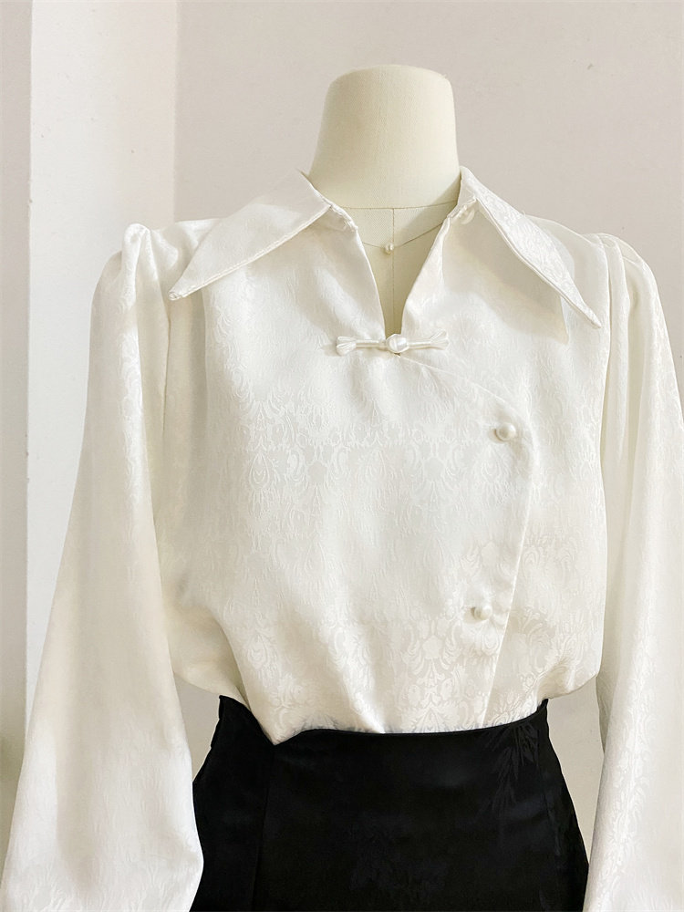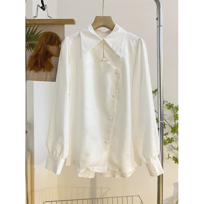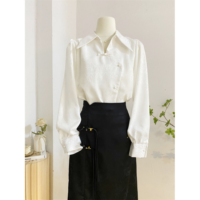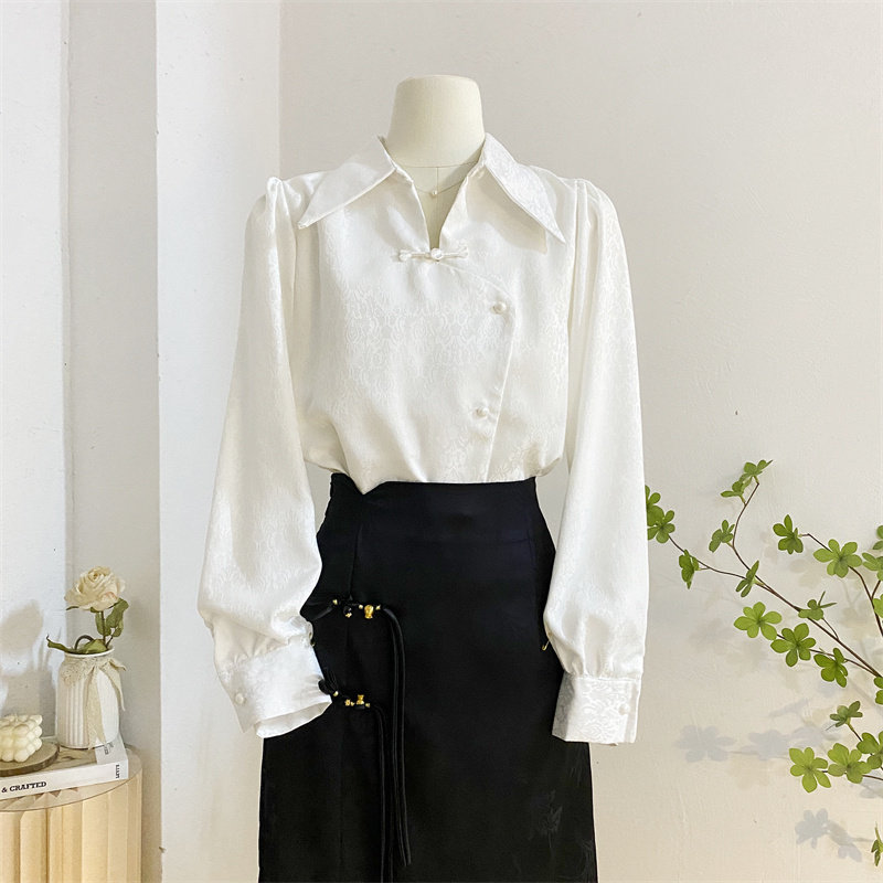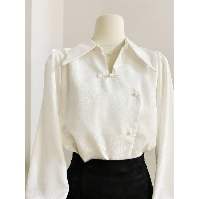 新中式繙領盤釦襯衫女長袖春季設計感風復古氣質提花小衫上衣
