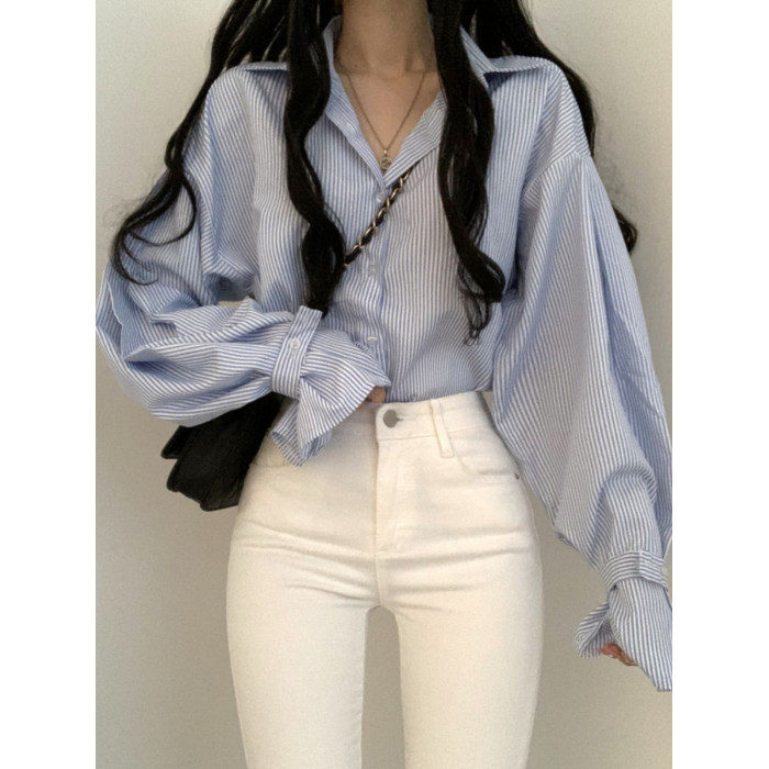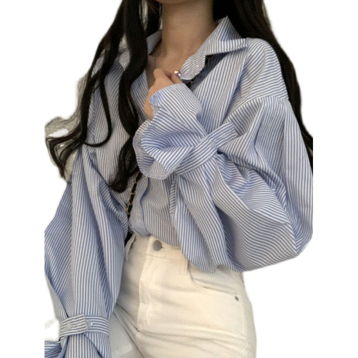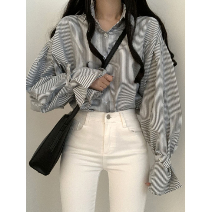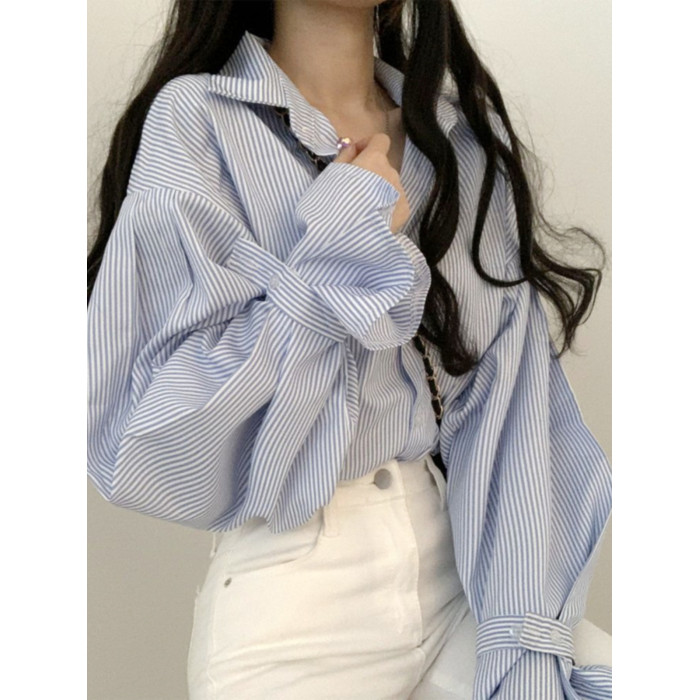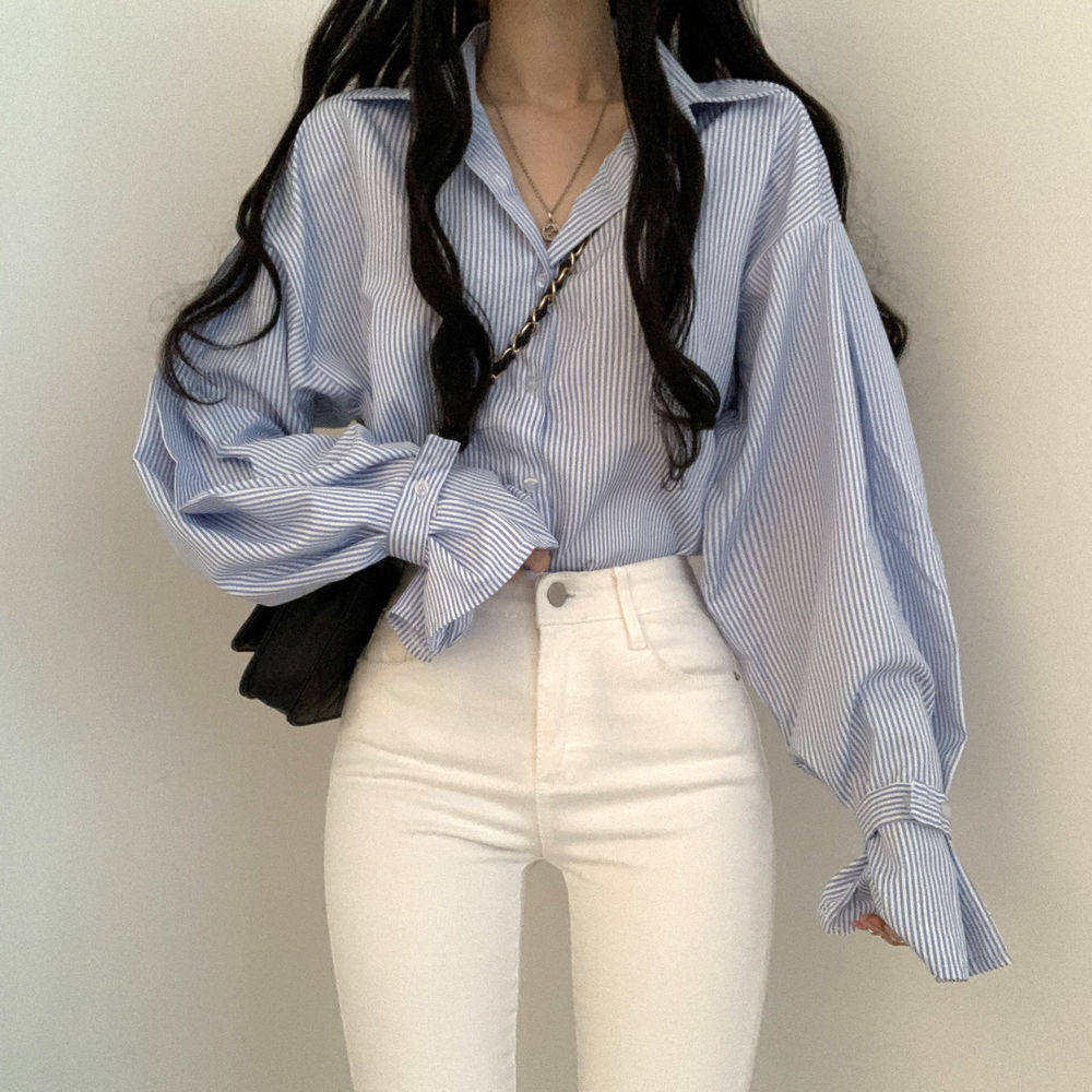 法式條紋襯衫女早春寬鬆設計感小衆別致上衣韓系chi簡約外搭襯衣