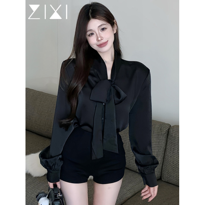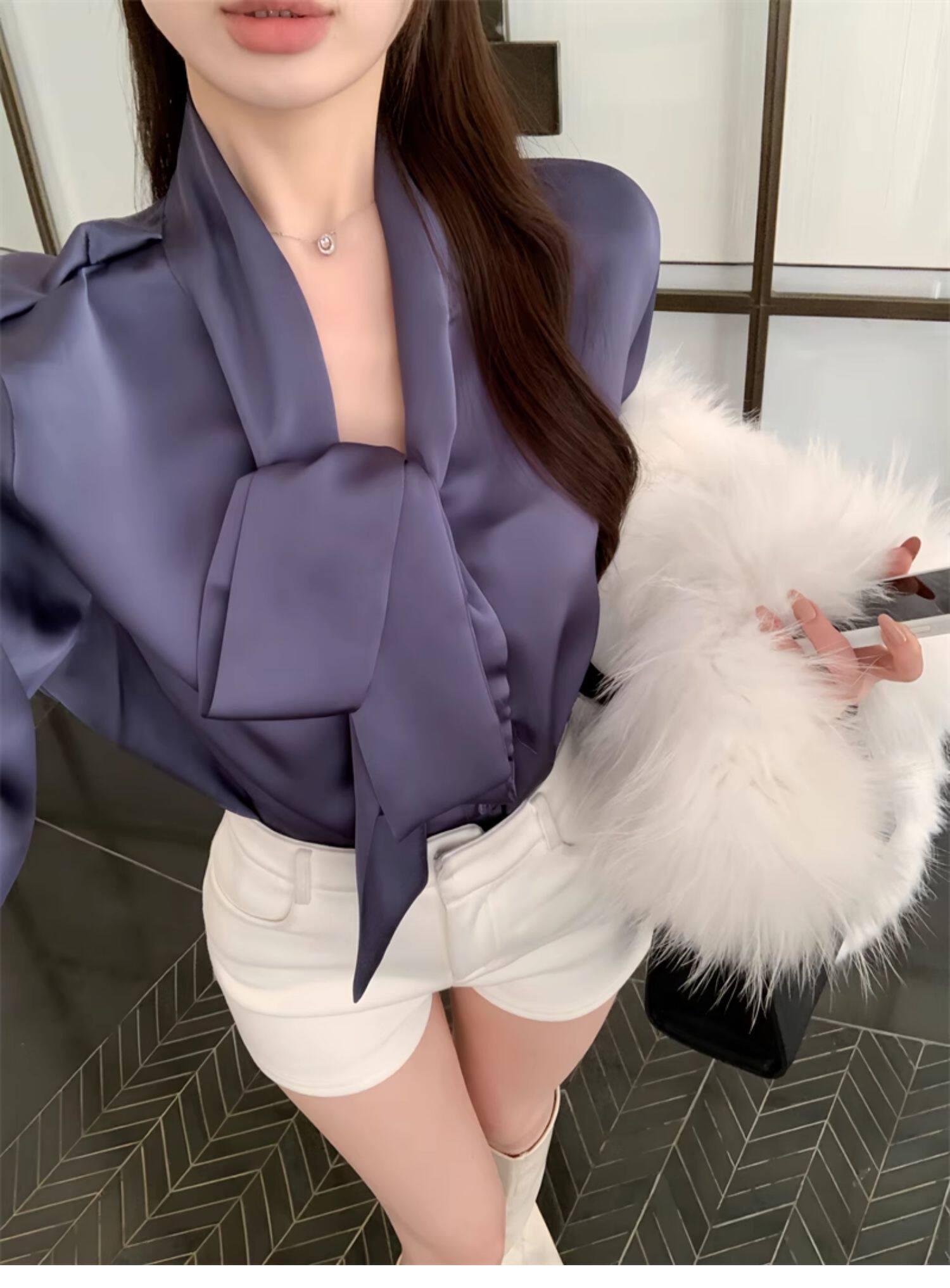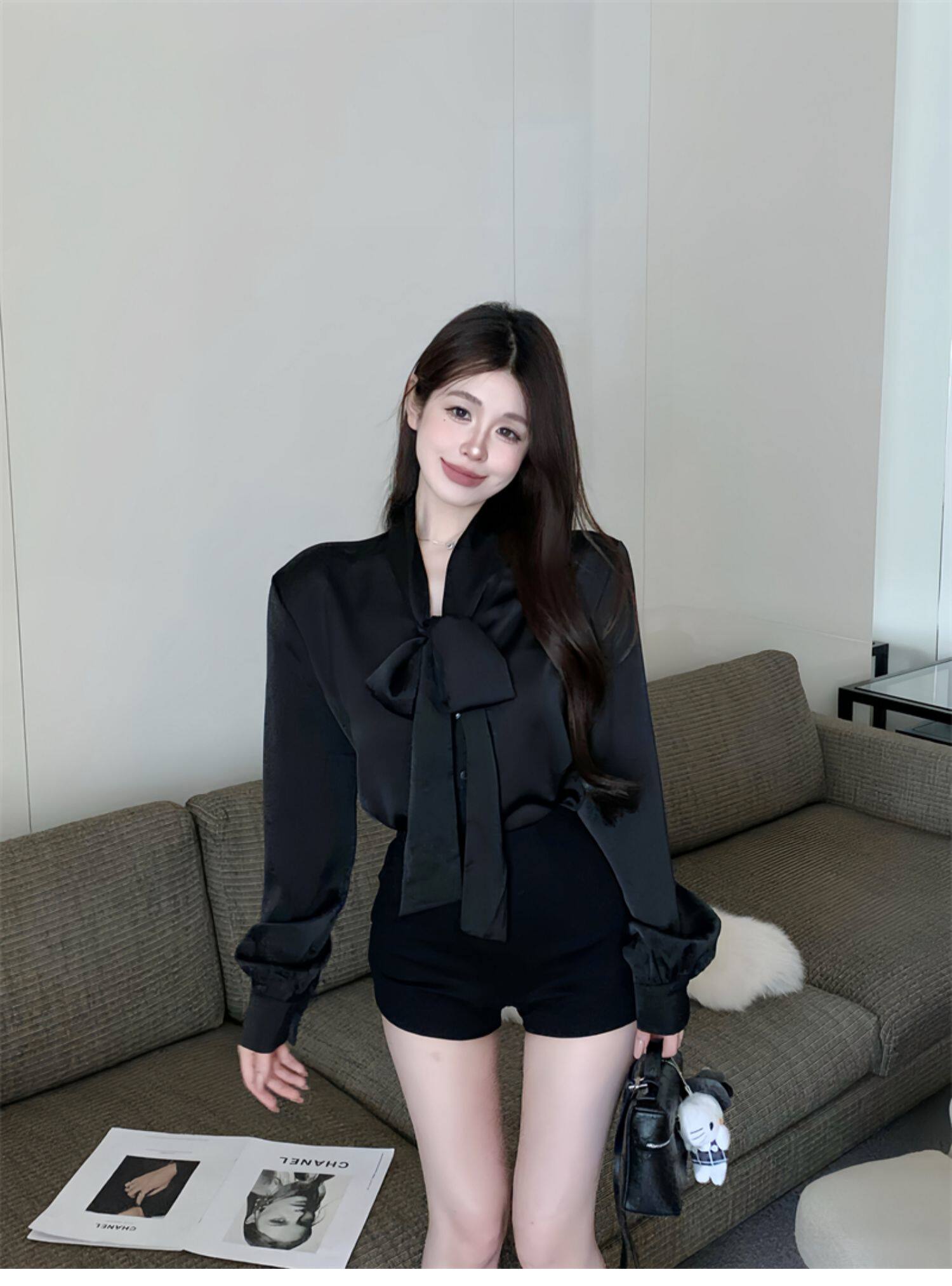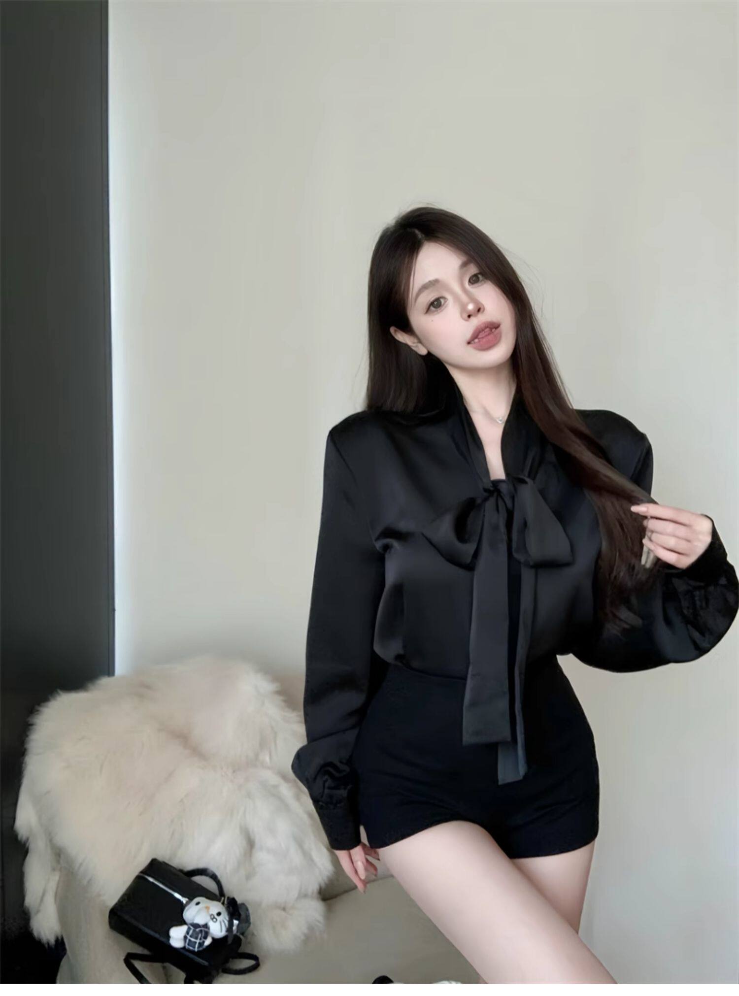 黑色緞面襯衫女2025秋季法式高級感穿搭襯衣職場通勤蝴蝶結上衣