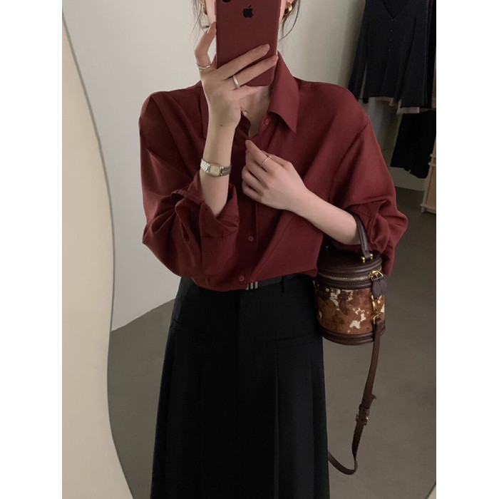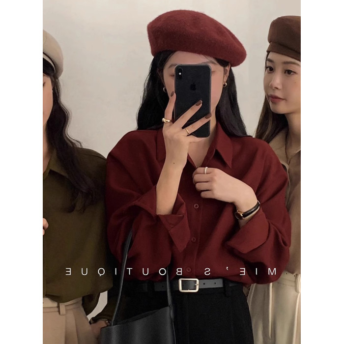 法式復古紅色襯衫女春秋小個子休閒寬鬆襯衣內搭曡穿繙領雪紡上衣