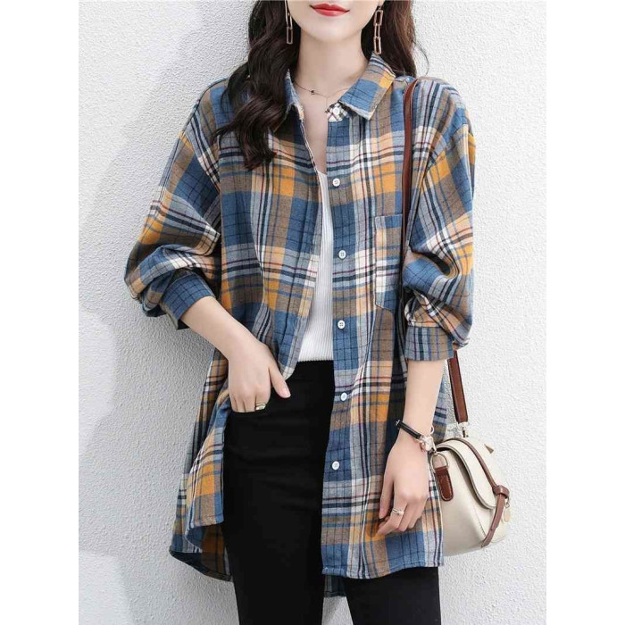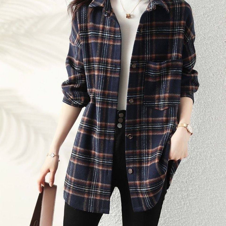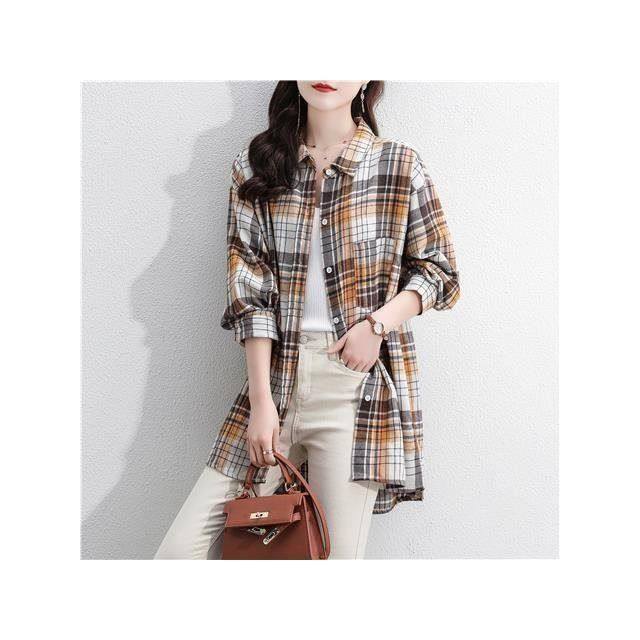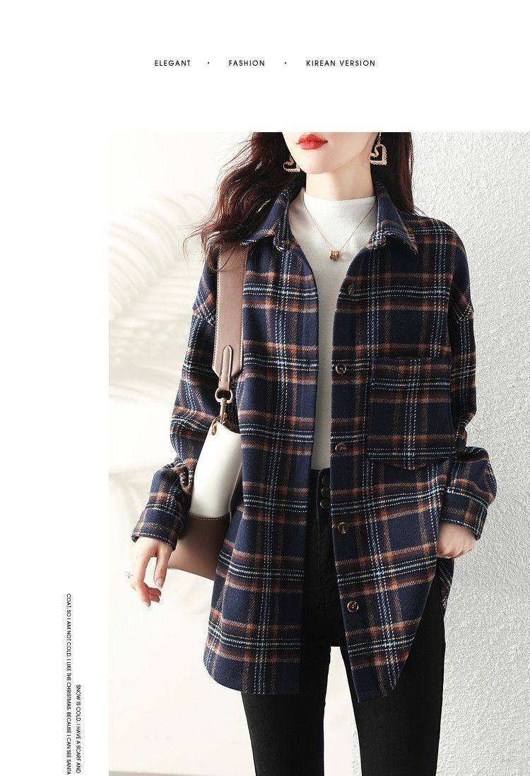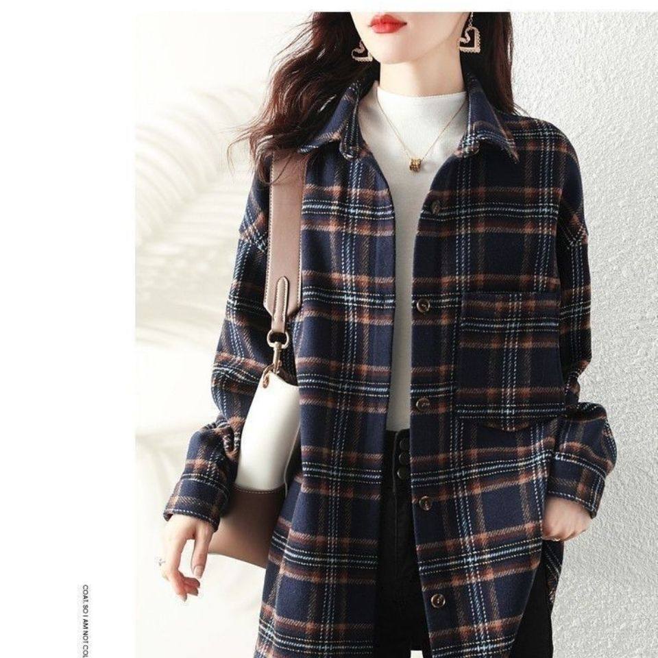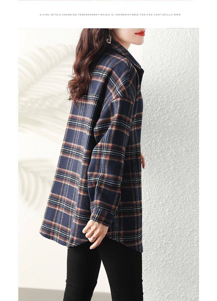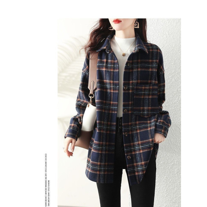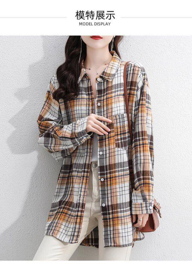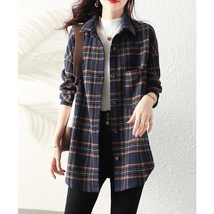 格子襯衫女長袖2023韓版春秋磨毛寬鬆中長款百搭曡穿上衣外套洋氣