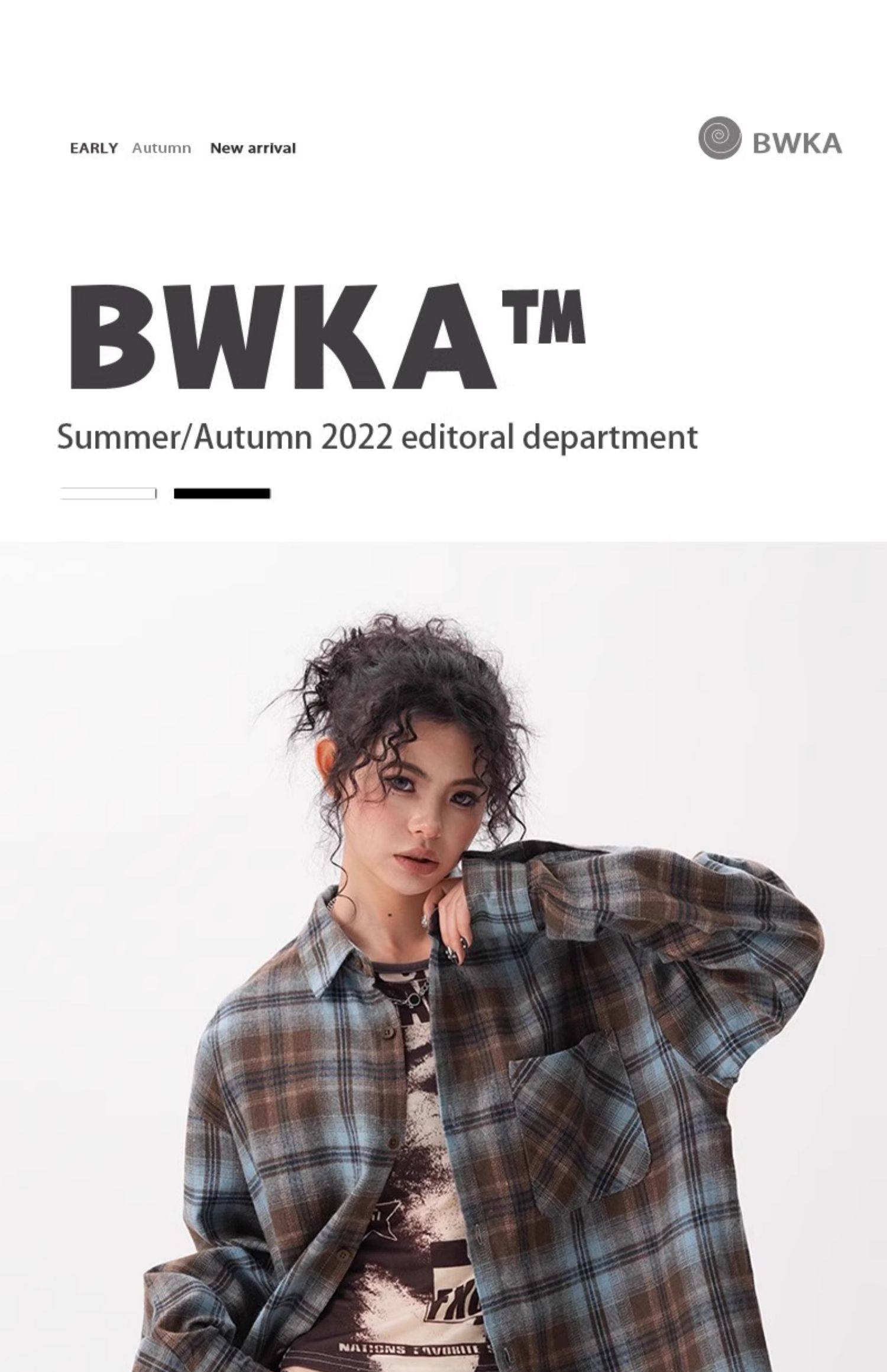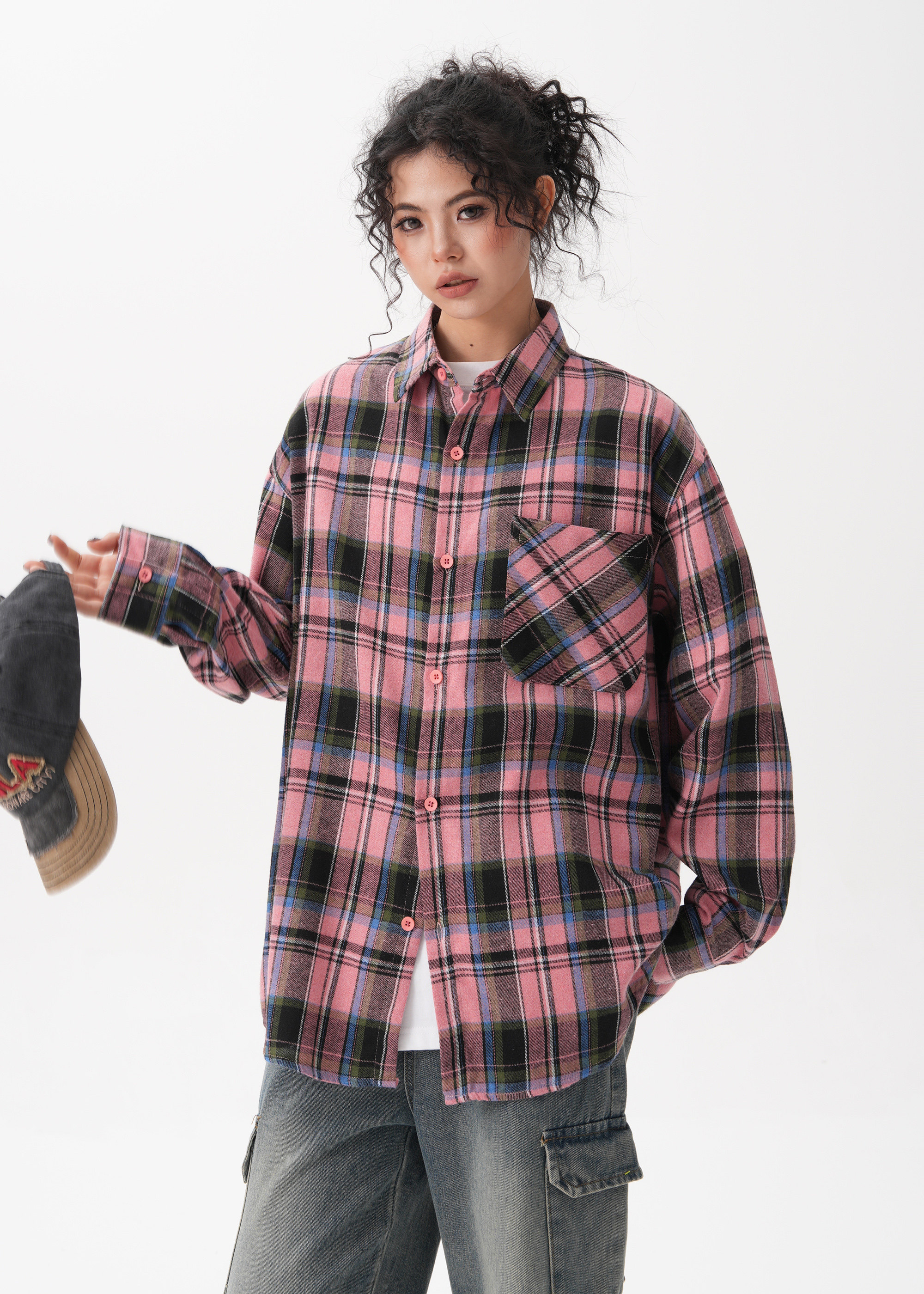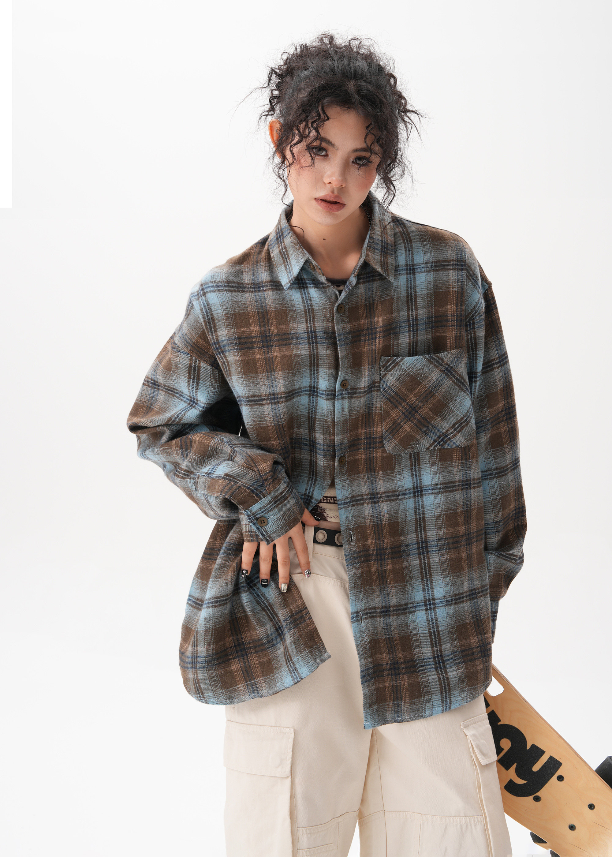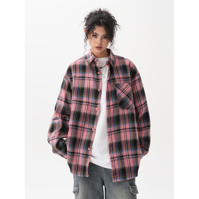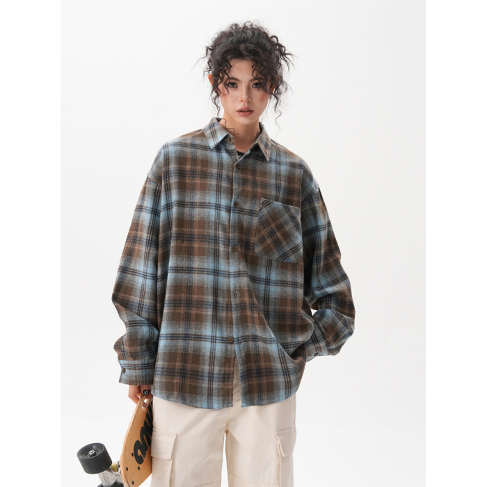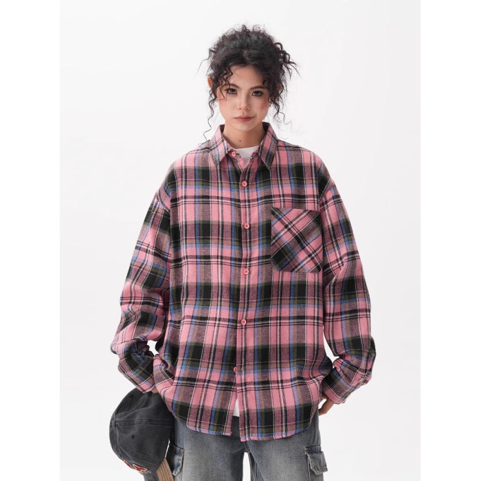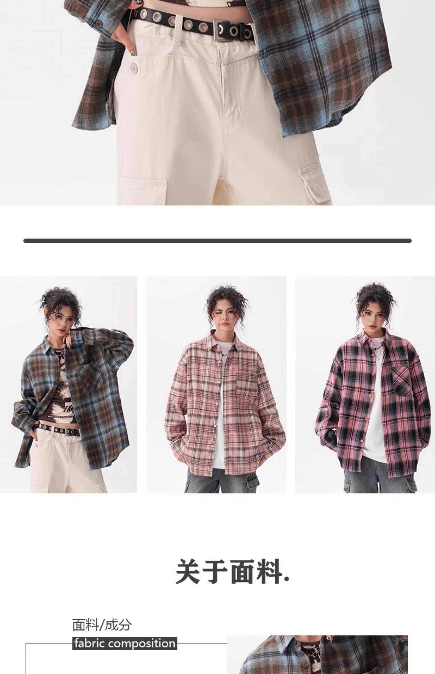 BWKA美式復古格子長袖襯衫女男春季潮牌寬鬆慵懶街頭襯衣外套情侶