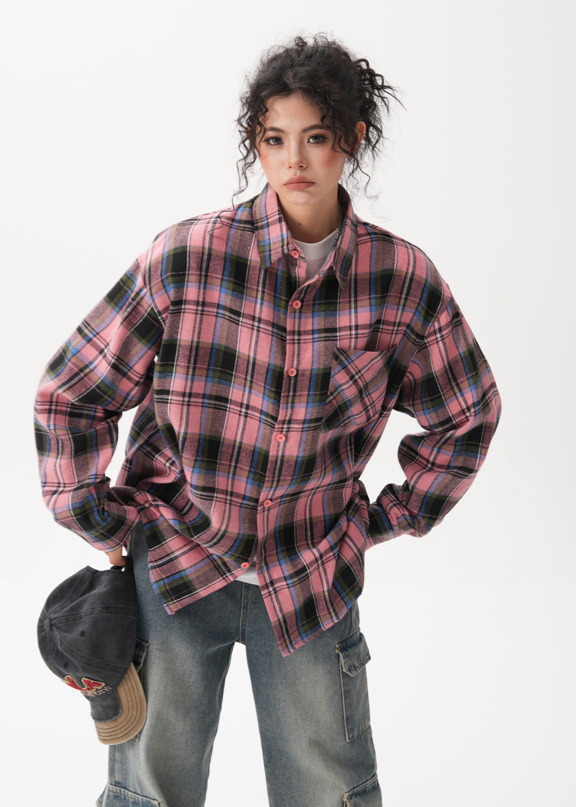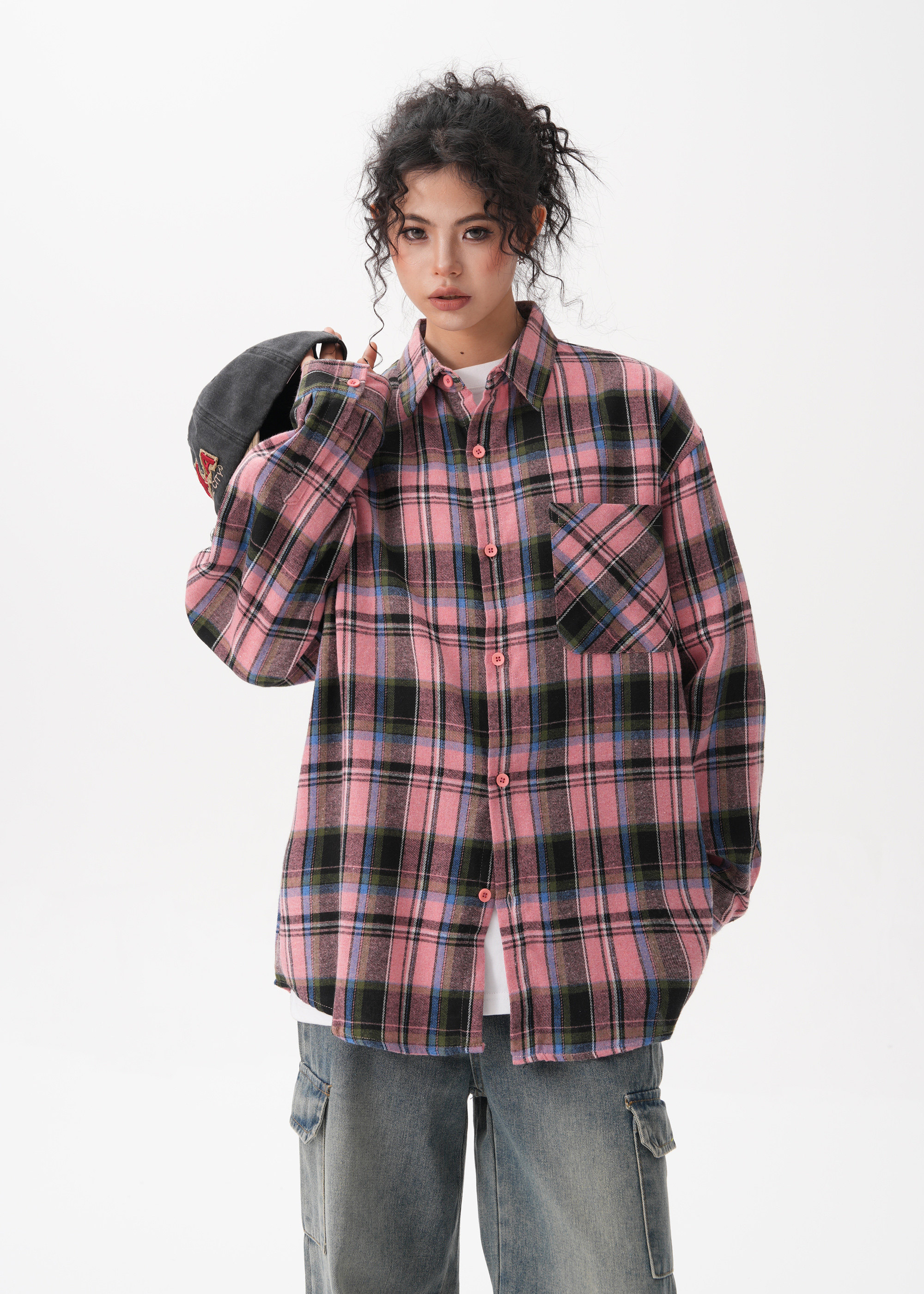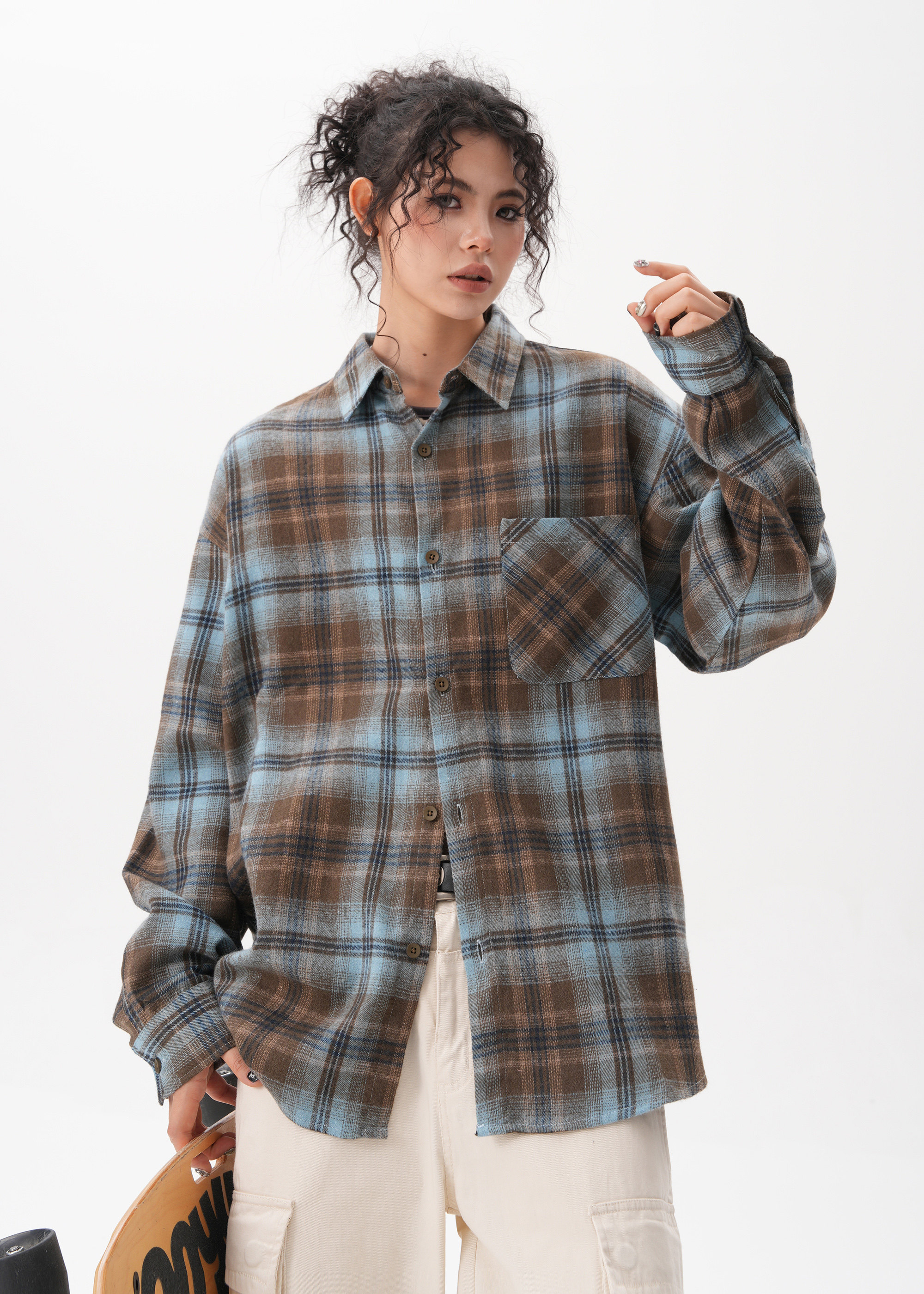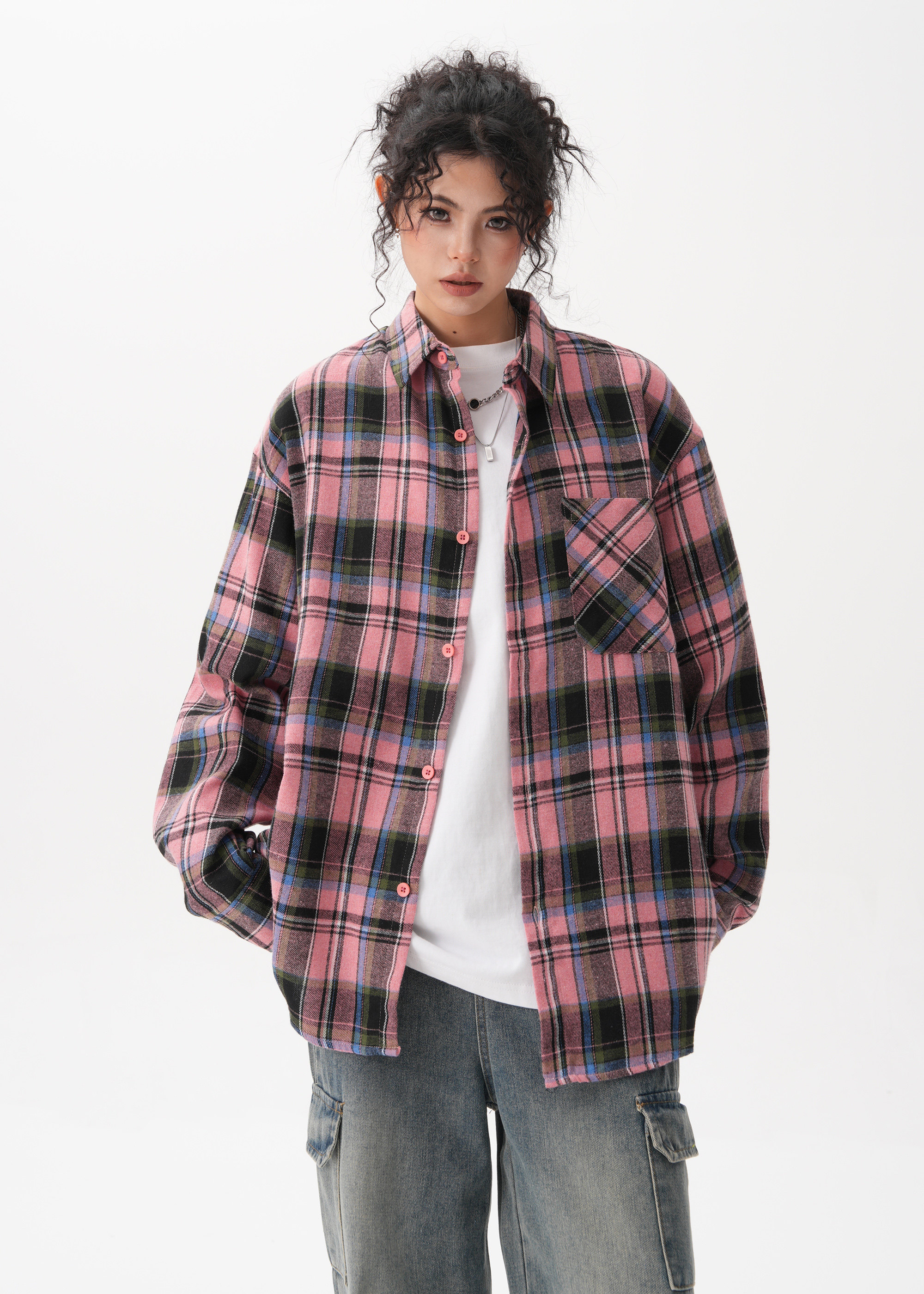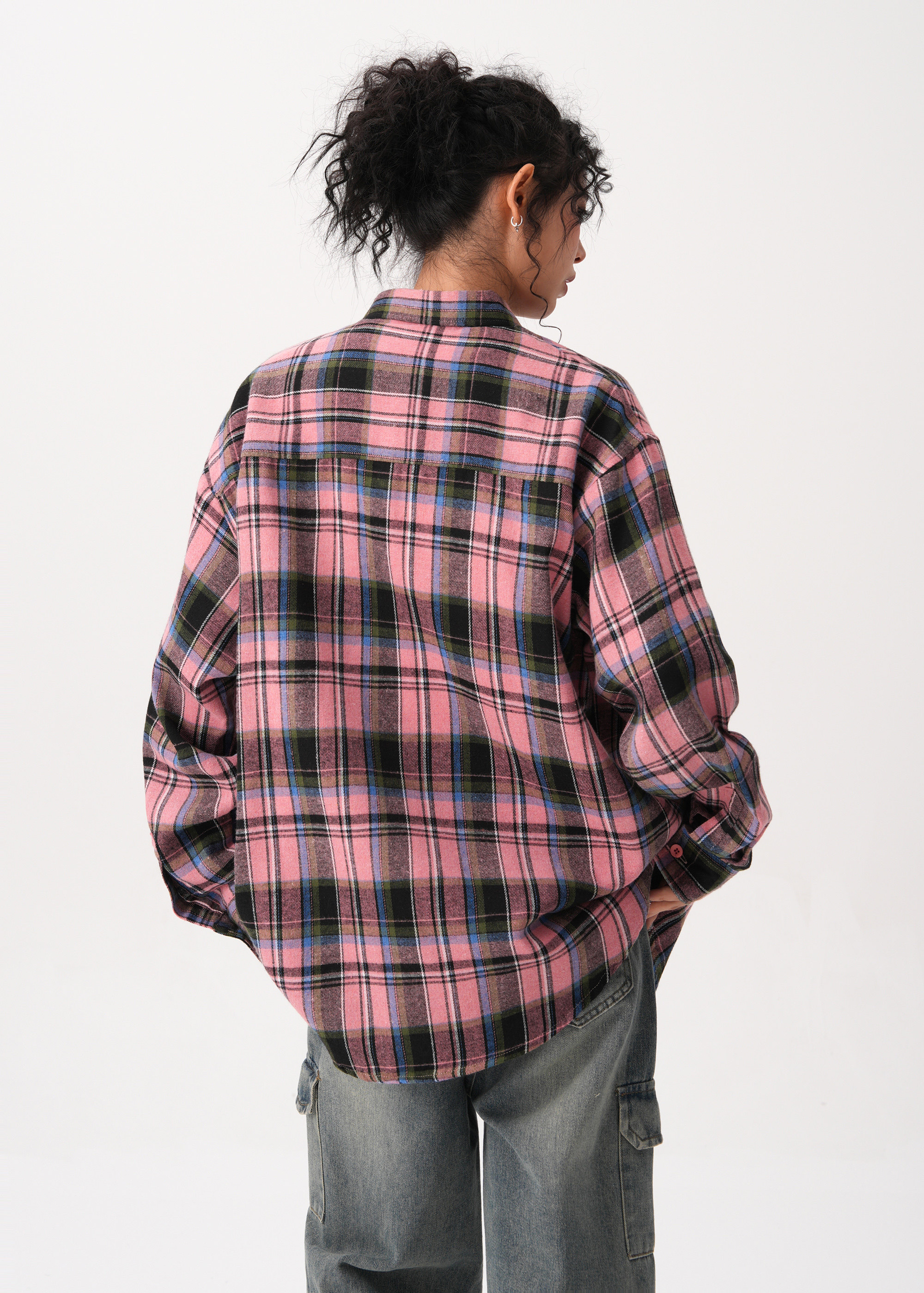 BWKA美式復古格子長袖襯衫女男春季潮牌寬鬆慵懶街頭襯衣外套情侶