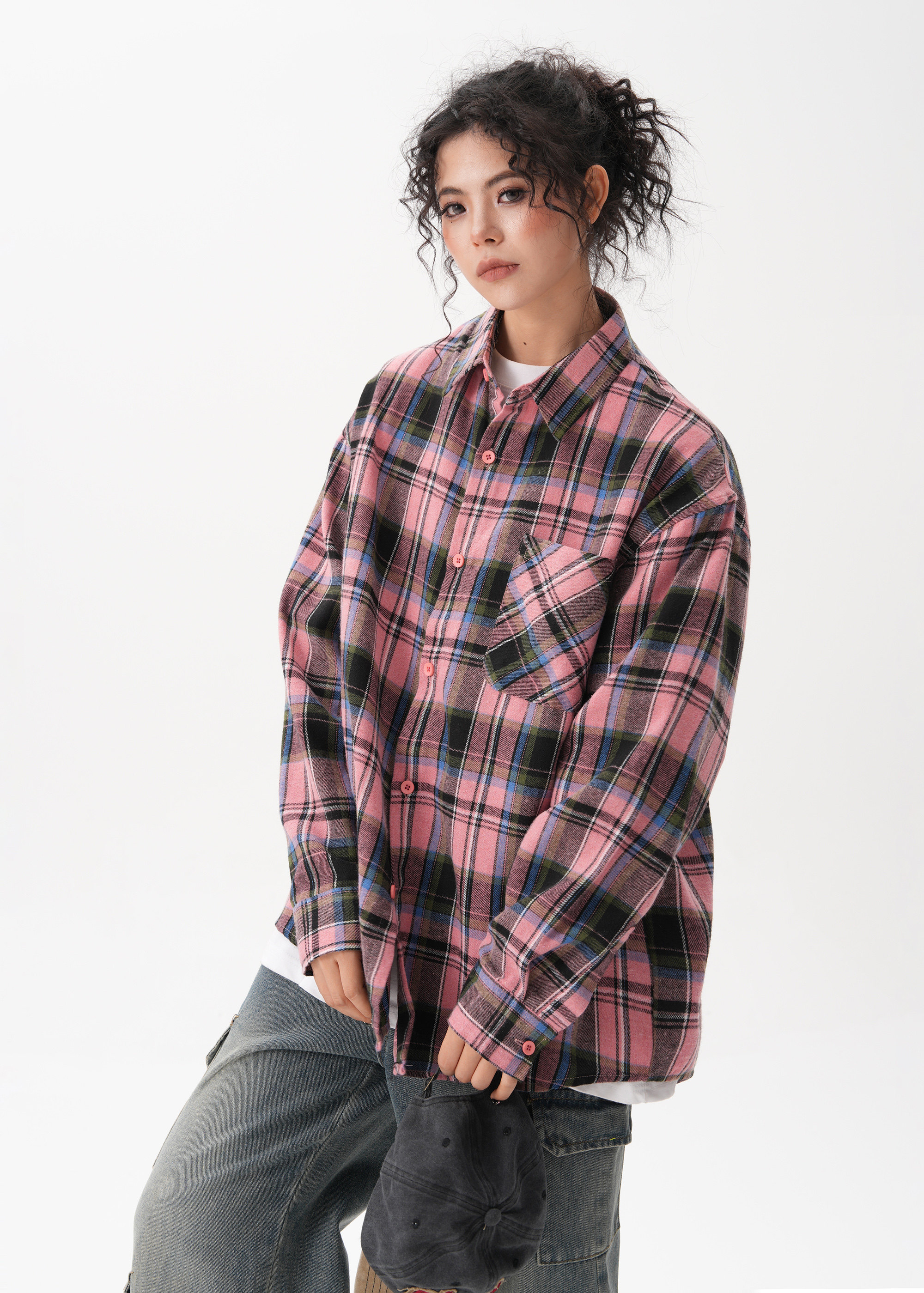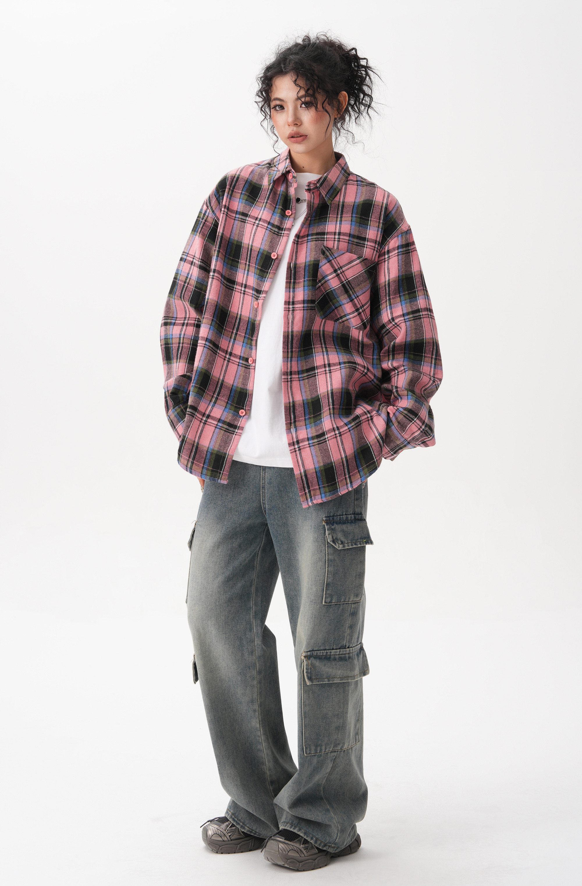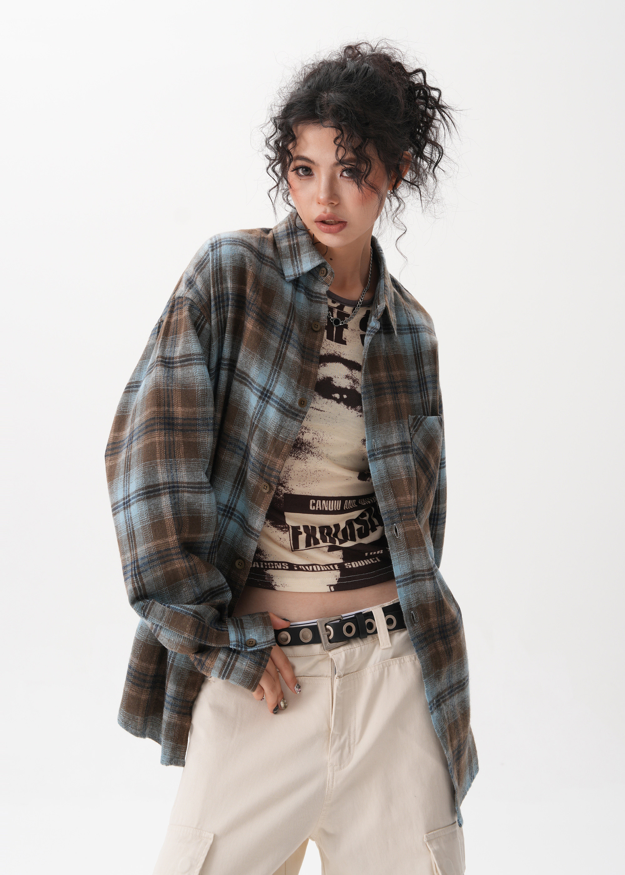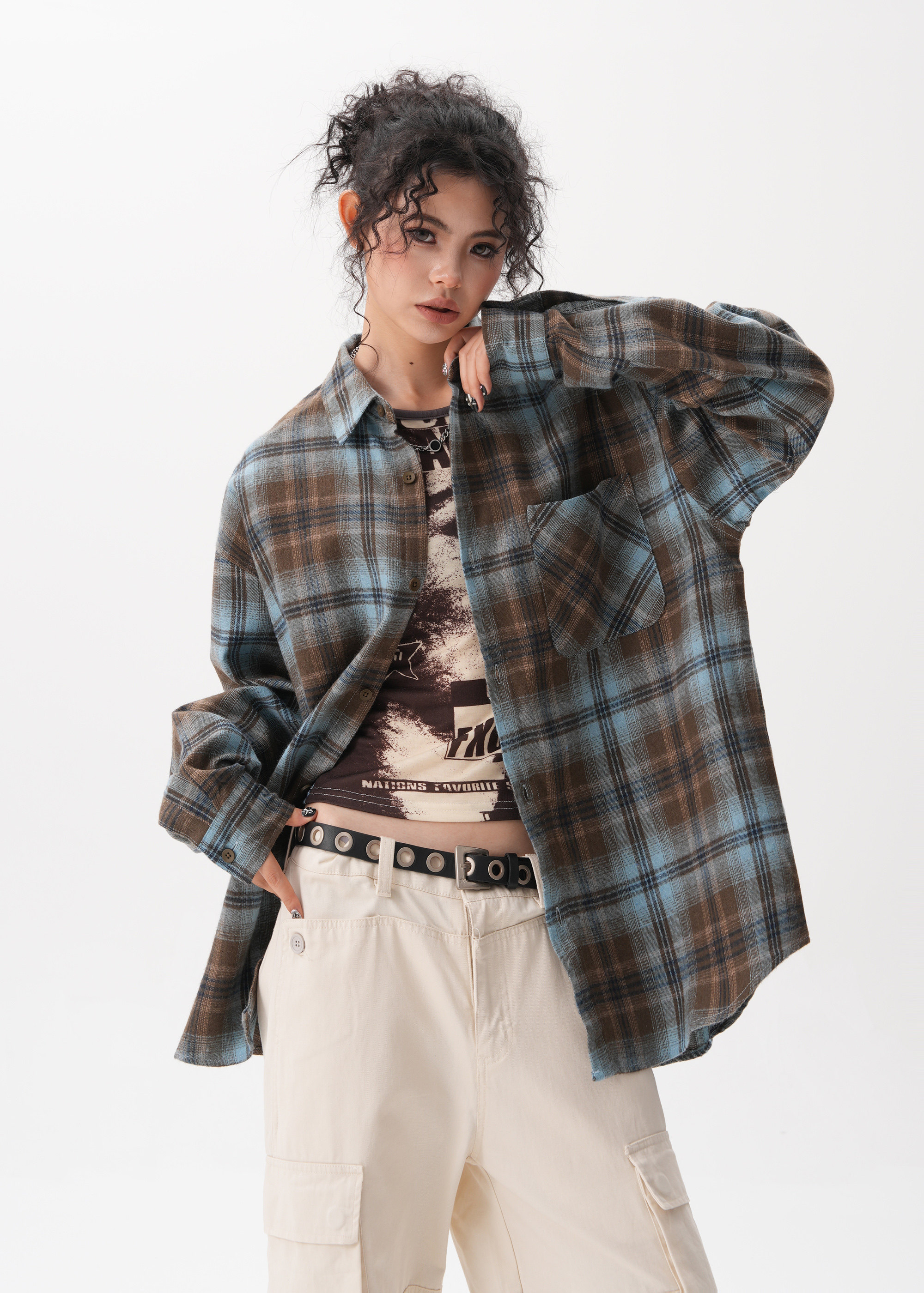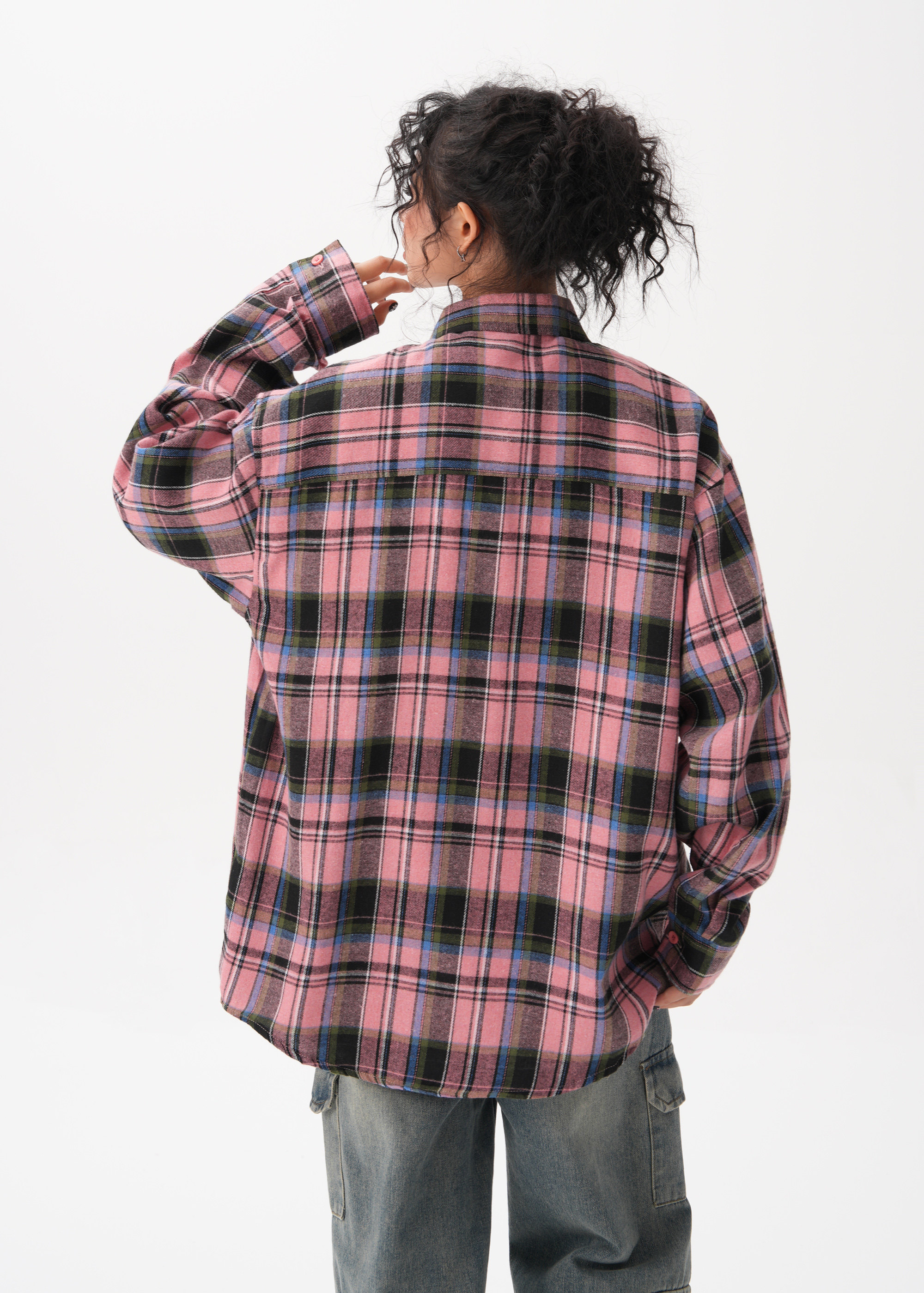 BWKA美式復古格子長袖襯衫女男春季潮牌寬鬆慵懶街頭襯衣外套情侶
