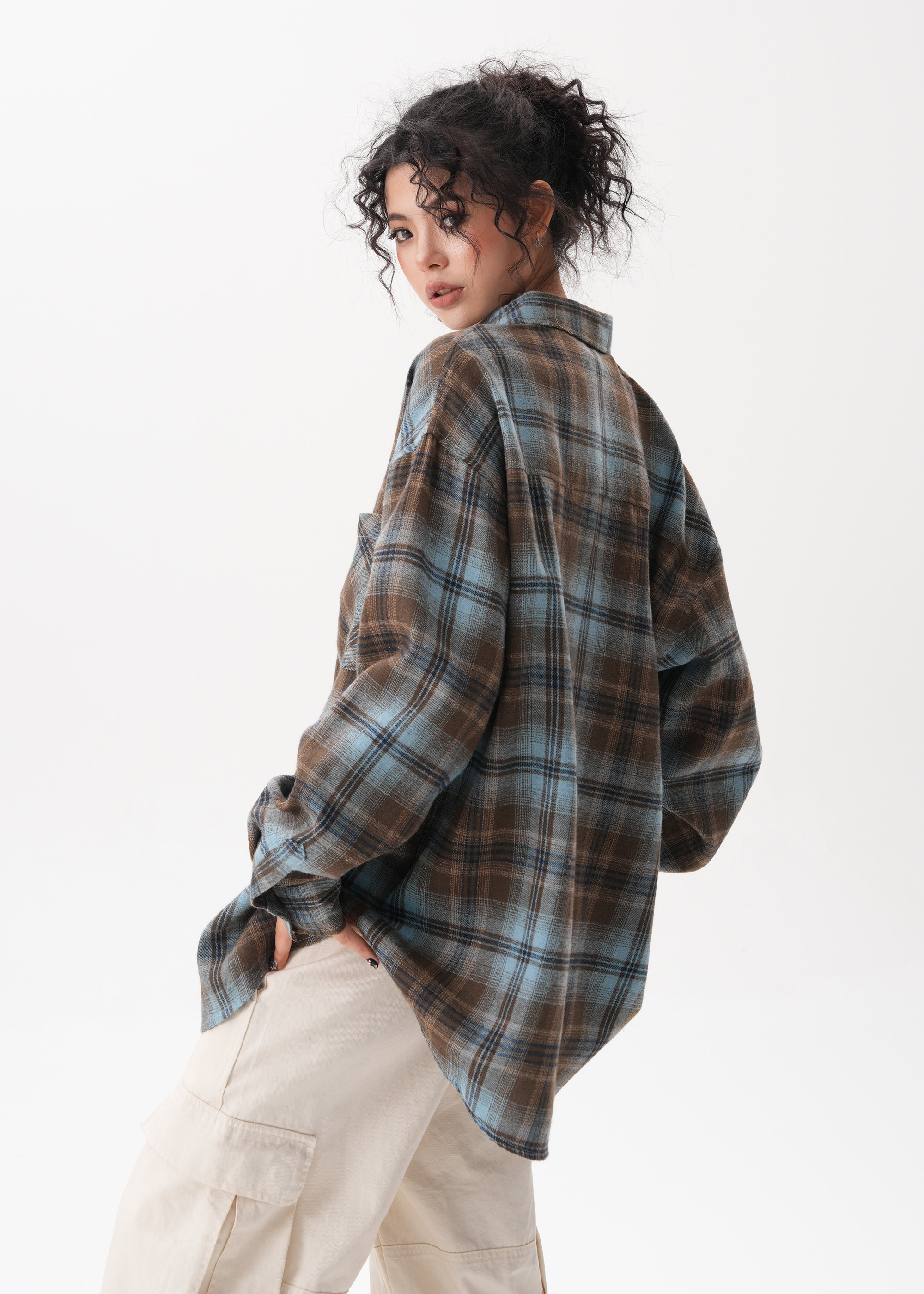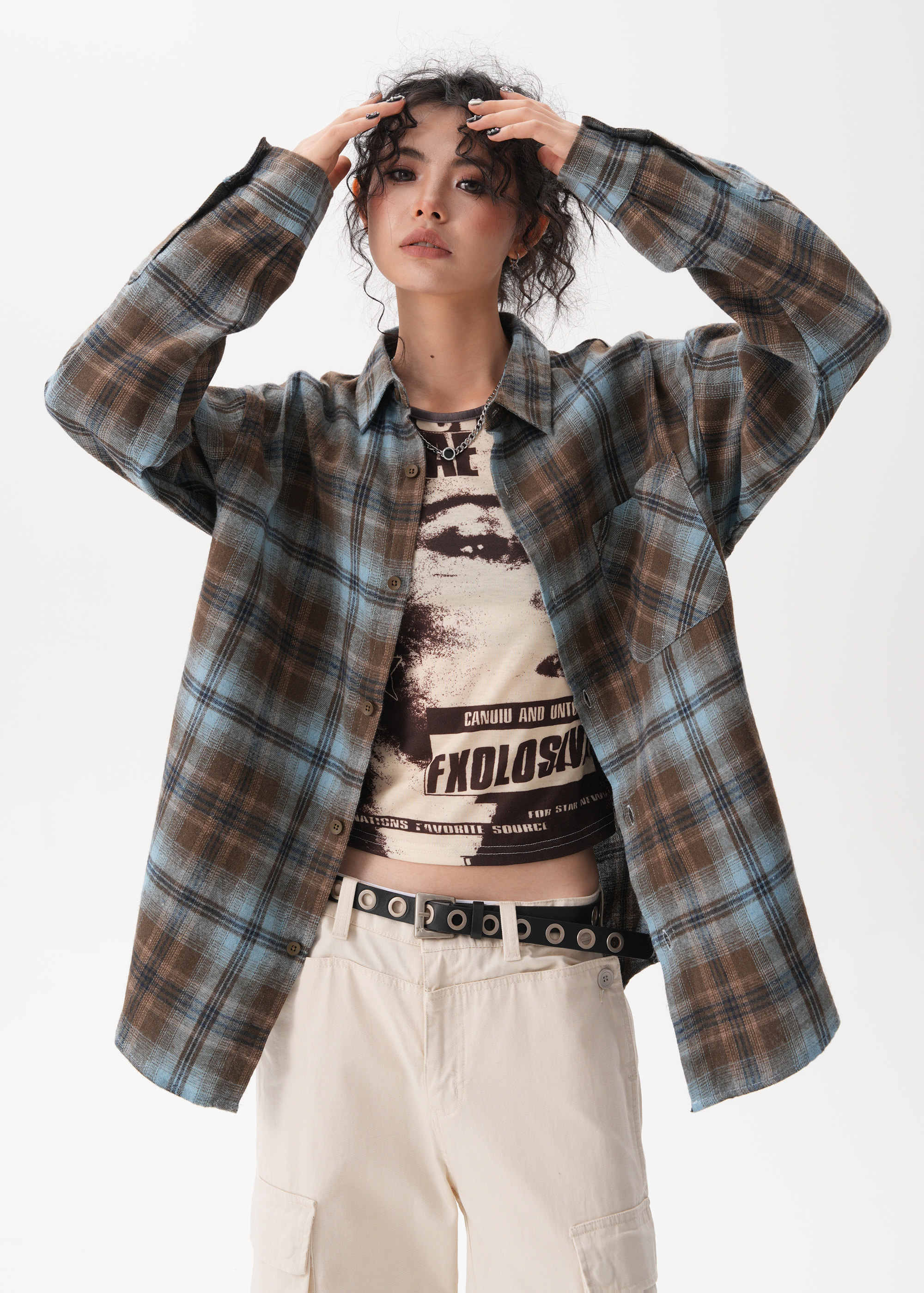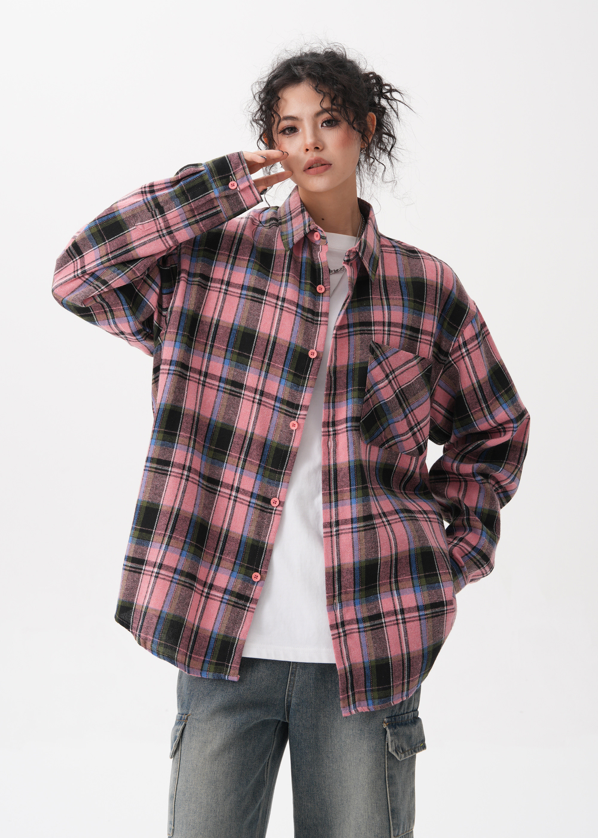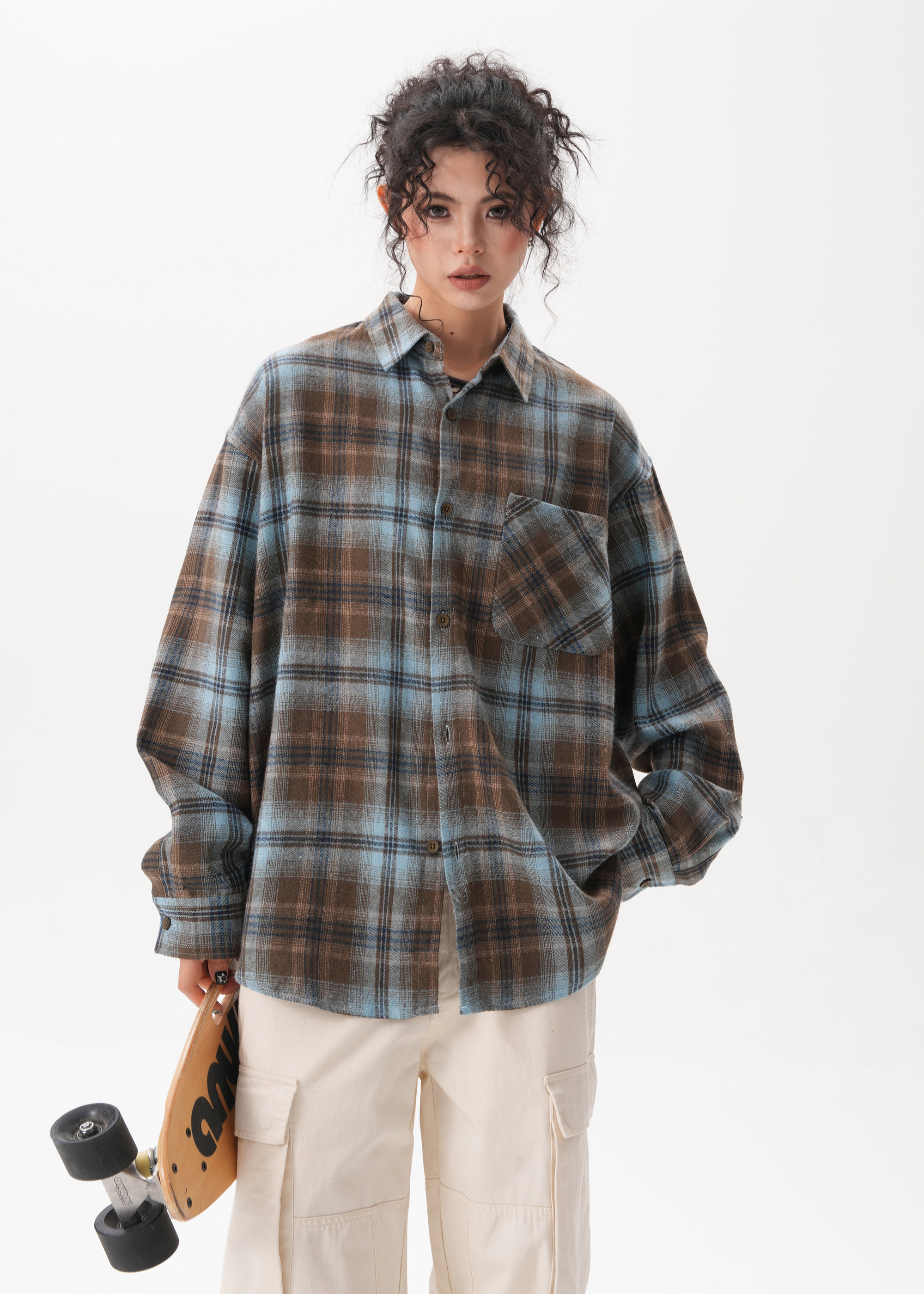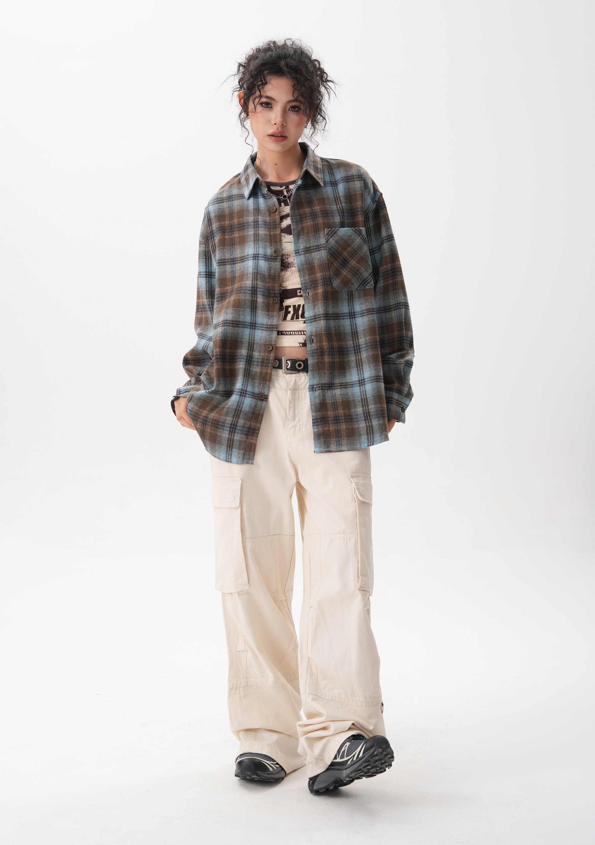 BWKA美式復古格子長袖襯衫女男春季潮牌寬鬆慵懶街頭襯衣外套情侶