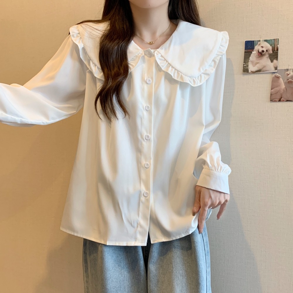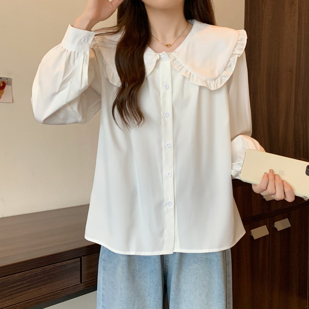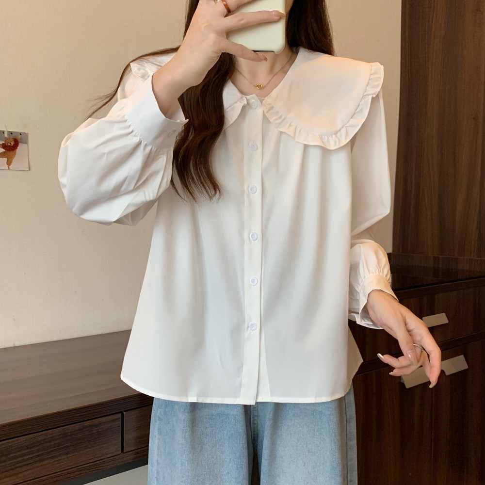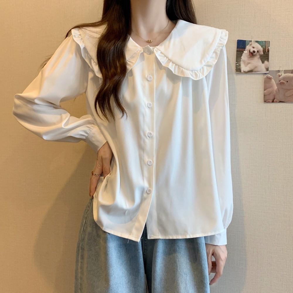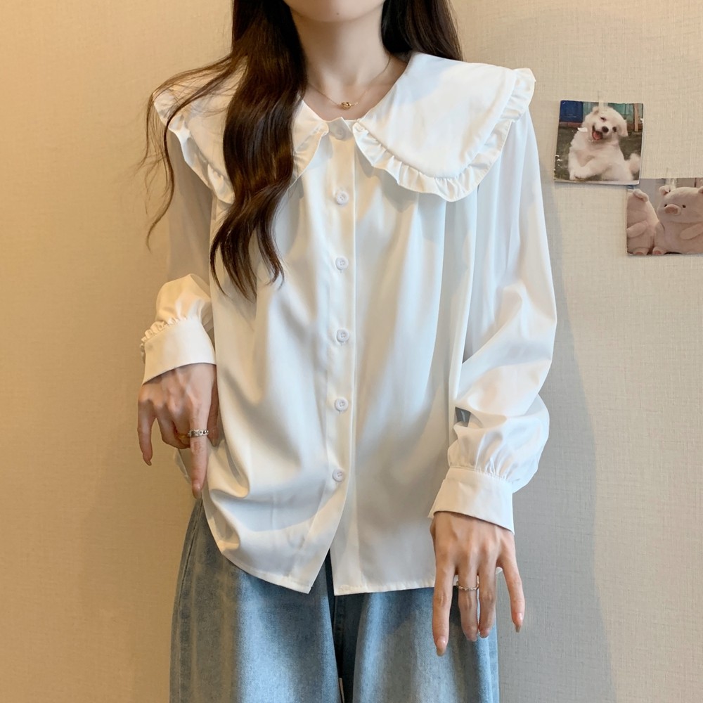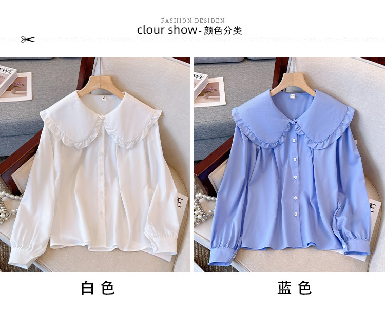 大碼法式娃娃領白色長袖襯衫女早春季設計感小衆顯瘦洋氣減齡上衣