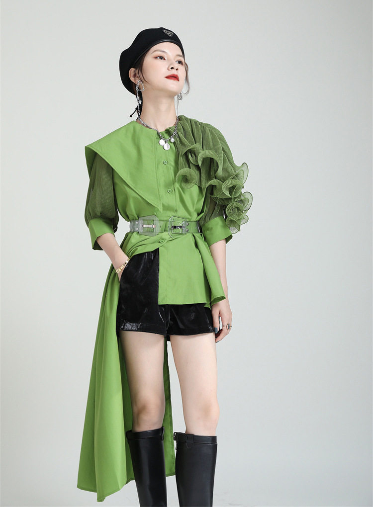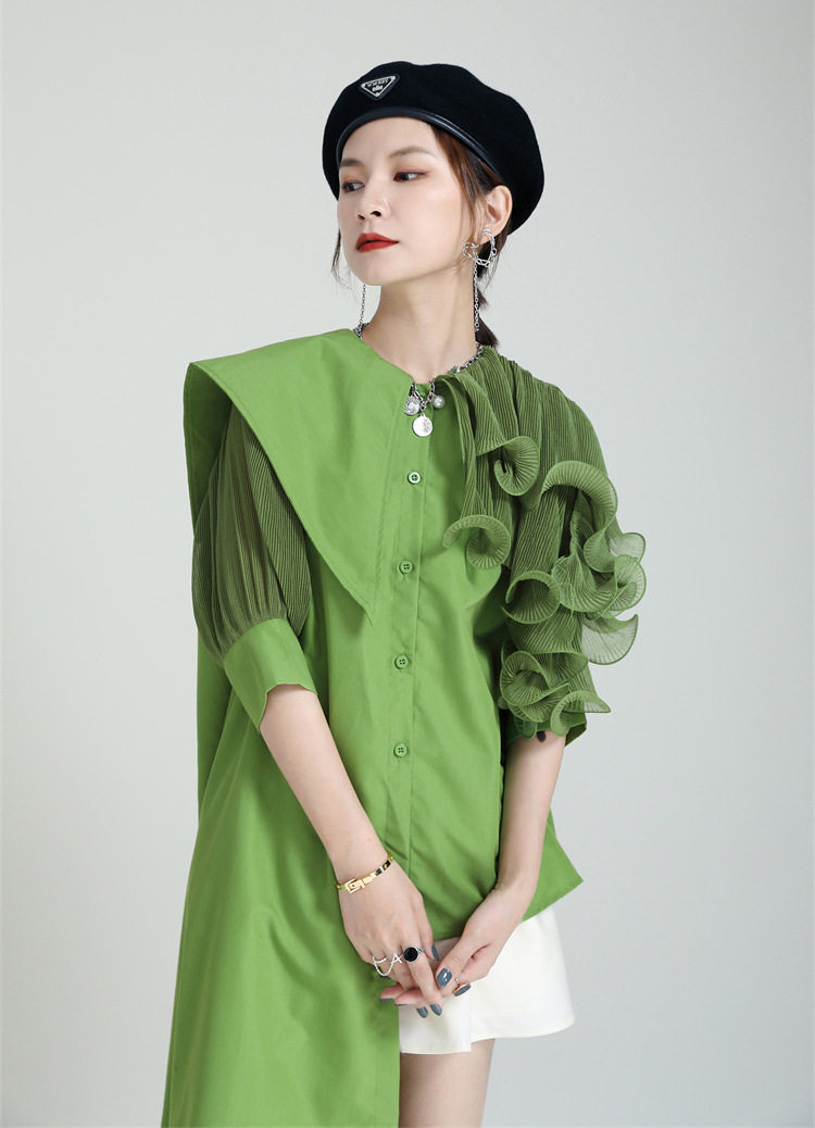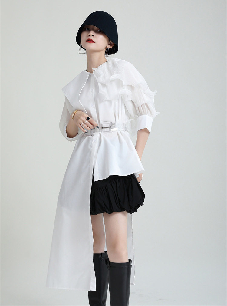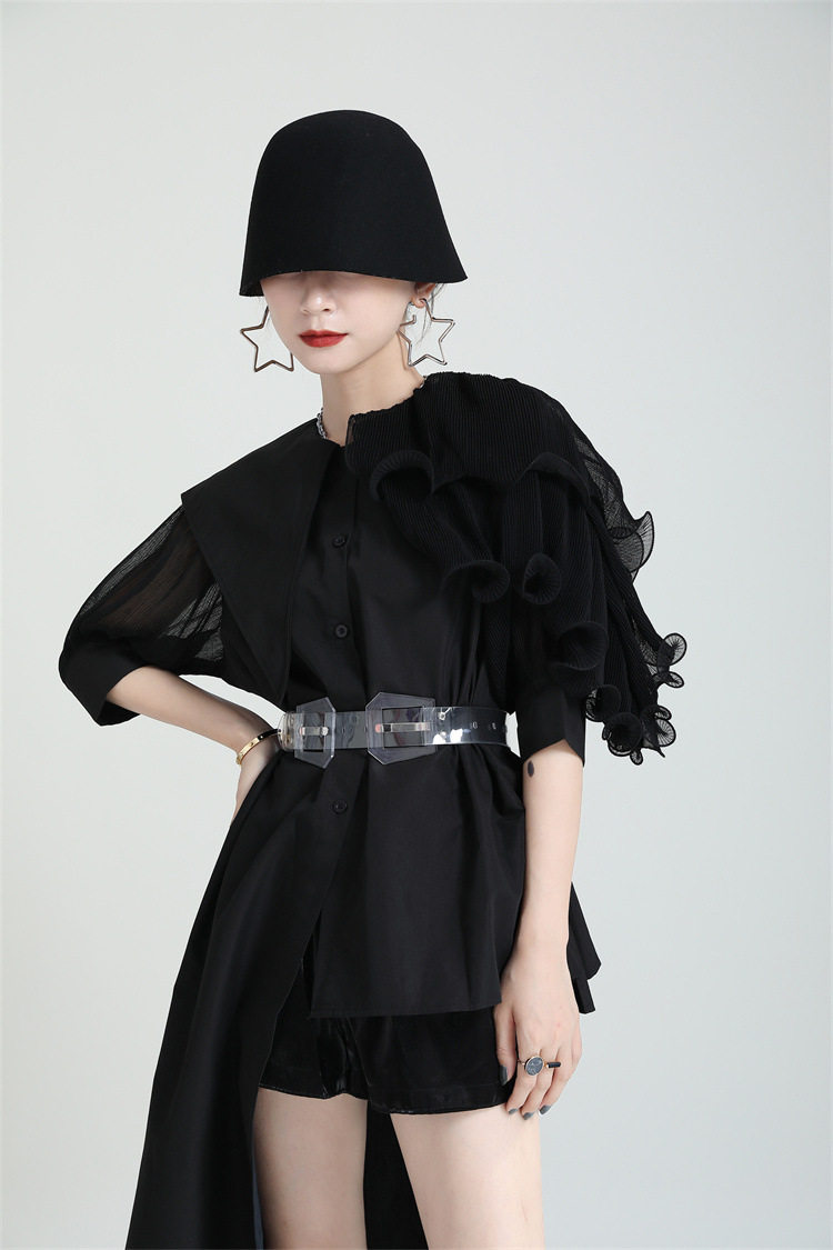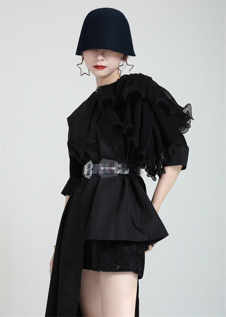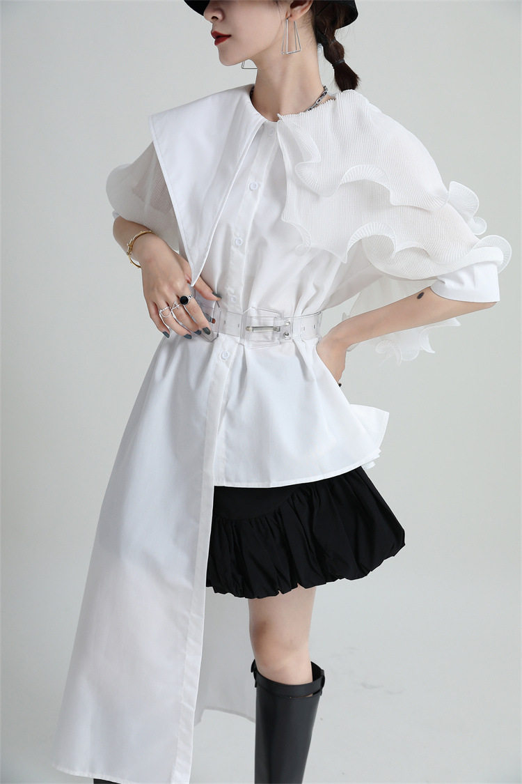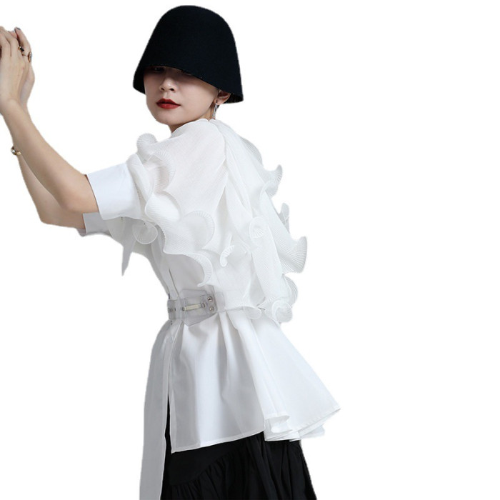 2025夏新款繙領皺褶卷荷葉邊不規則拼接寬鬆短袖襯衫配腰帶襯衫女