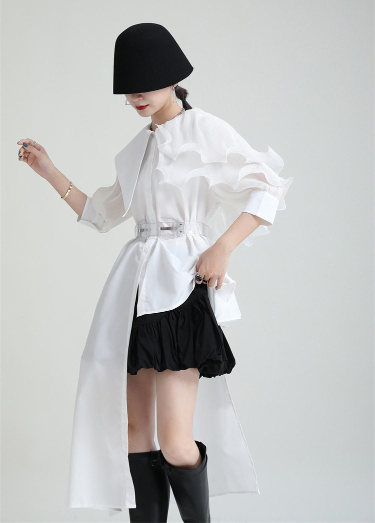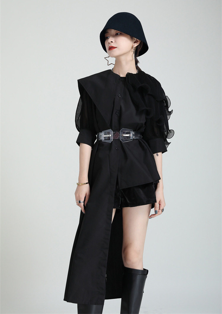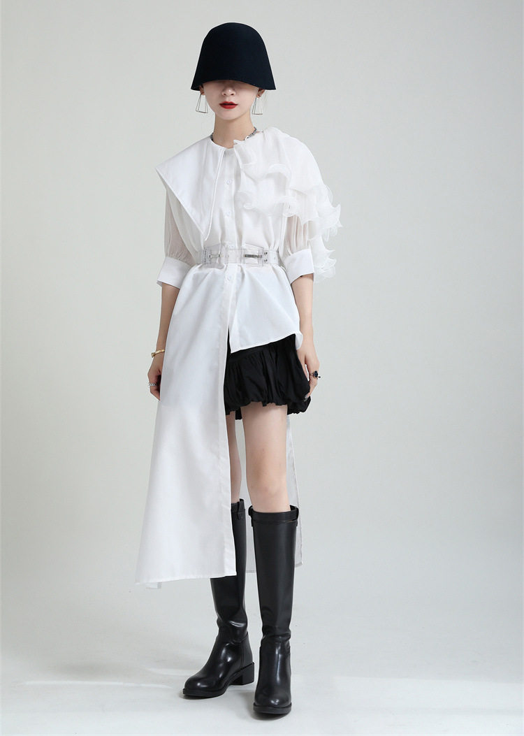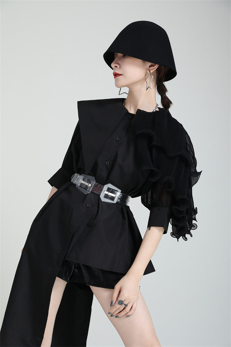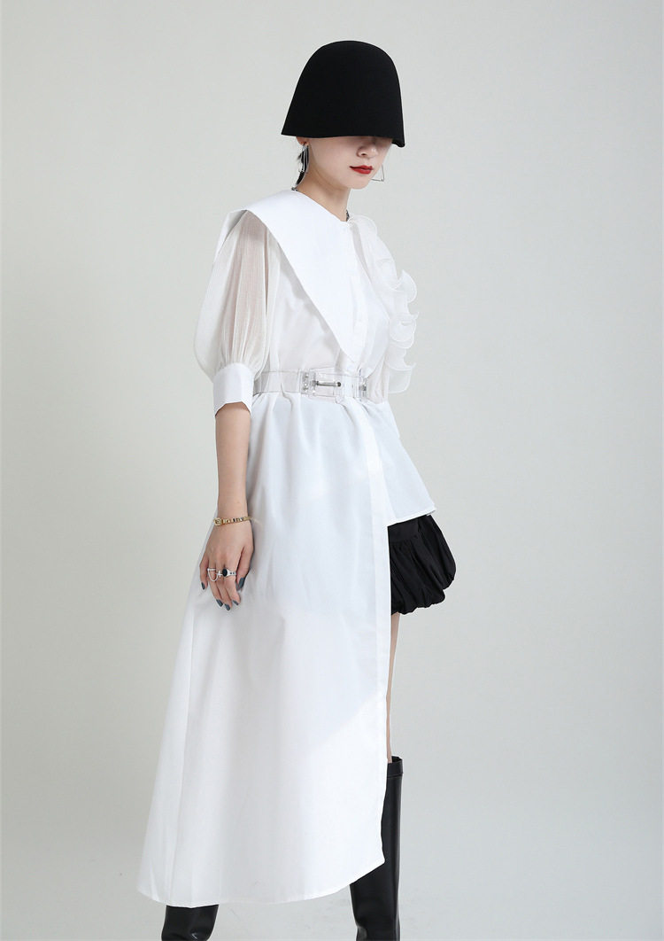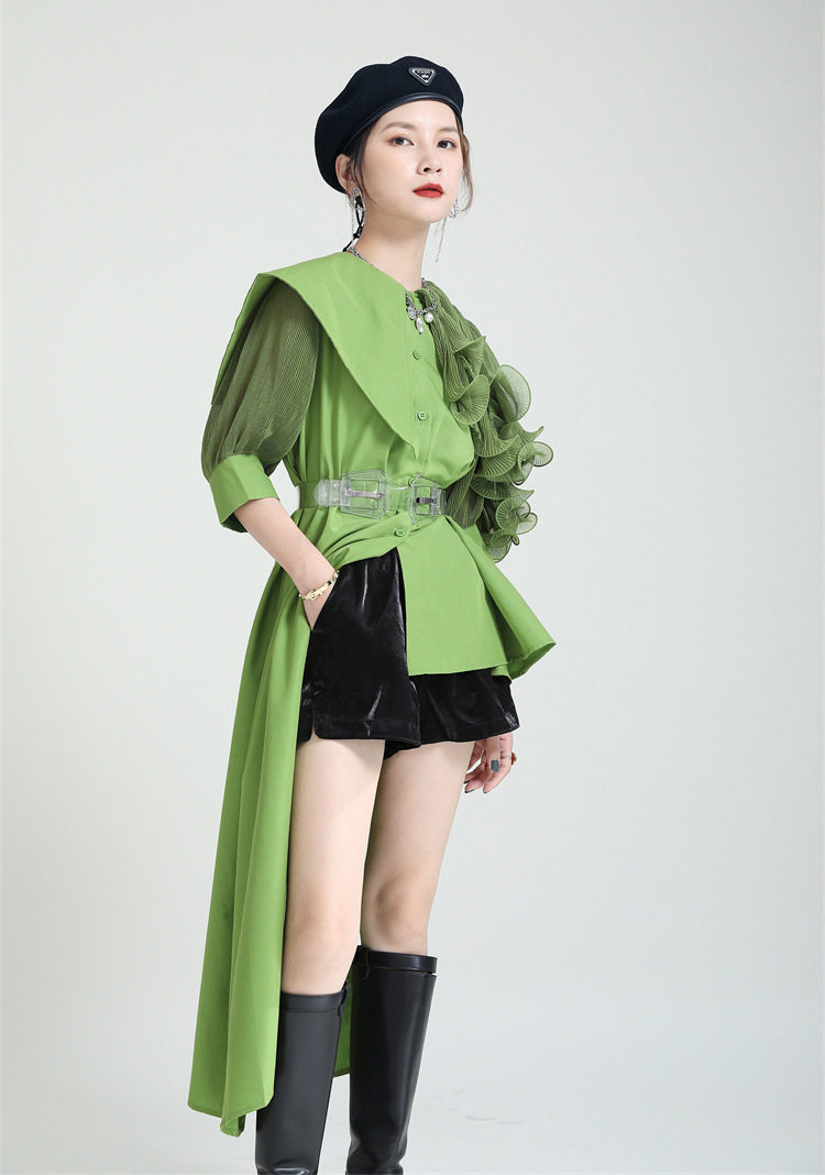 2025夏新款繙領皺褶卷荷葉邊不規則拼接寬鬆短袖襯衫配腰帶襯衫女