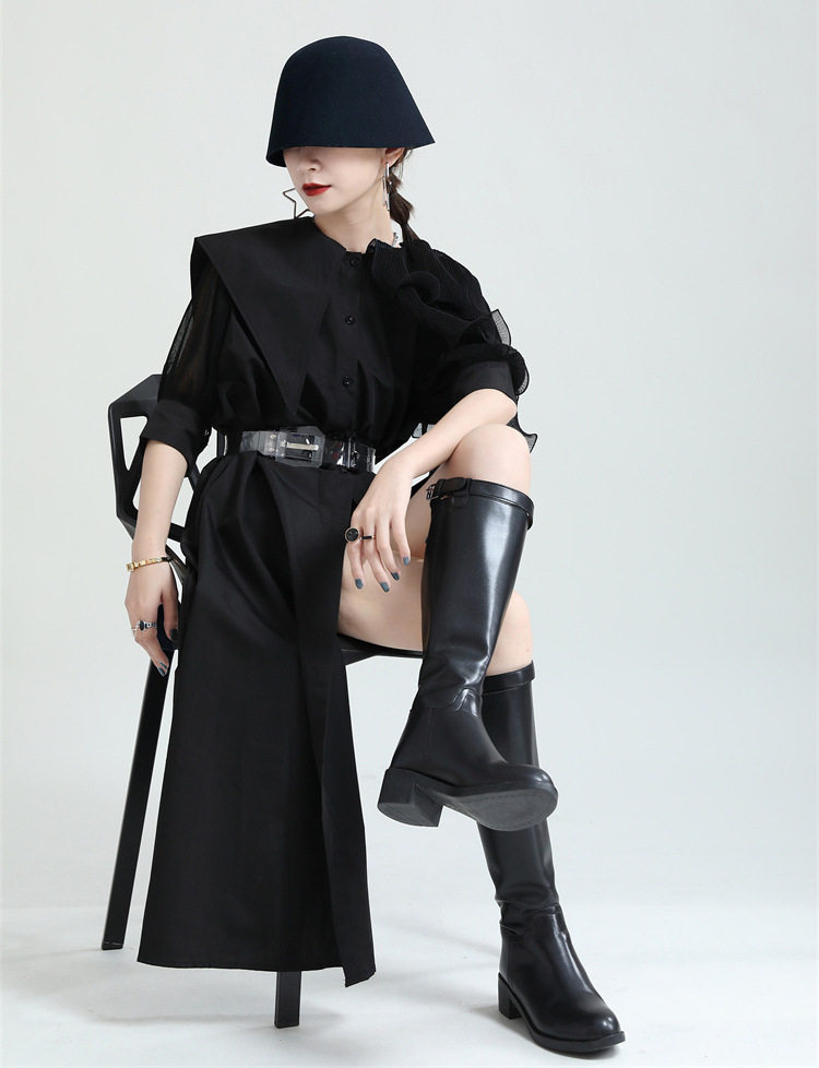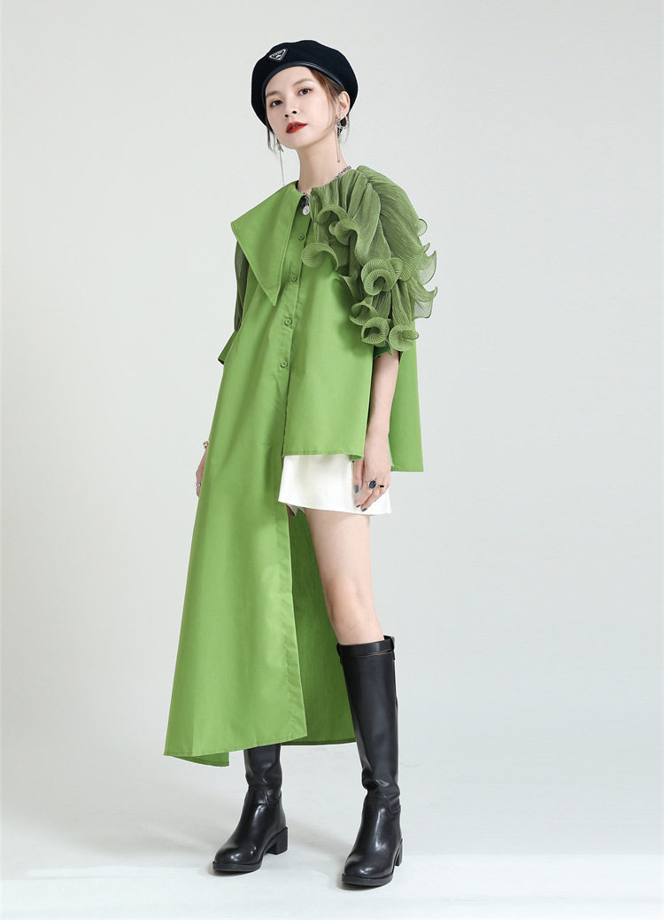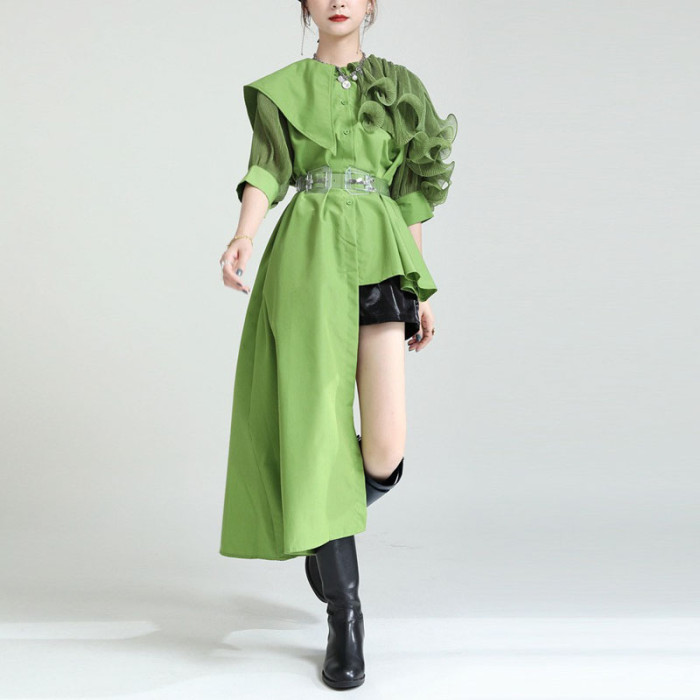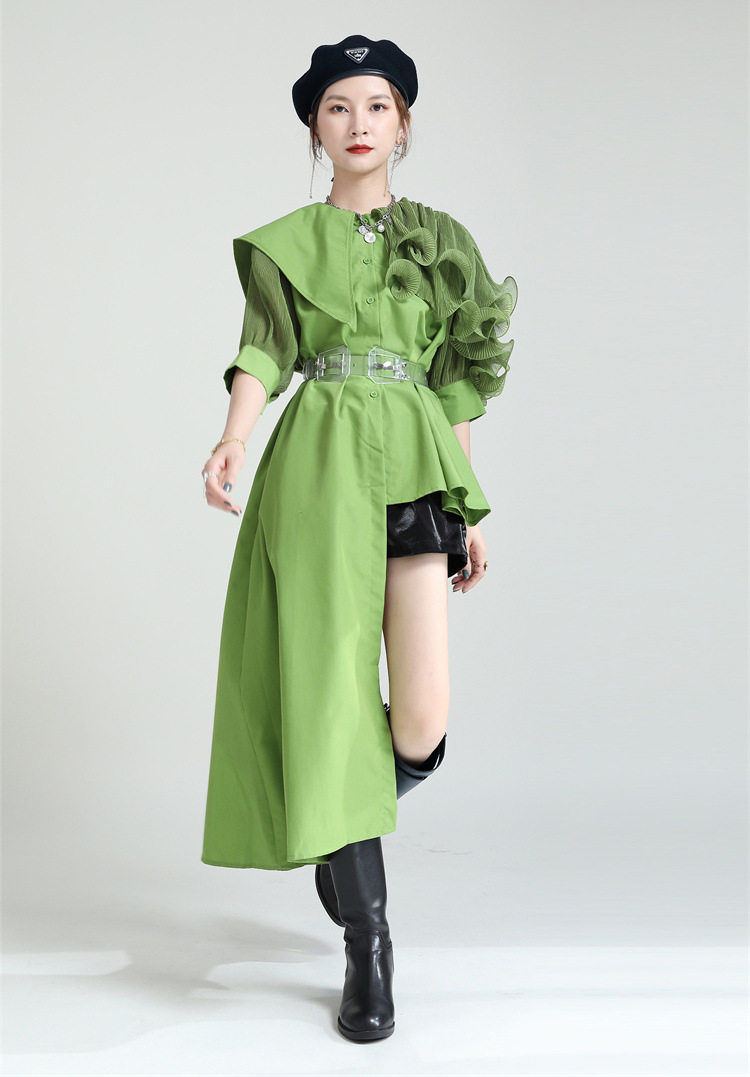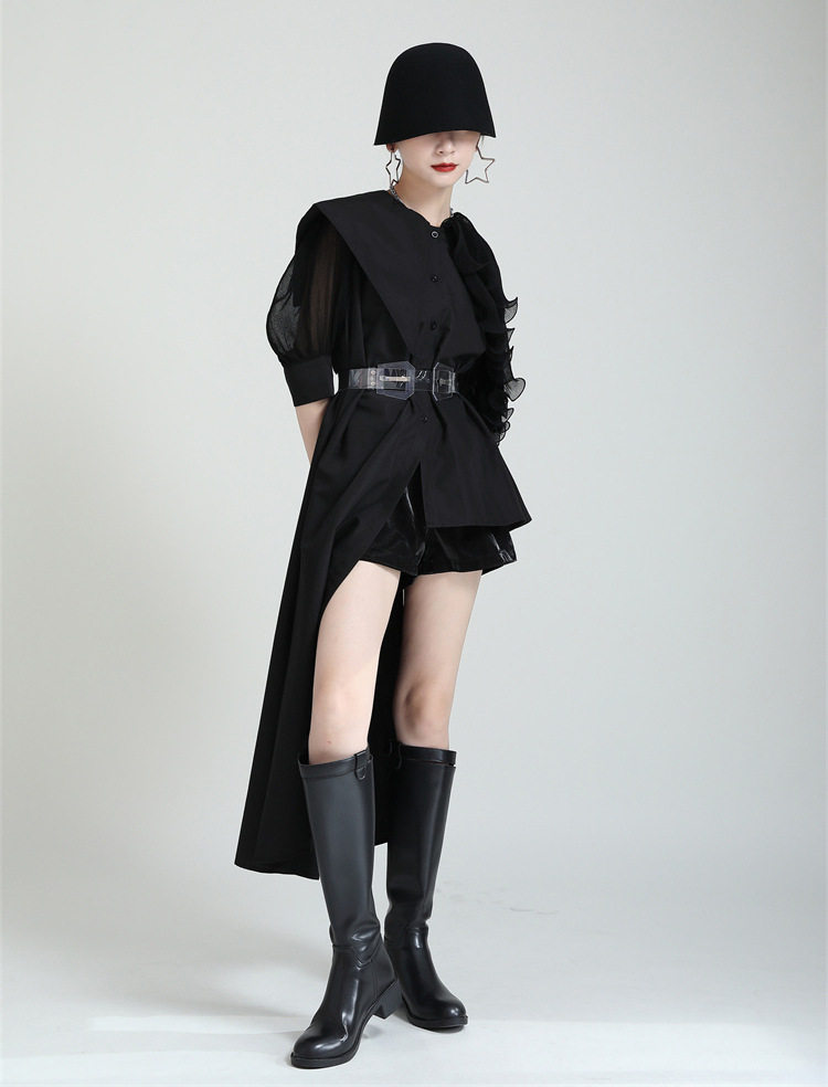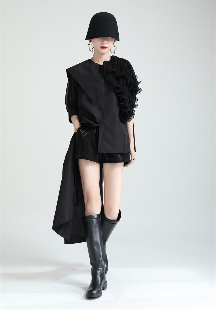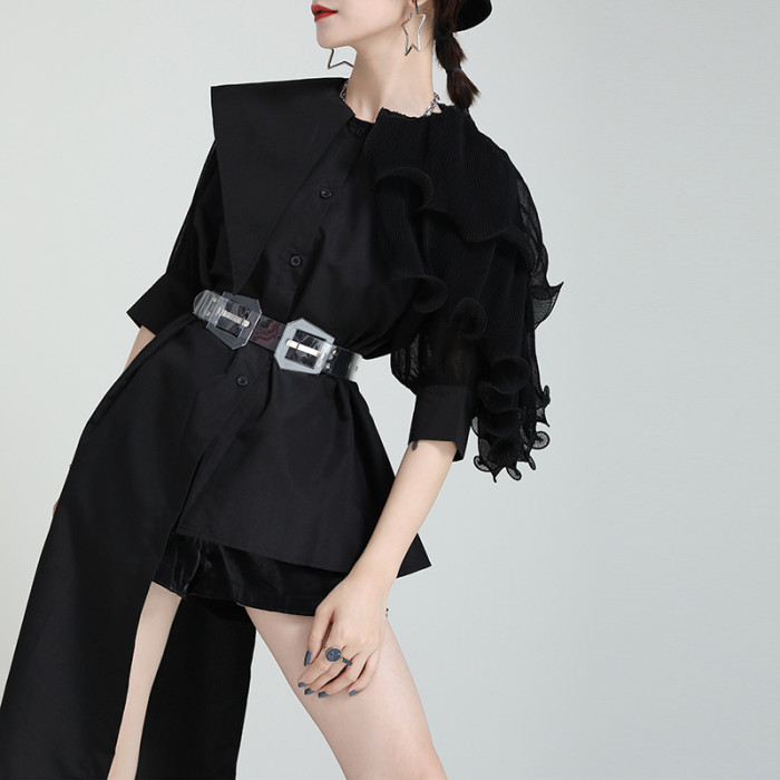 2025夏新款繙領皺褶卷荷葉邊不規則拼接寬鬆短袖襯衫配腰帶襯衫女