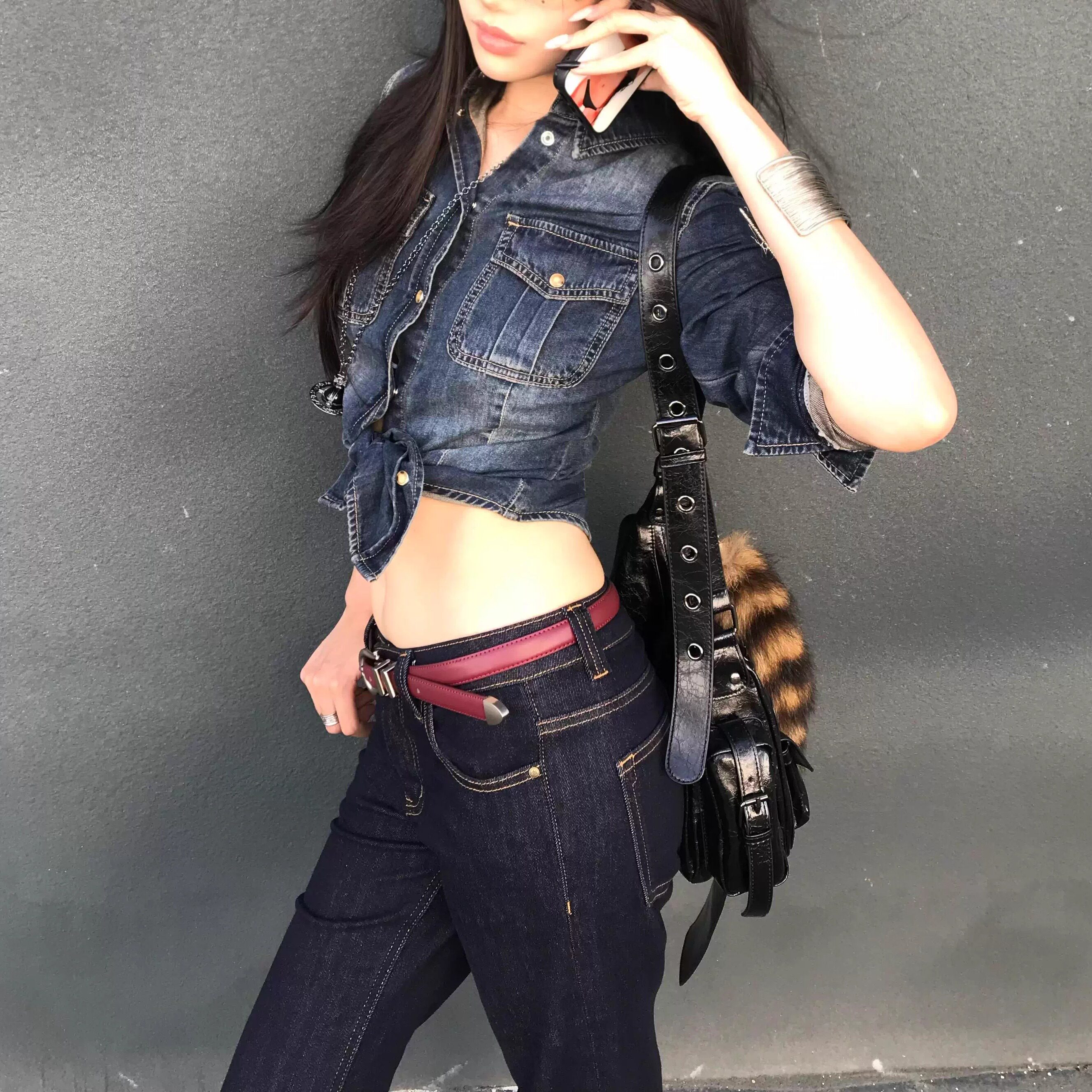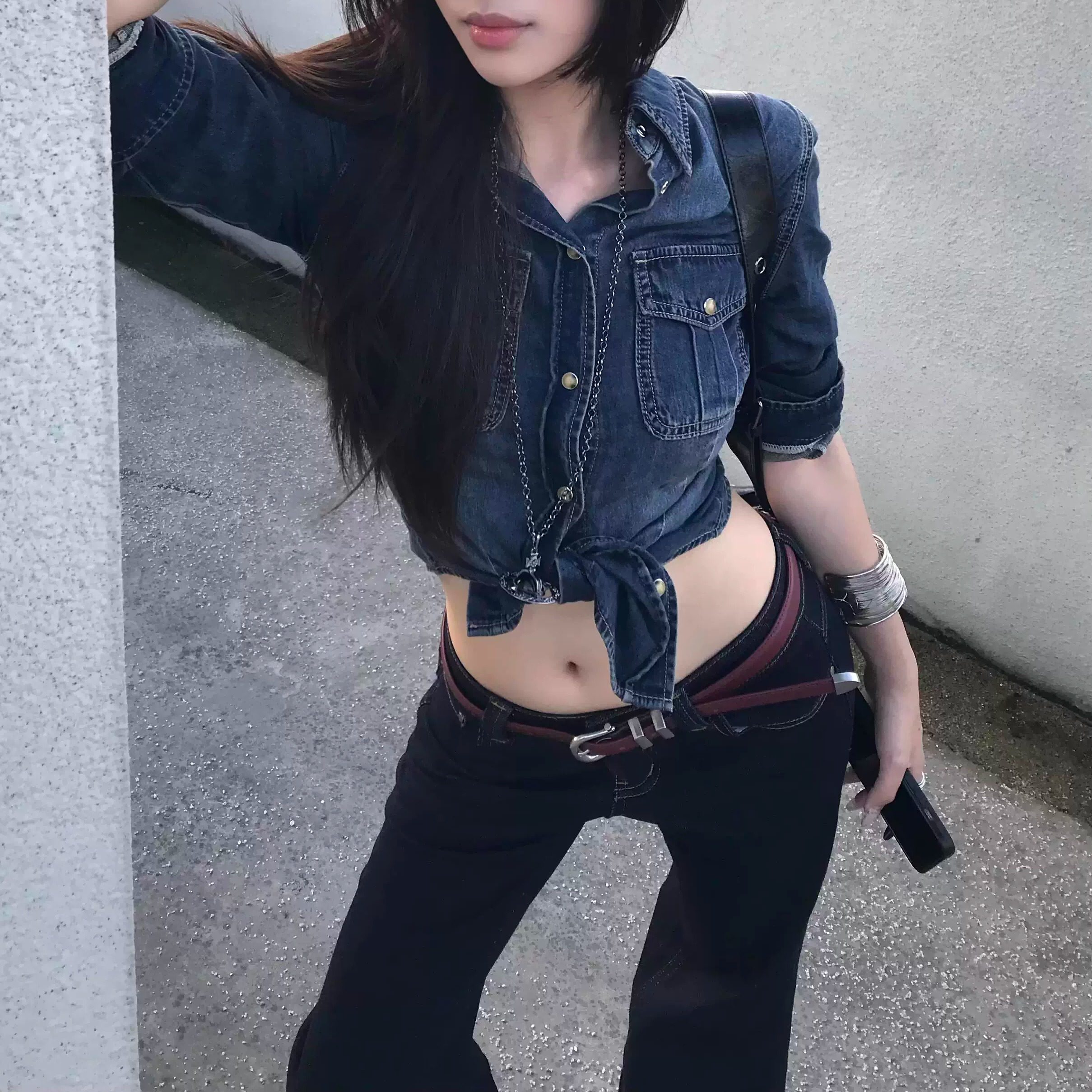 秋季新款古早港妹收腰牛仔襯衫上衣女2025新款氣質修身長袖外套潮