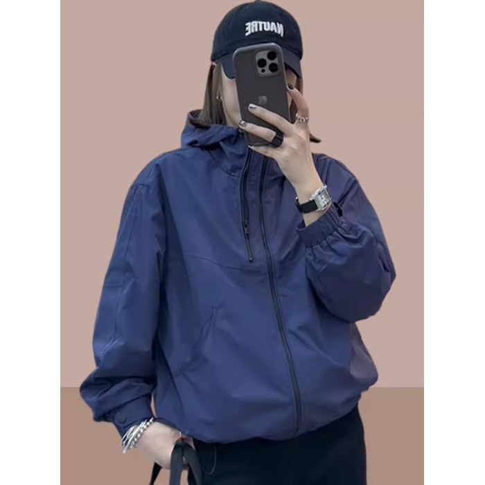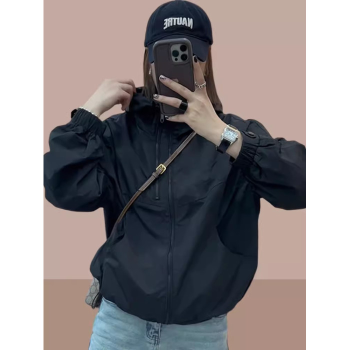 2025夏季新款休閒百搭防曬沖鋒衣小個子純色寬鬆連帽防曬服外套女