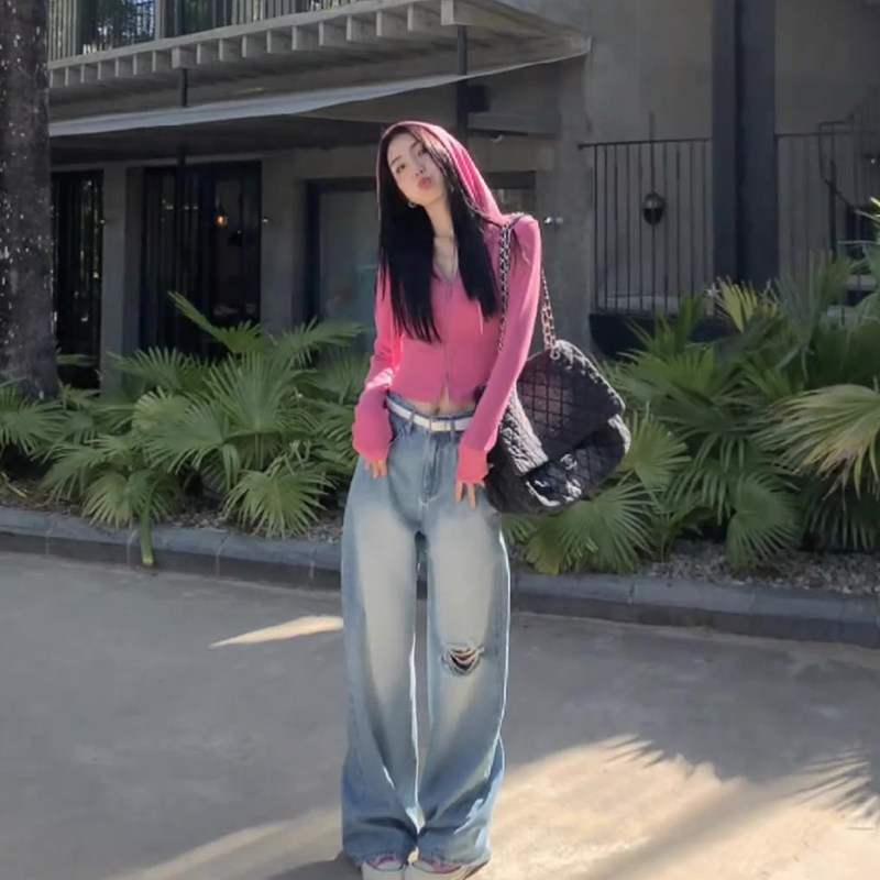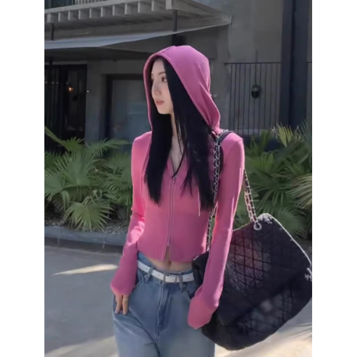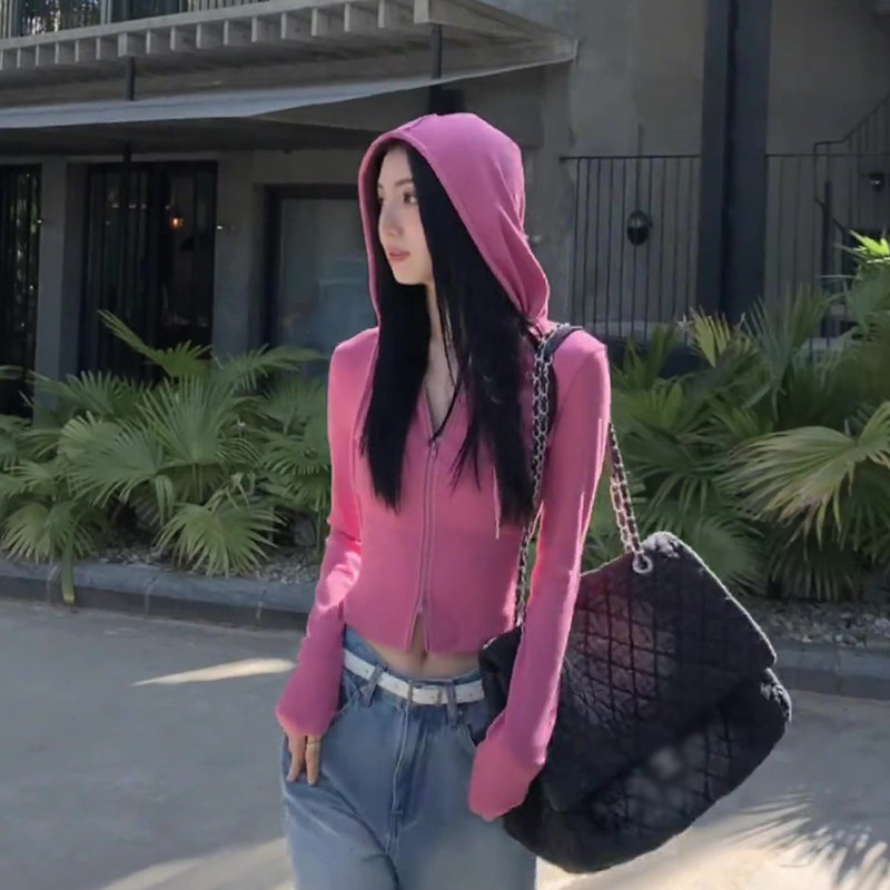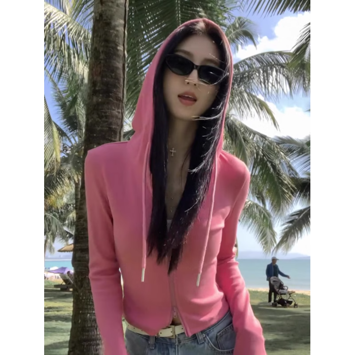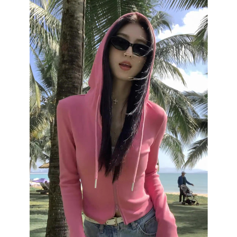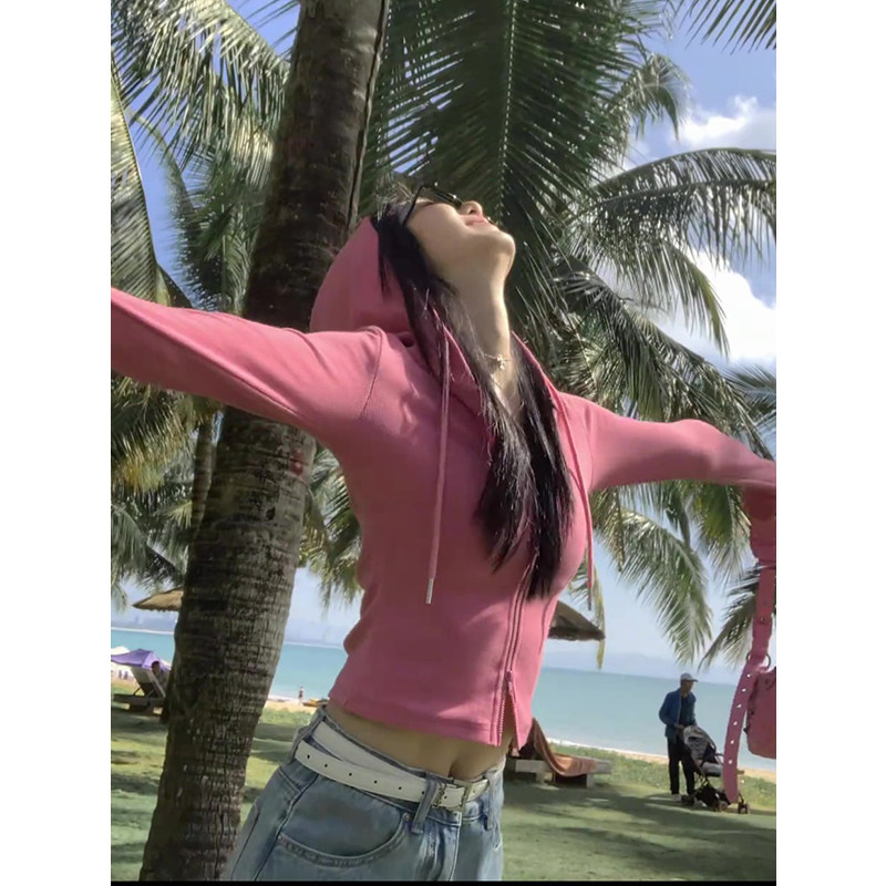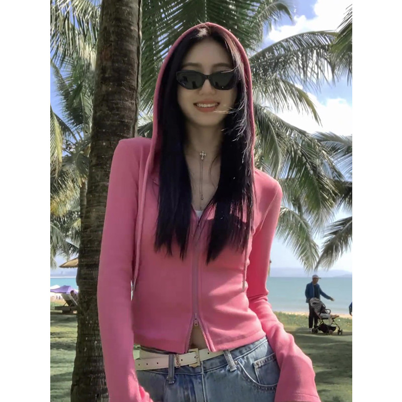 粉色抽繩連帽開衫衛衣女早秋新款雙頭拉鍊設計感顯瘦薄款防曬外套