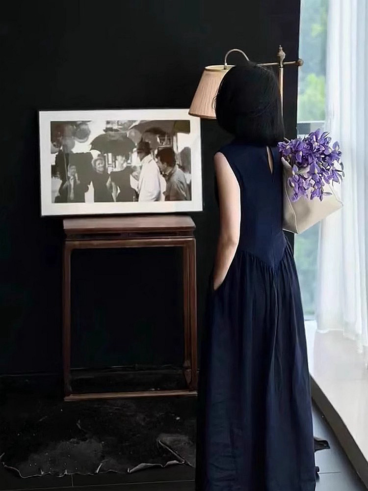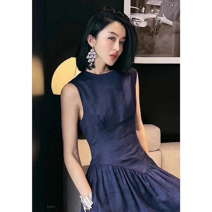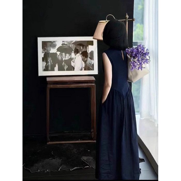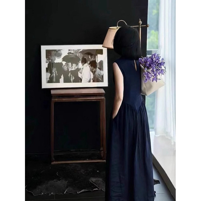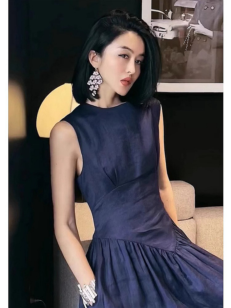 專櫃撤櫃2026夏季新款復古赫本風高級收腰顯身材藏藍色無袖連衣裙