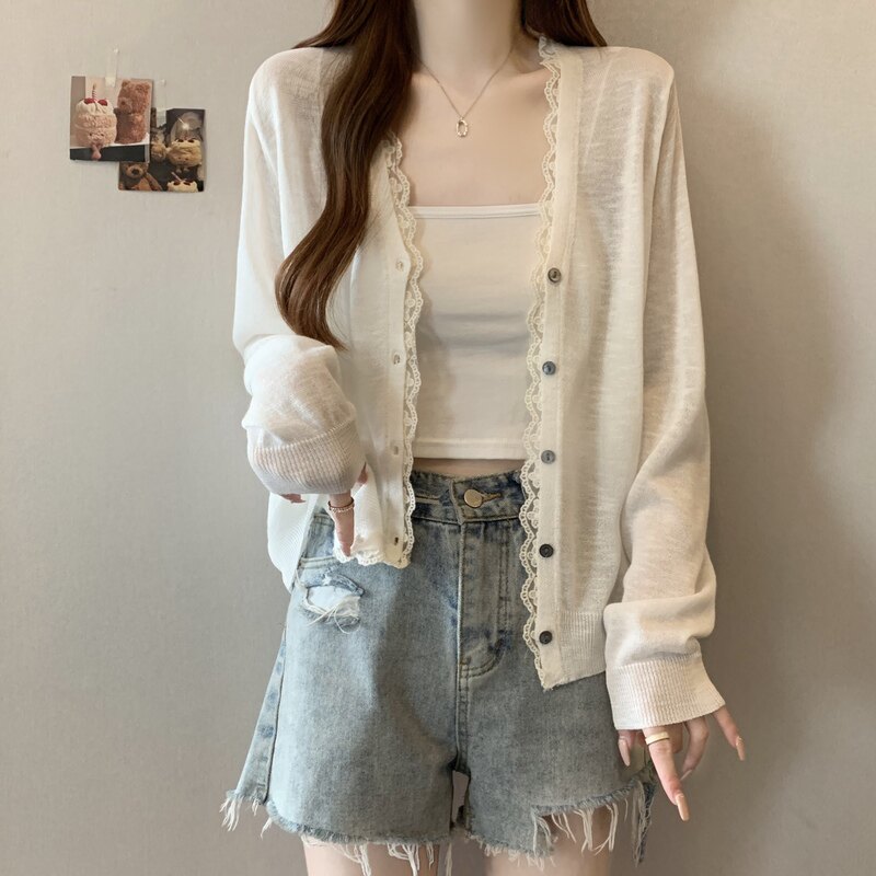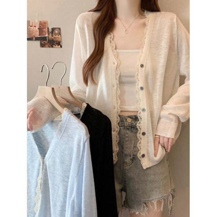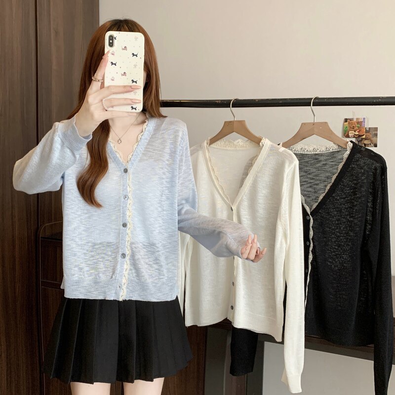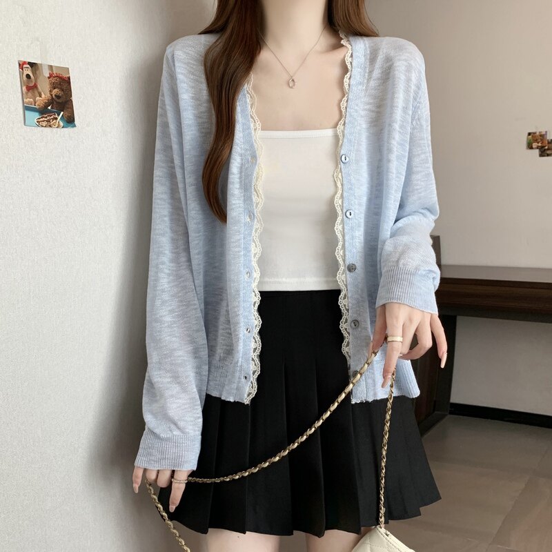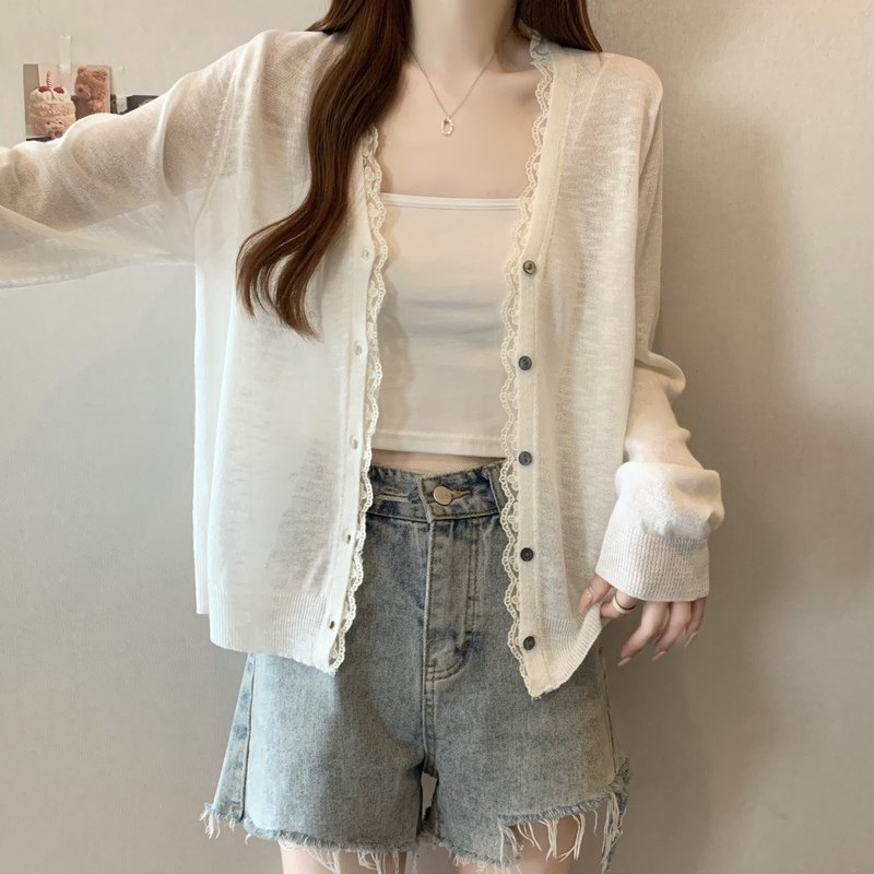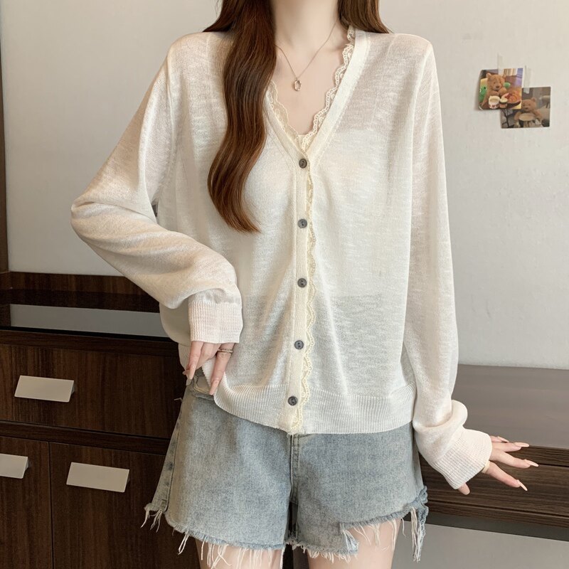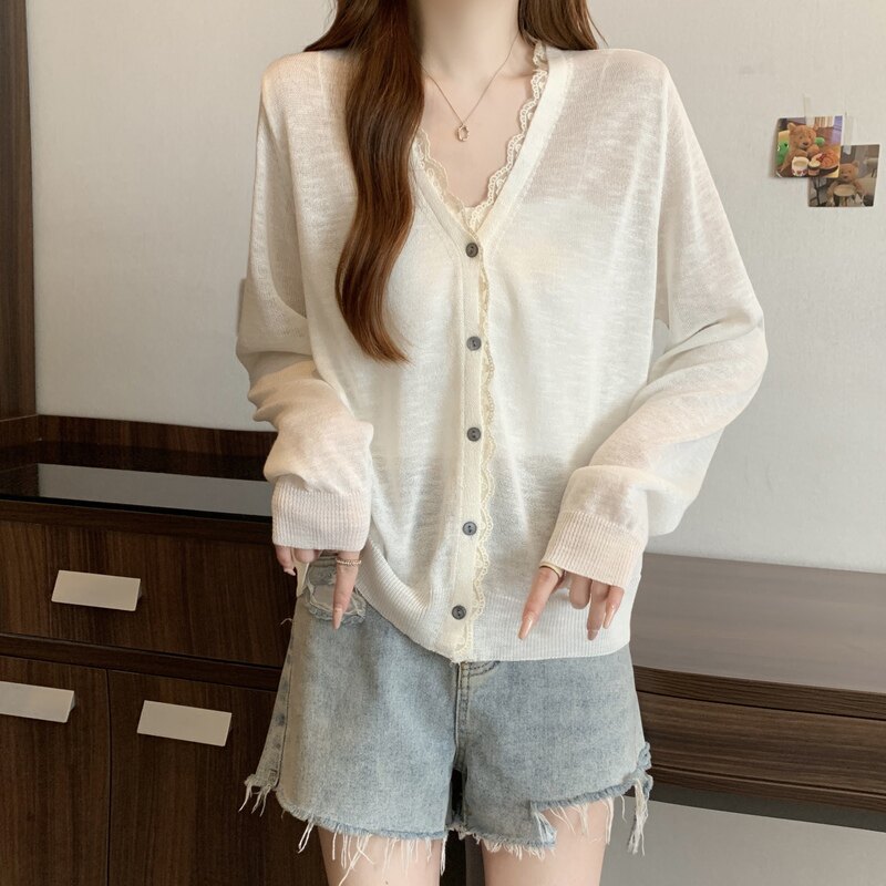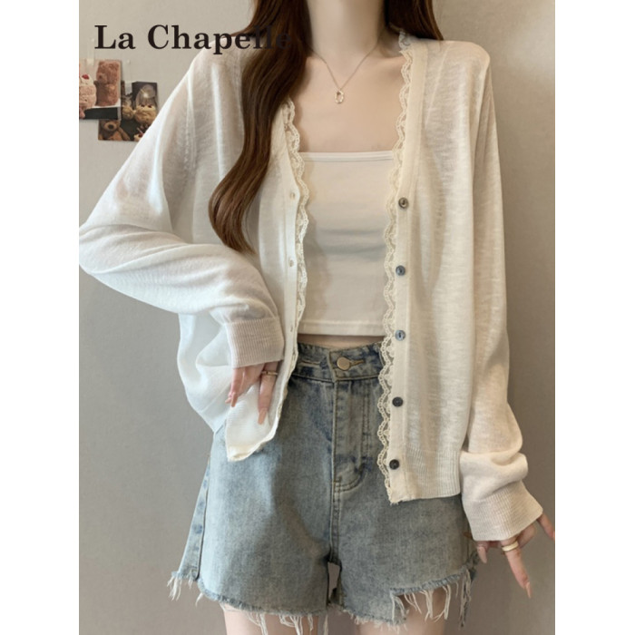 拉夏貝爾蕾絲白色防曬針織開衫女夏季2026年新款冰絲罩衫外套上衣