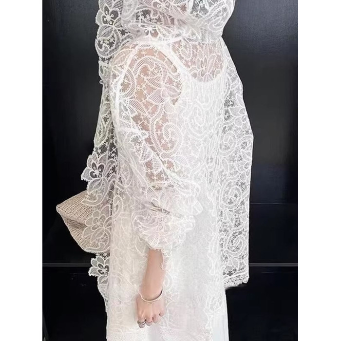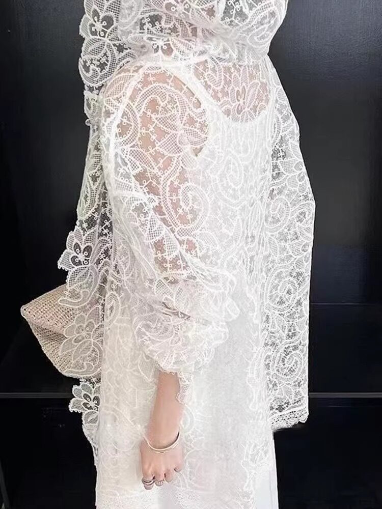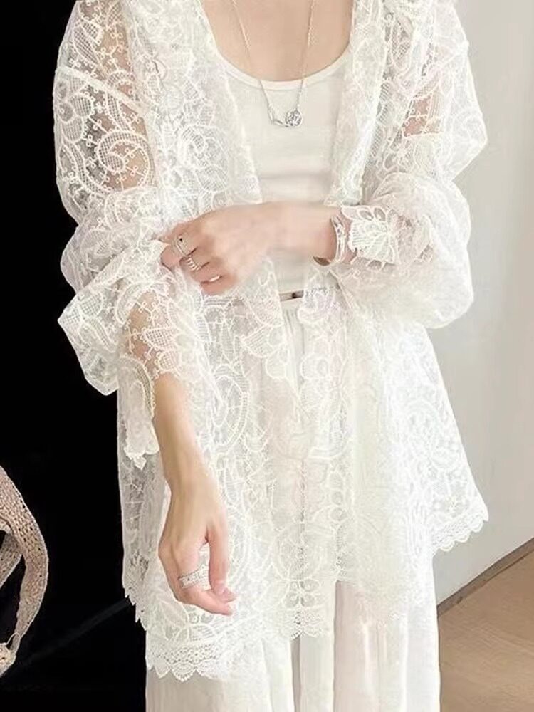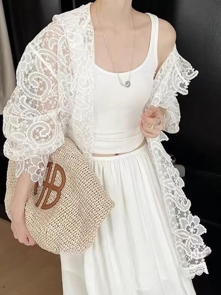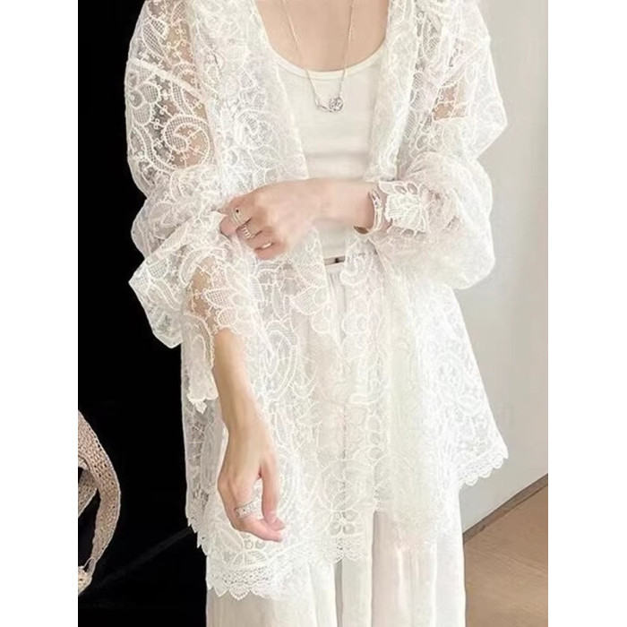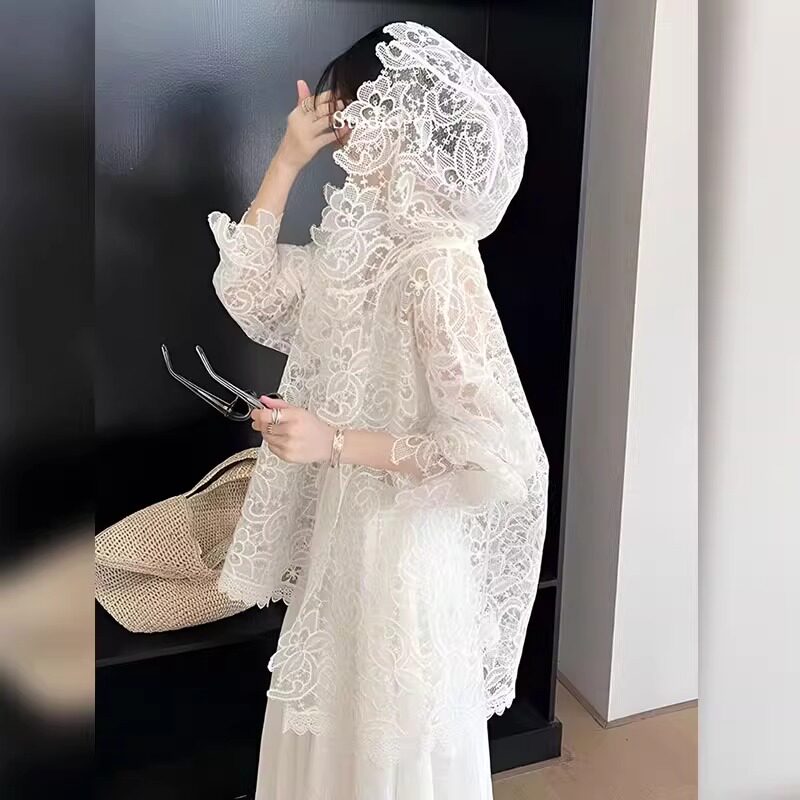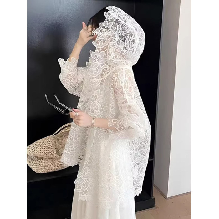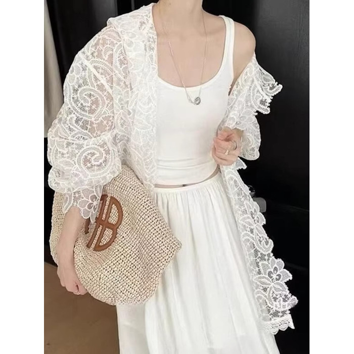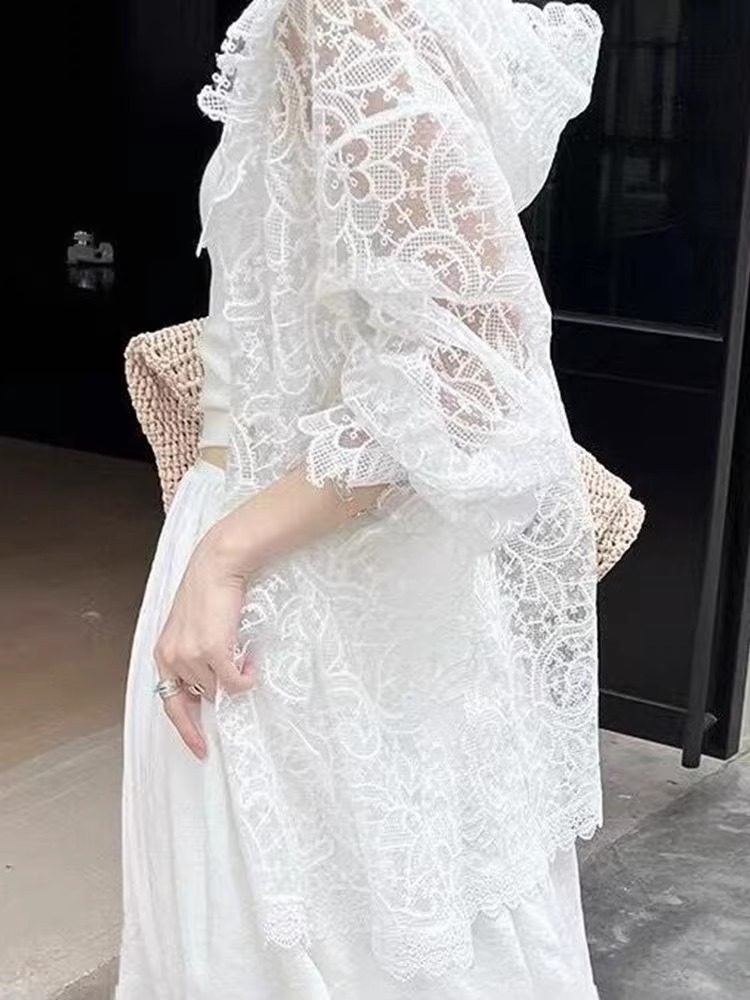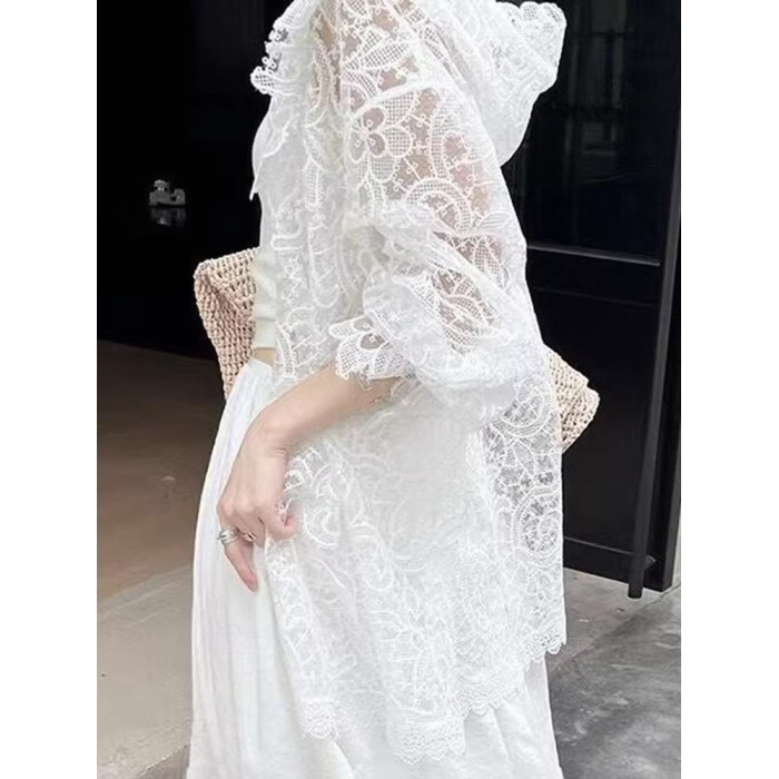 法式浪漫白色蕾絲鉤花防曬襯衫女新款洋氣微透設計顯瘦連帽上衣夏