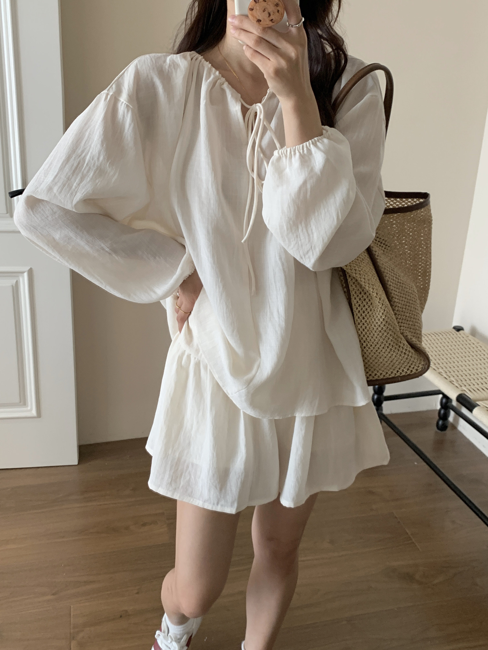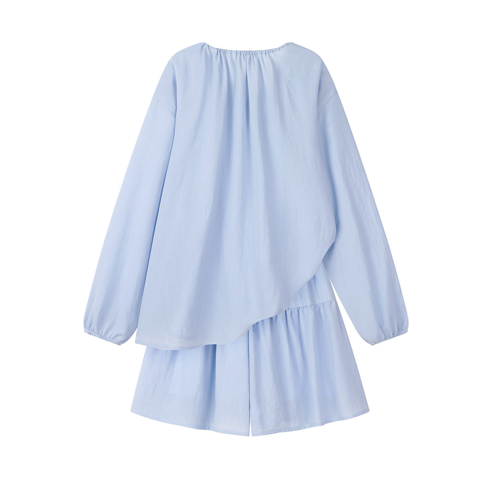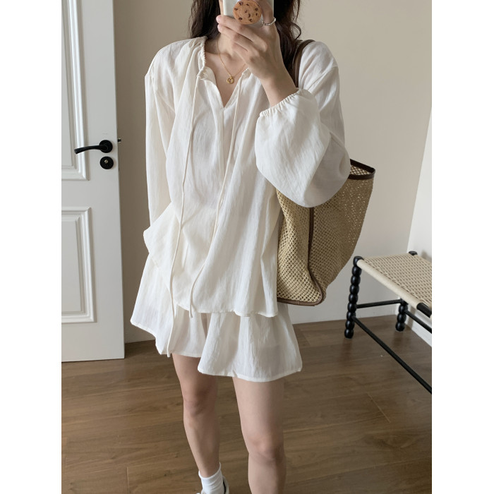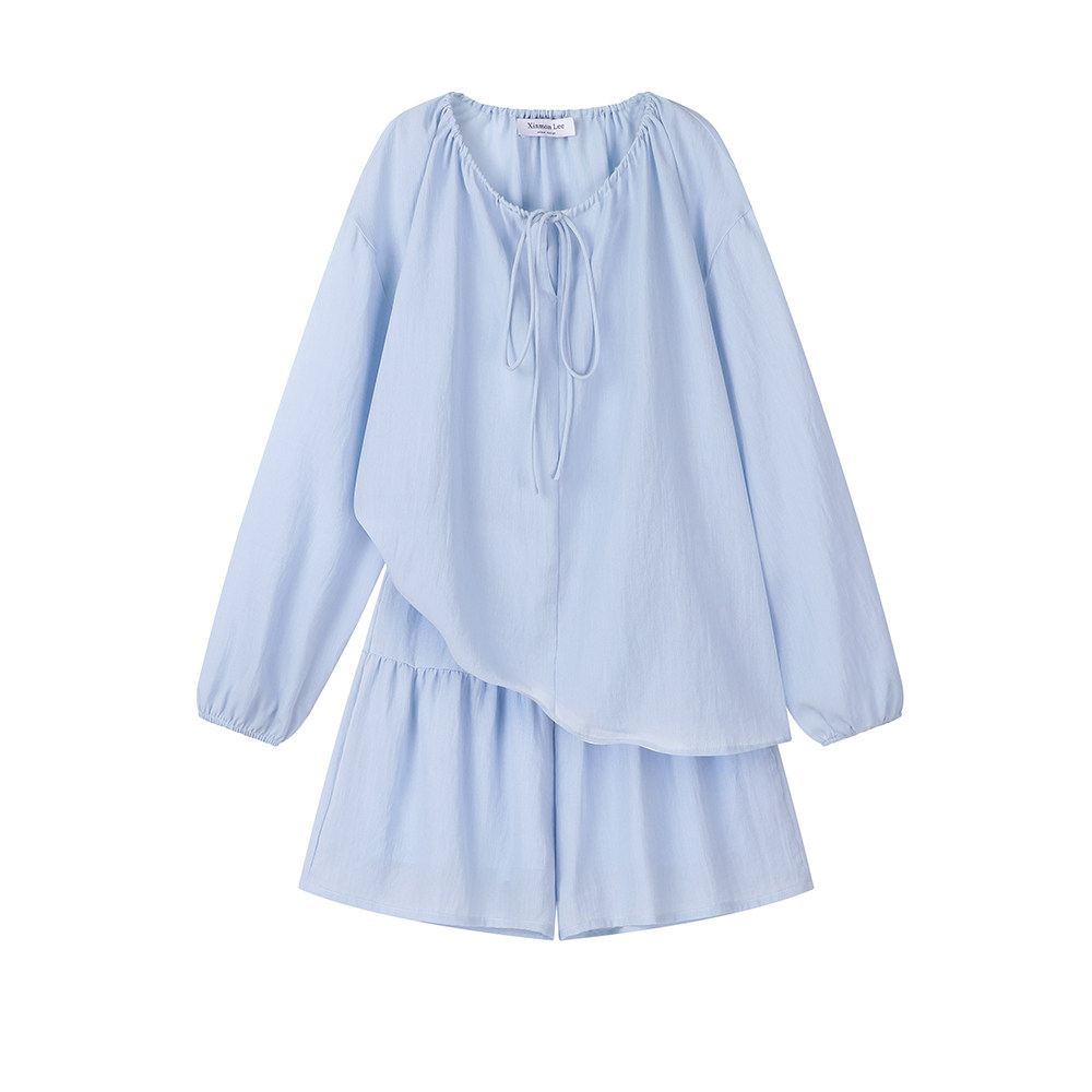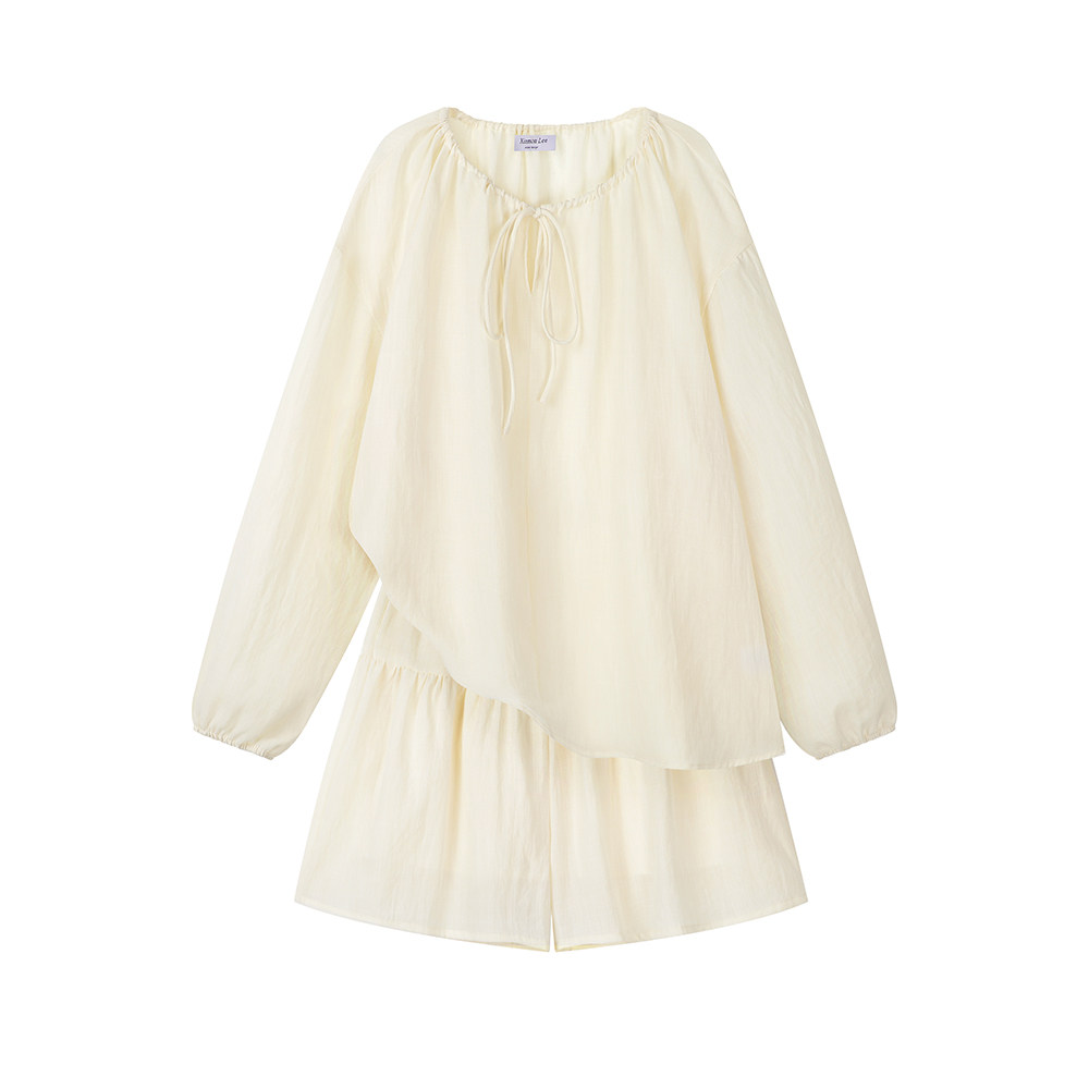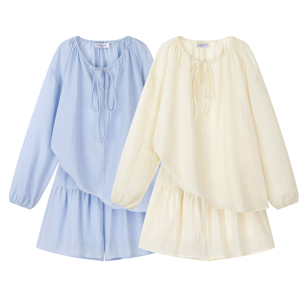 XinmonLee松弛感系帶圓領防曬上衣百搭高腰短褲輕薄舒適兩件套裝