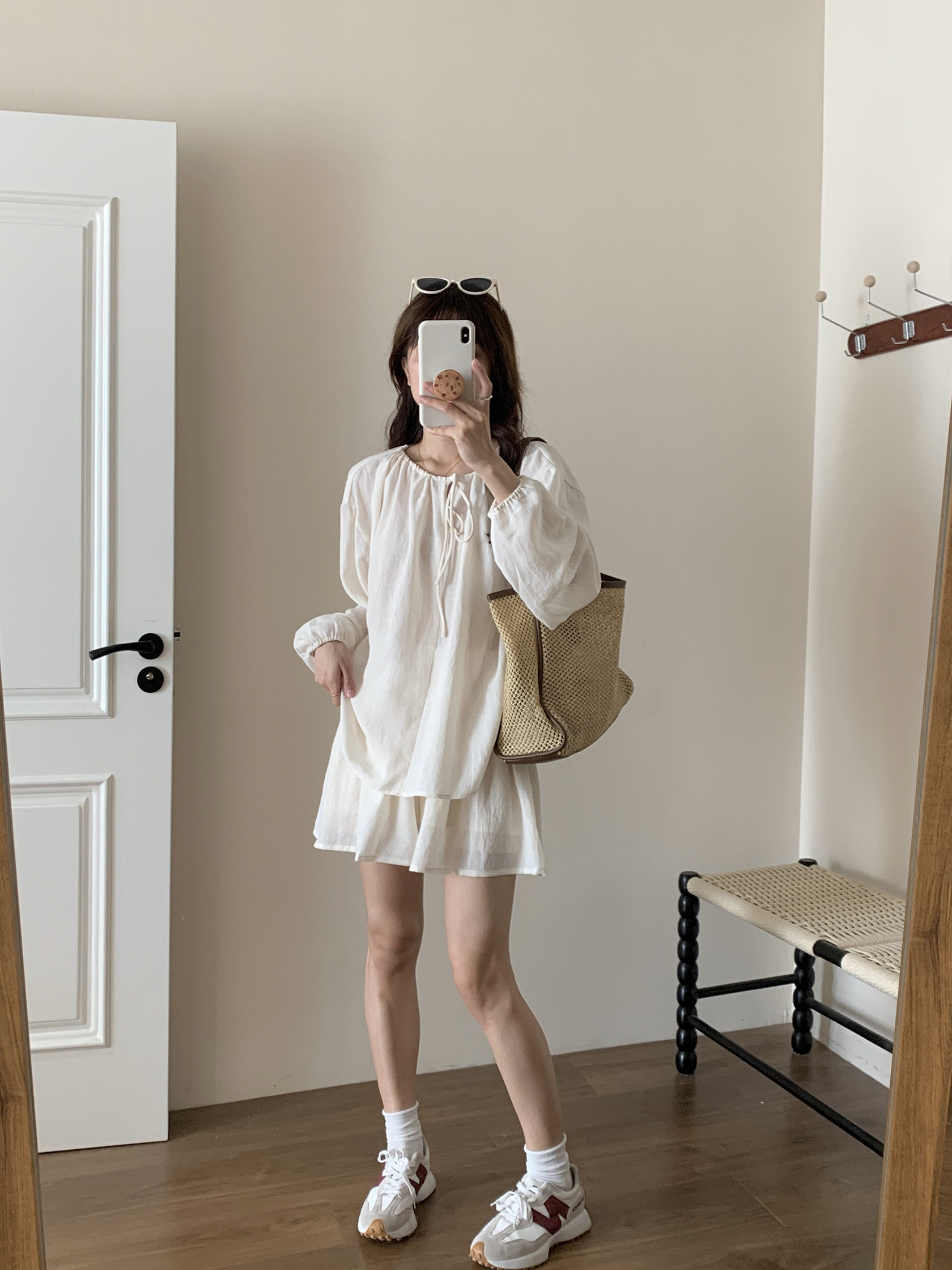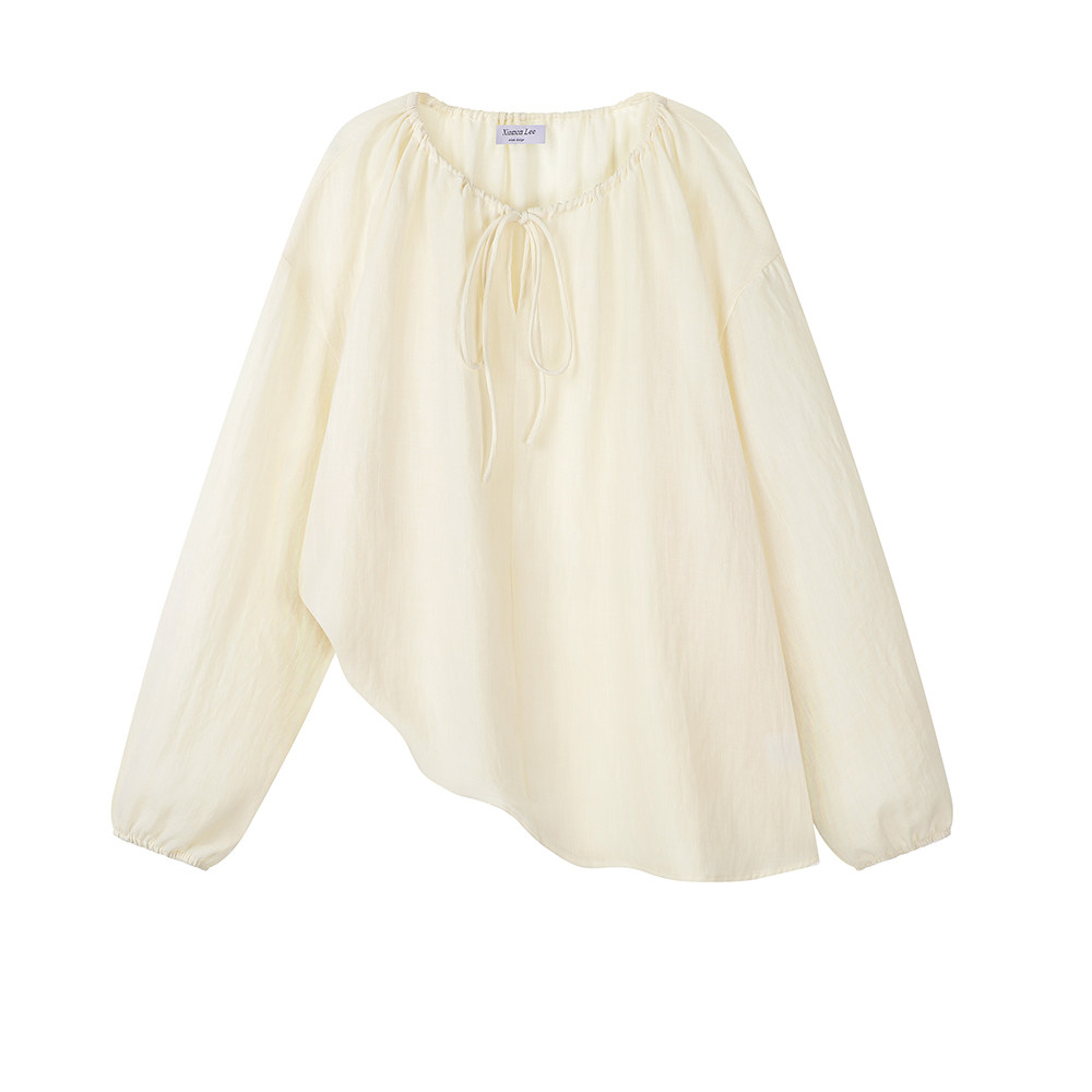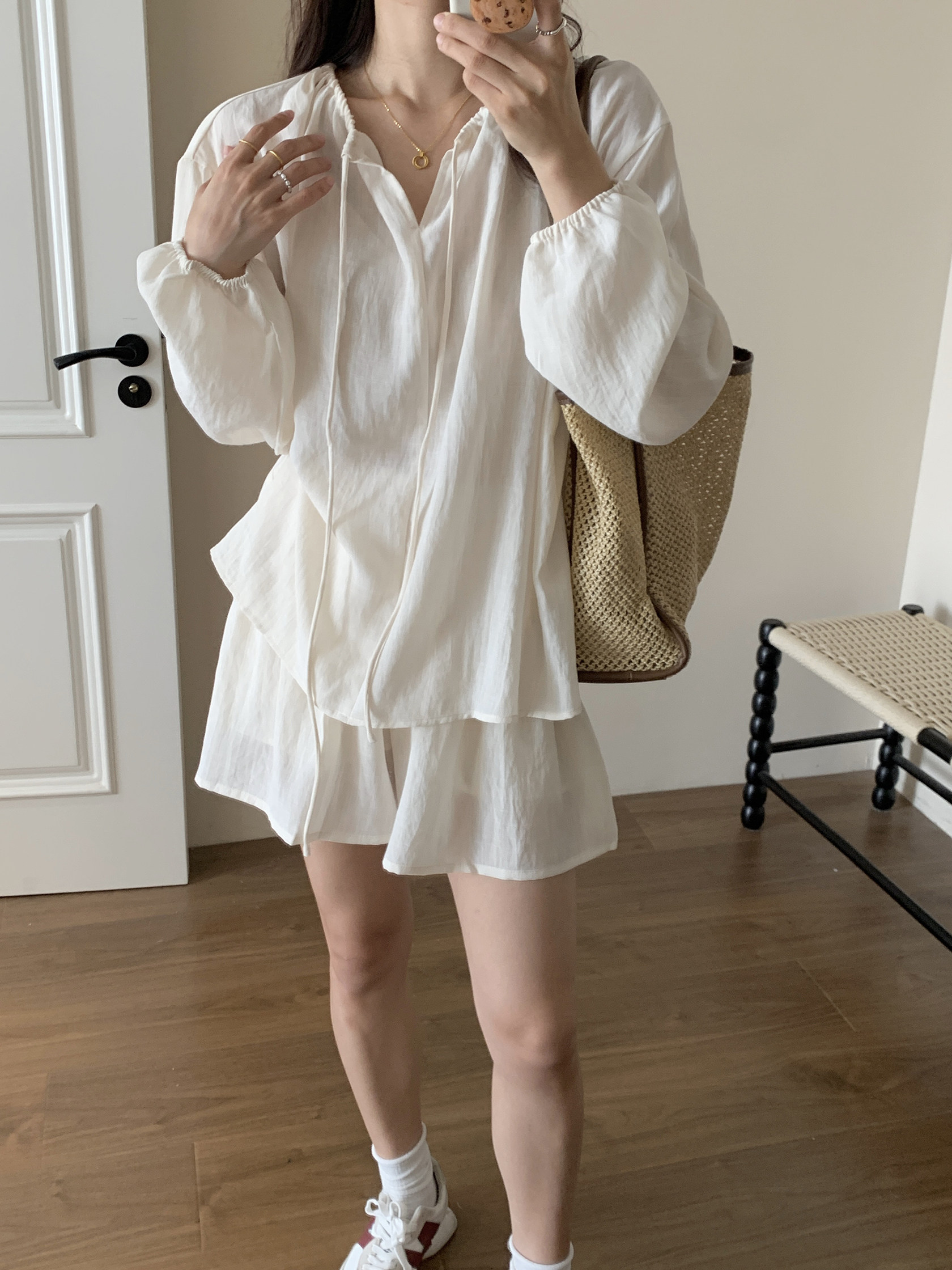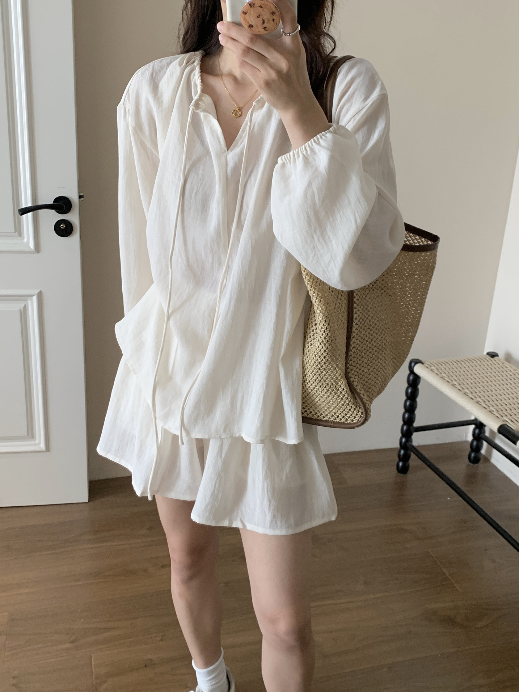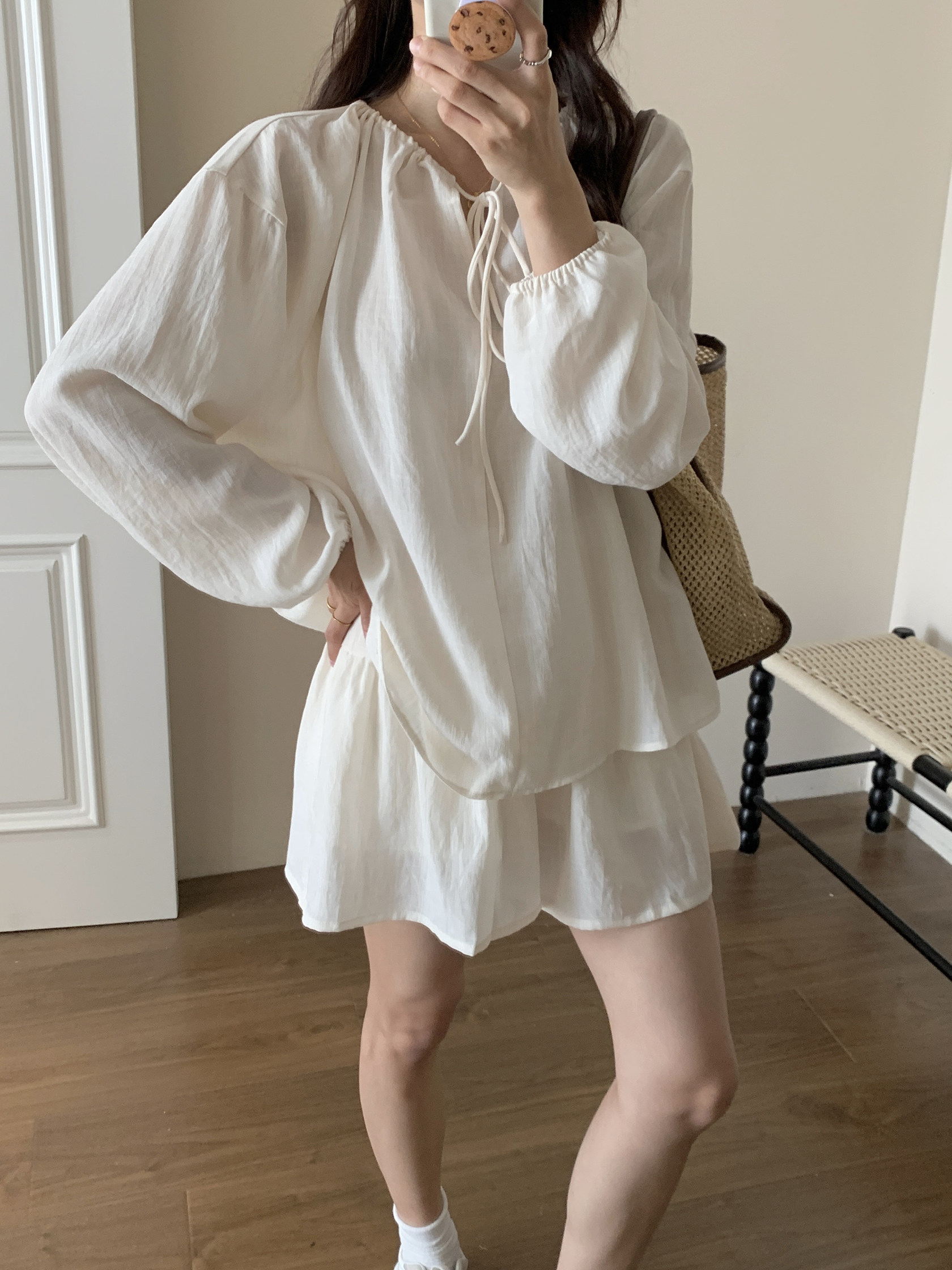 XinmonLee松弛感系帶圓領防曬上衣百搭高腰短褲輕薄舒適兩件套裝