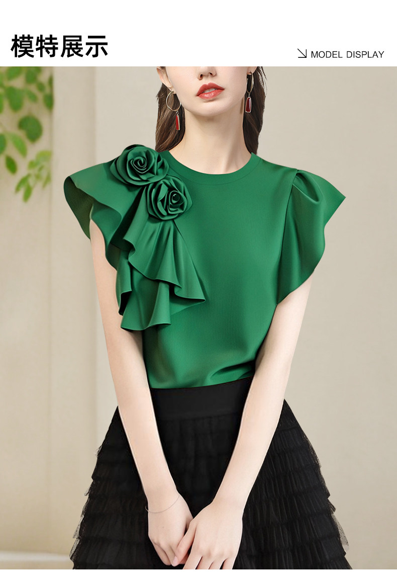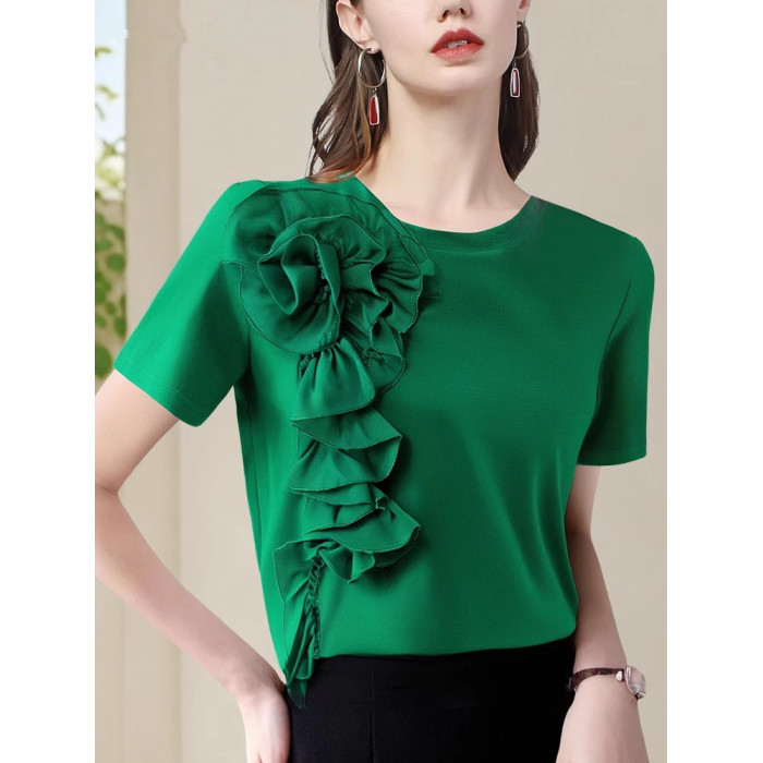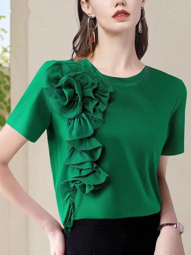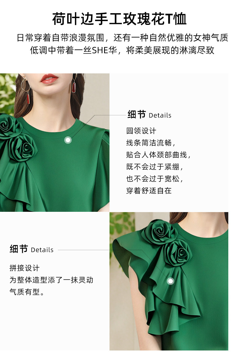 法式立體大花朵圓領 短袖T恤衫女2025夏季名媛氣質設計感小衫上衣