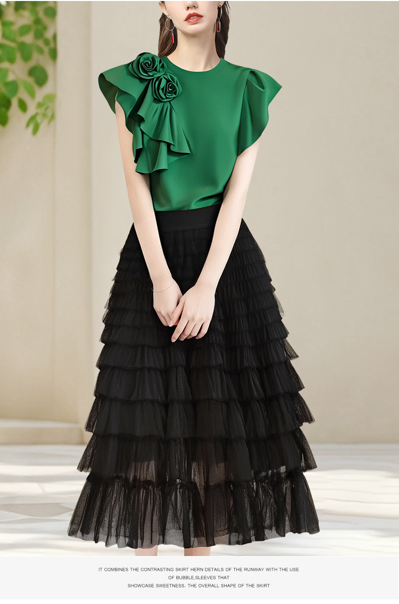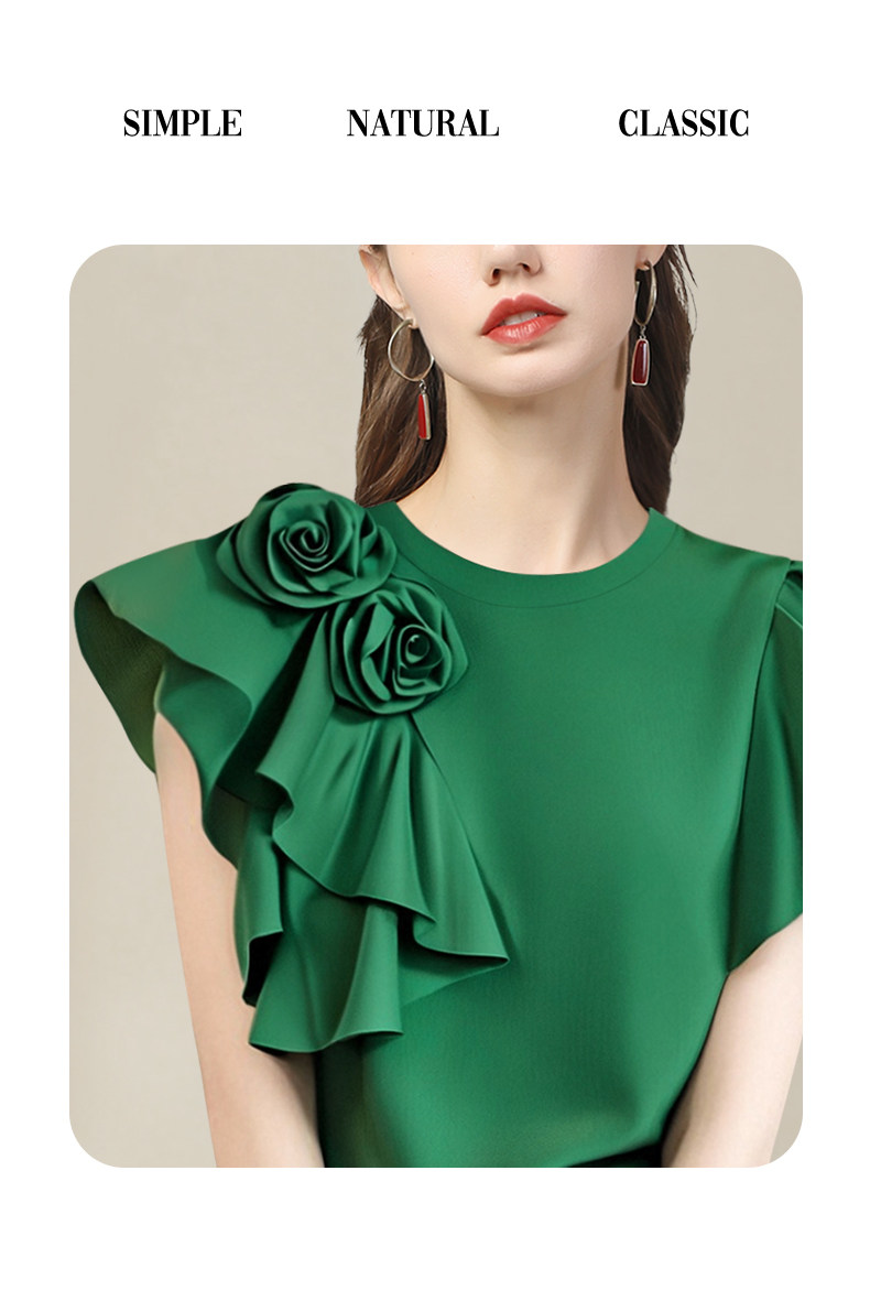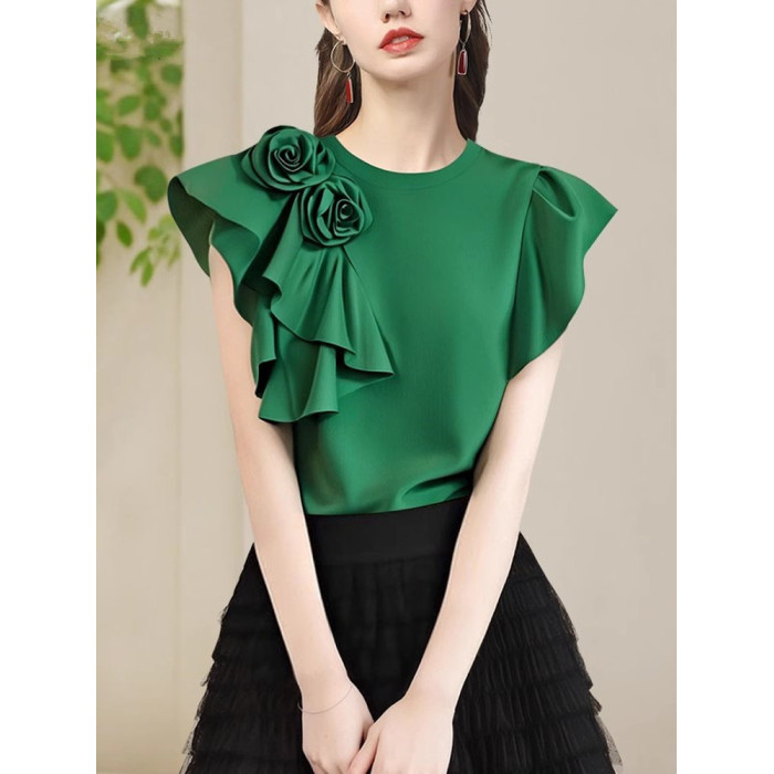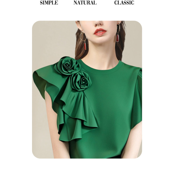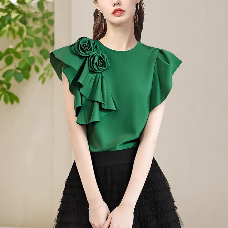 法式立體大花朵圓領 短袖T恤衫女2025夏季名媛氣質設計感小衫上衣