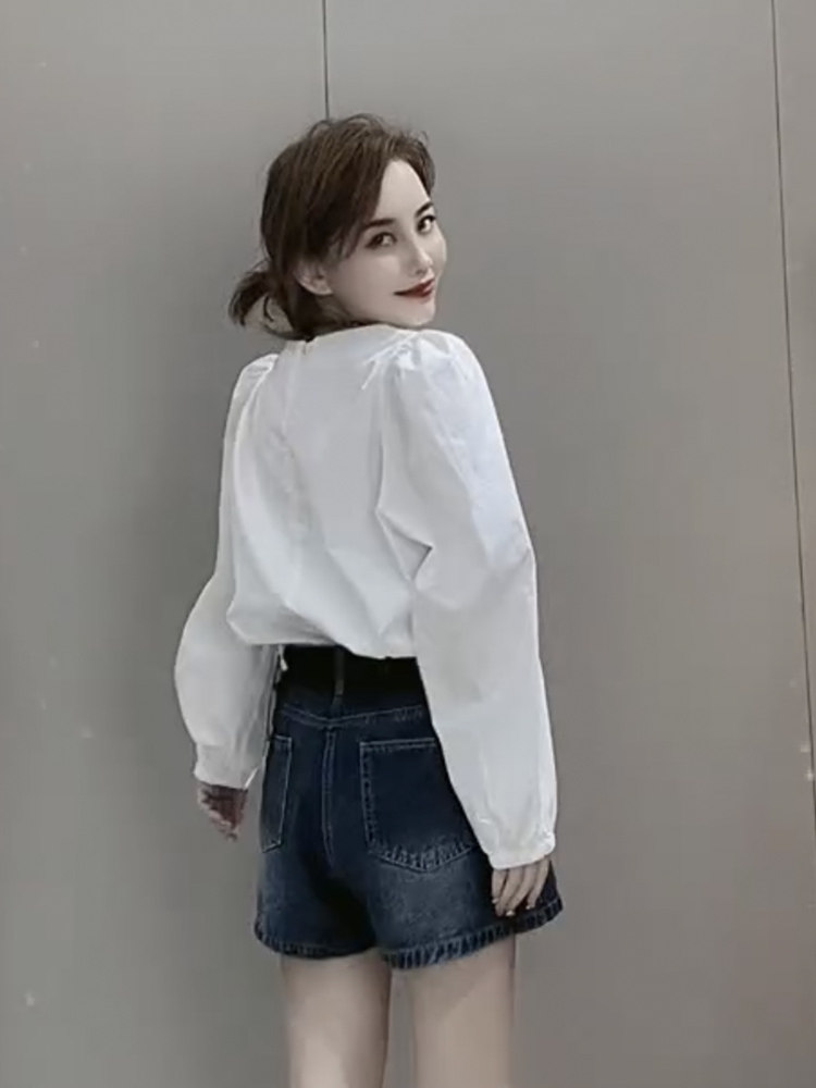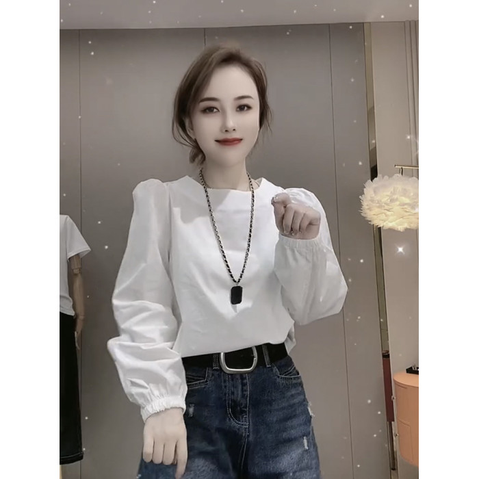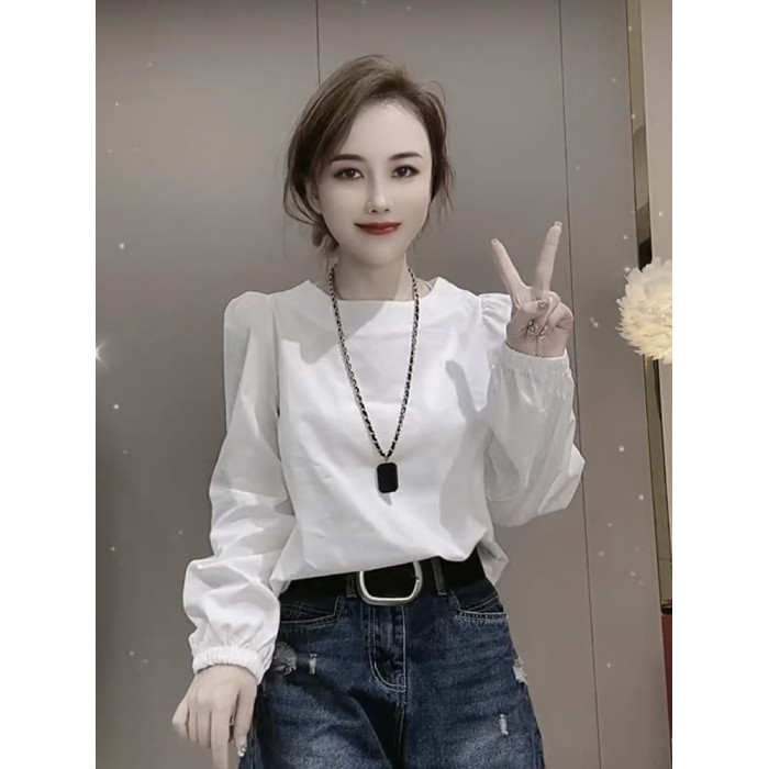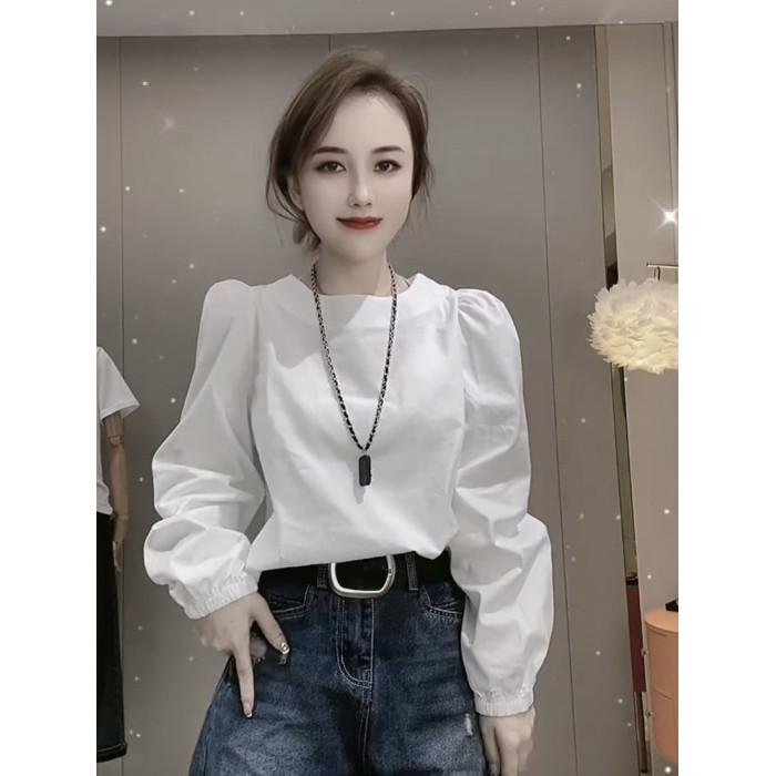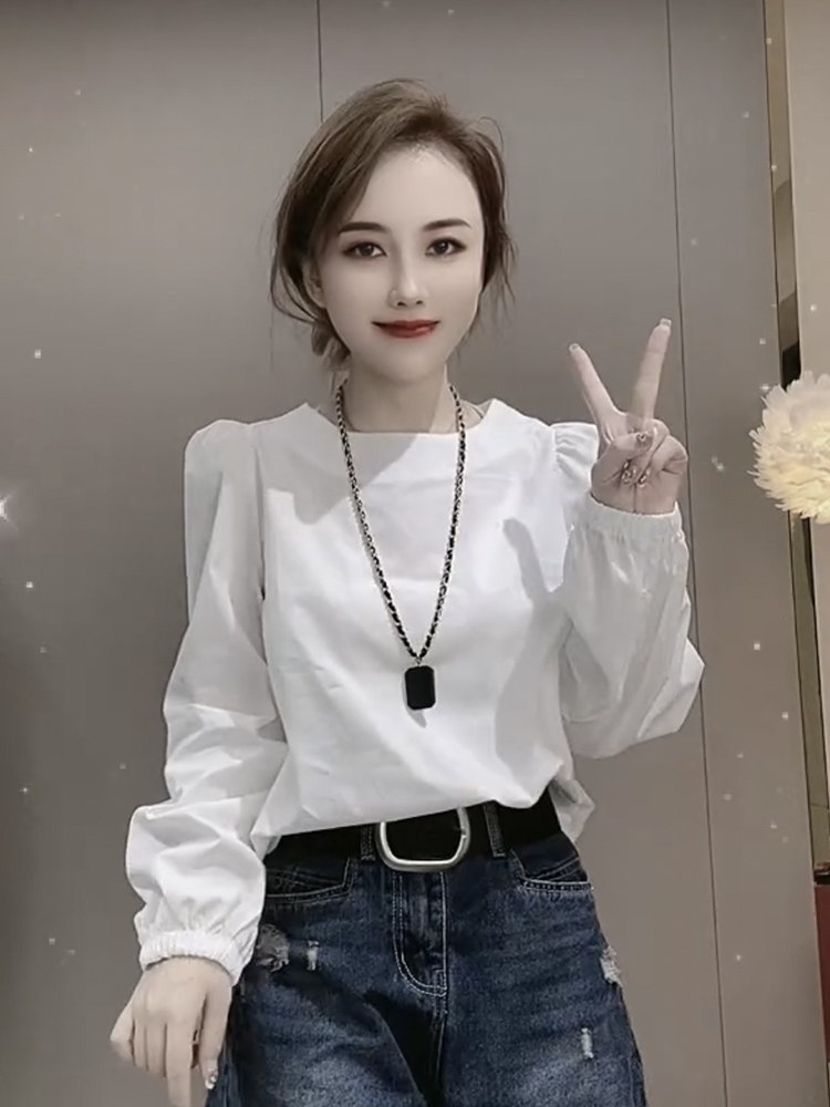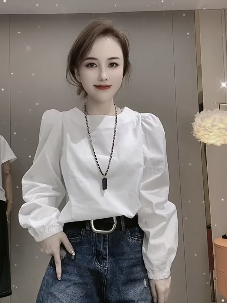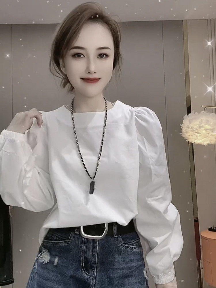 白色設計感小衆圓領長袖襯衫女2025年春秋新款寬鬆法式泡泡袖上衣