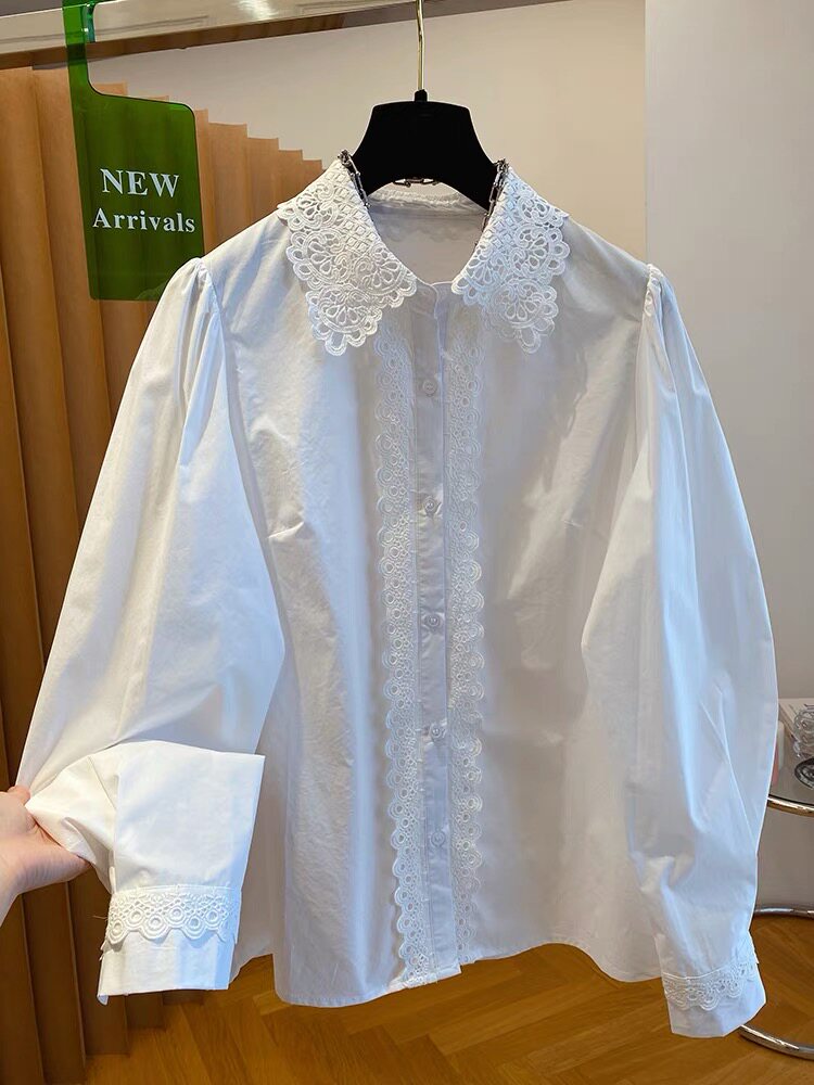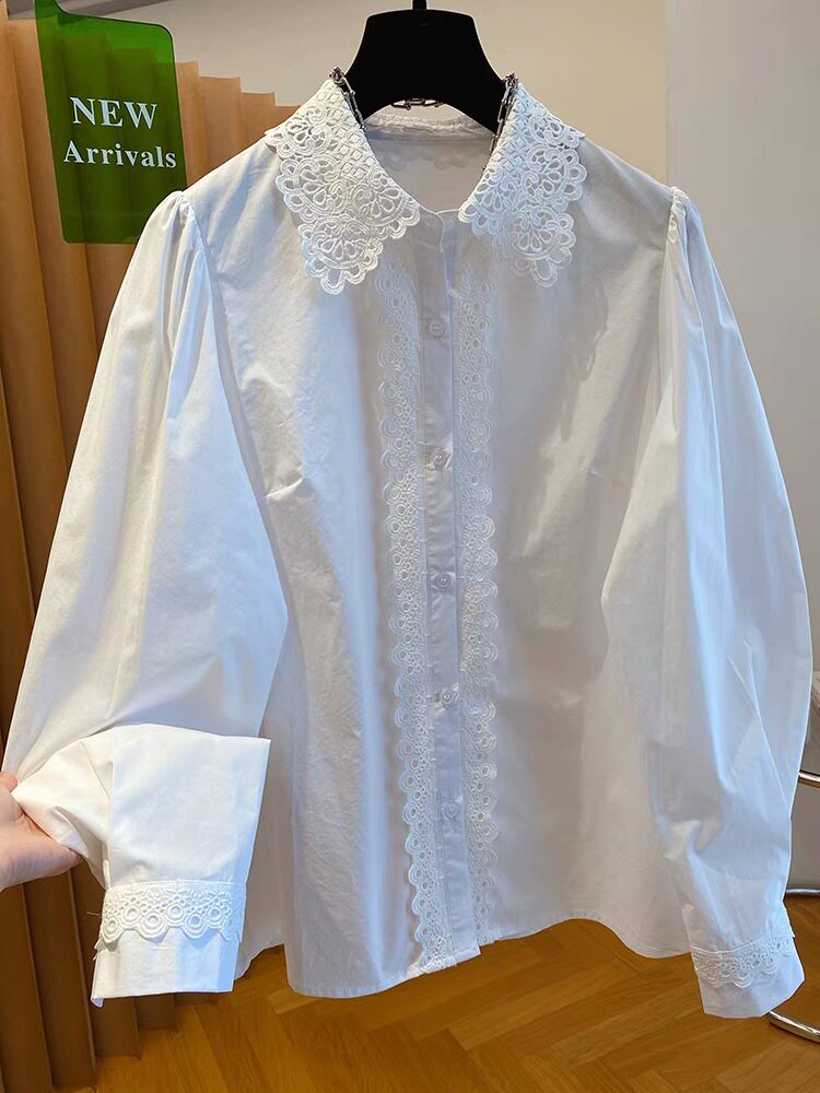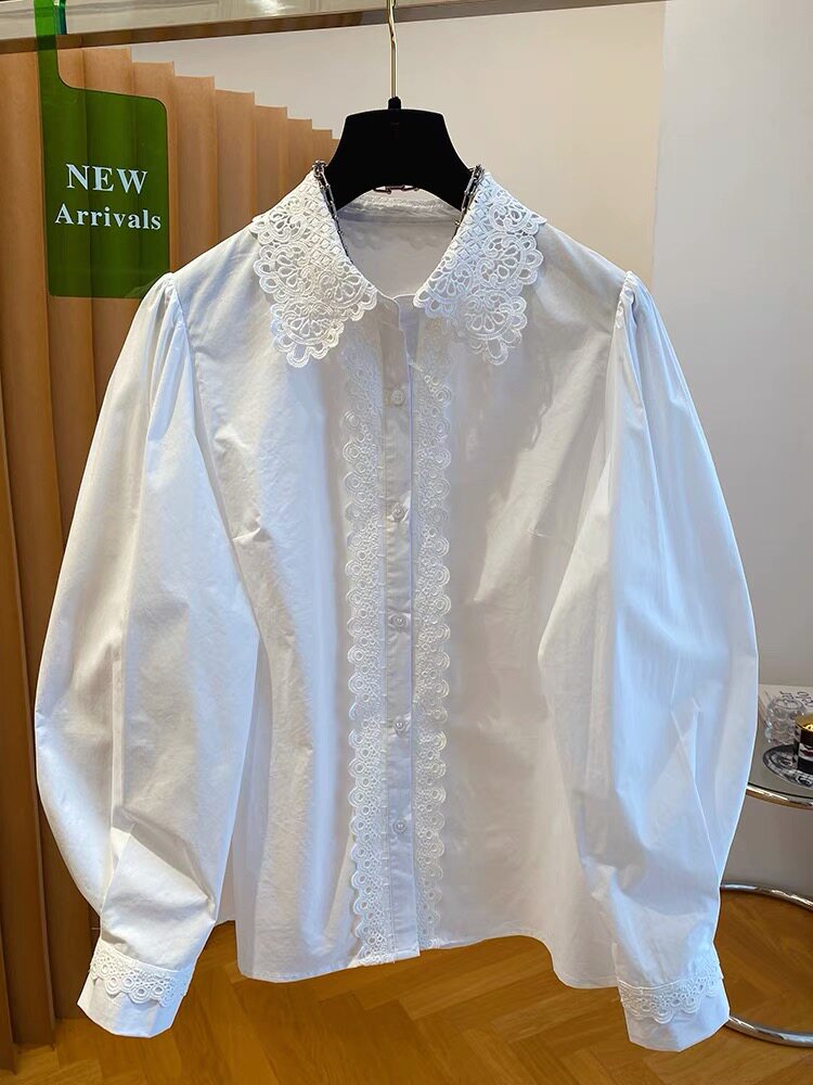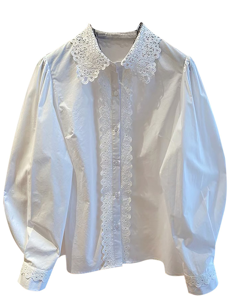 自畱款推薦~法式蕾絲花邊拼接繙領襯衫女2025春新款寬鬆白色上衣